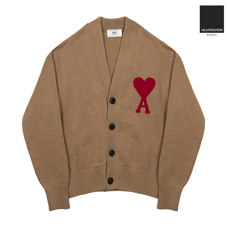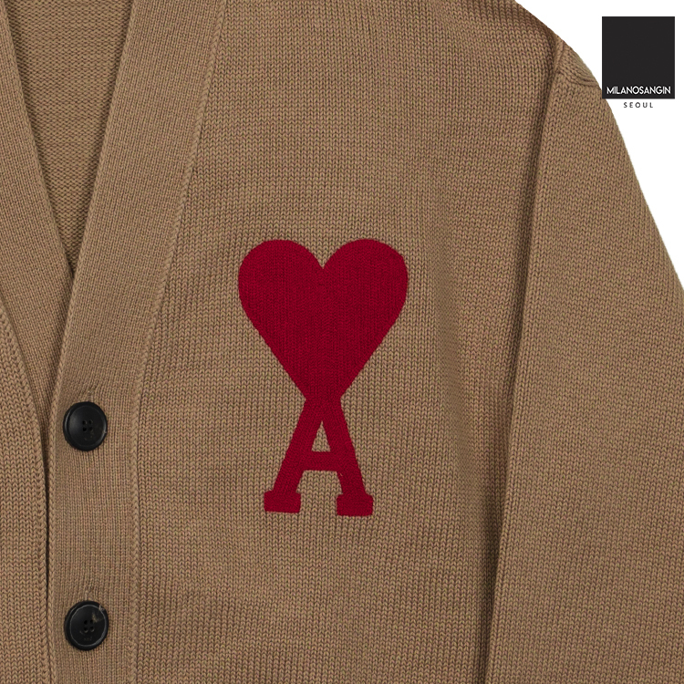 An oversized men's cardigan by AMI Paris, smart yet casual apparel arrives in light beige jersey stitch fabric with a large-scale contrasting red Ami de Coeur chain-stitch embroidery at the left chest and black corozo buttons through the front.