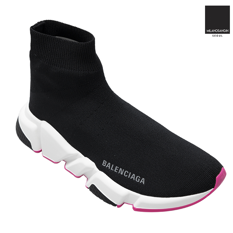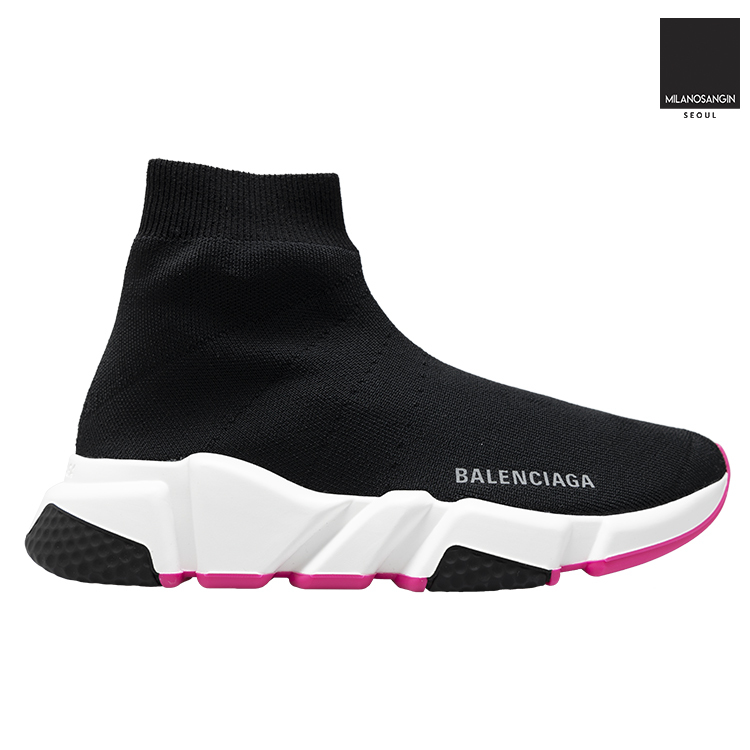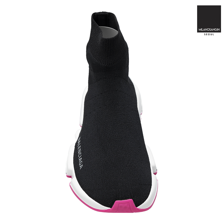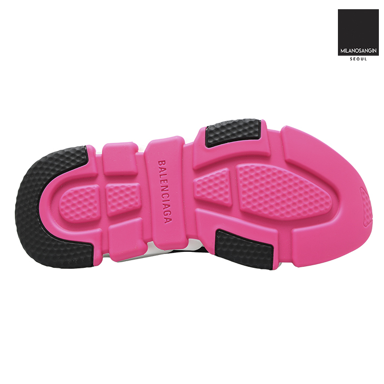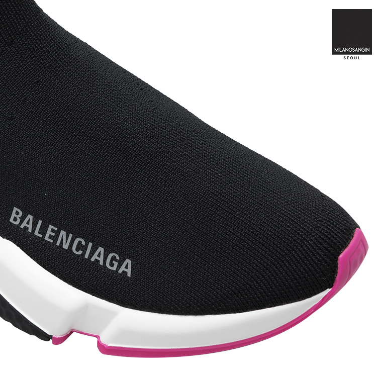 Balenciaga's Speed Sneakers have become a cult-favourite shape, this version is in an ultra-light design, coming in at just 240g to provide an almost barefoot feel. They have a black technical rib-knit upper with a tighter knit to the top band and grey embossed Balenciaga lettering to the outer side. The contrasting bright white sole has an ultra-flexible moulded finish and features black and fluorescent pink inserts and debossed brand lettering at the back.