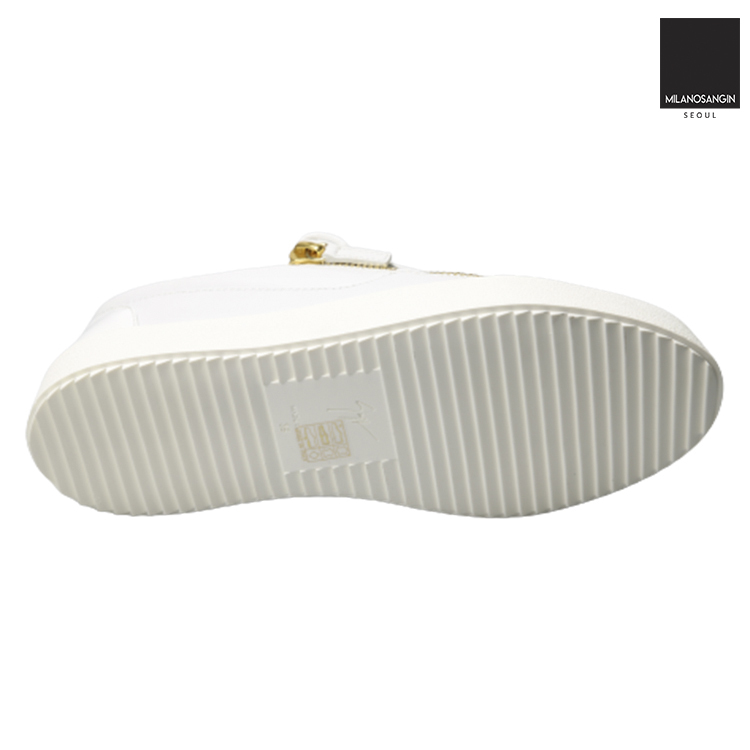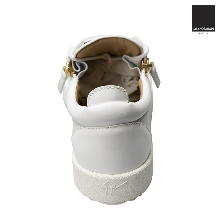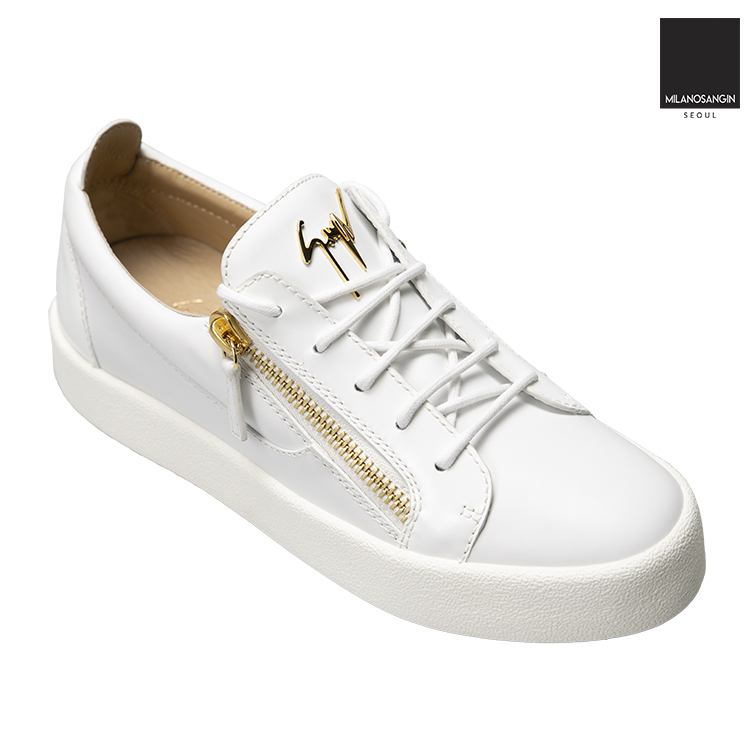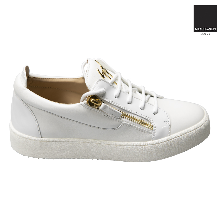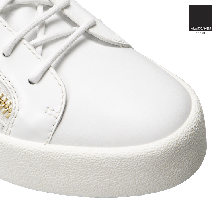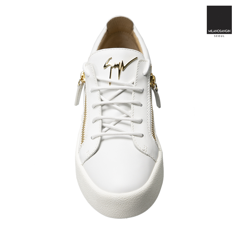 White leather Frankie low-top sneakers from Giuseppe Zanotti featuring a round toe, a lace fastening, side zip fastenings, a brand embossed insole, a padded ankle, a white rubber sole and a gold-tone logo plaque.