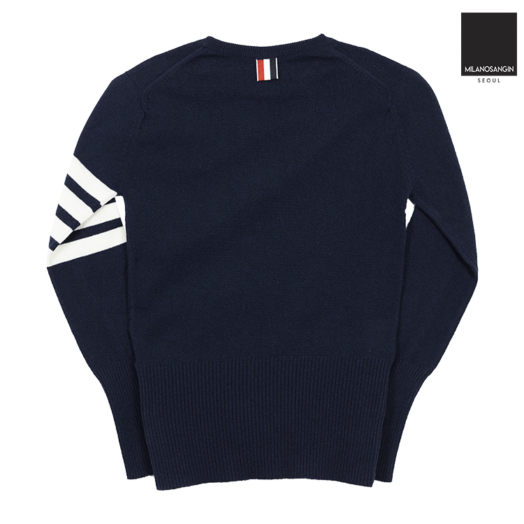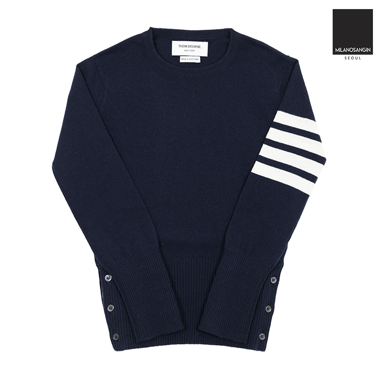 Are you a fan of Thom Browne's classics? Then this navy blue signature 4-Bar stripe jumper is one to add to the collection. Plus in cashmere, it's beautifully soft too! Featuring a ribbed crew neck, long sleeves, button cuffs, a ribbed hem and cuffs, 4-bar stripes at the sleeve, red, white and blue grosgrain detailing and back yoke tab and side buttoned slits.