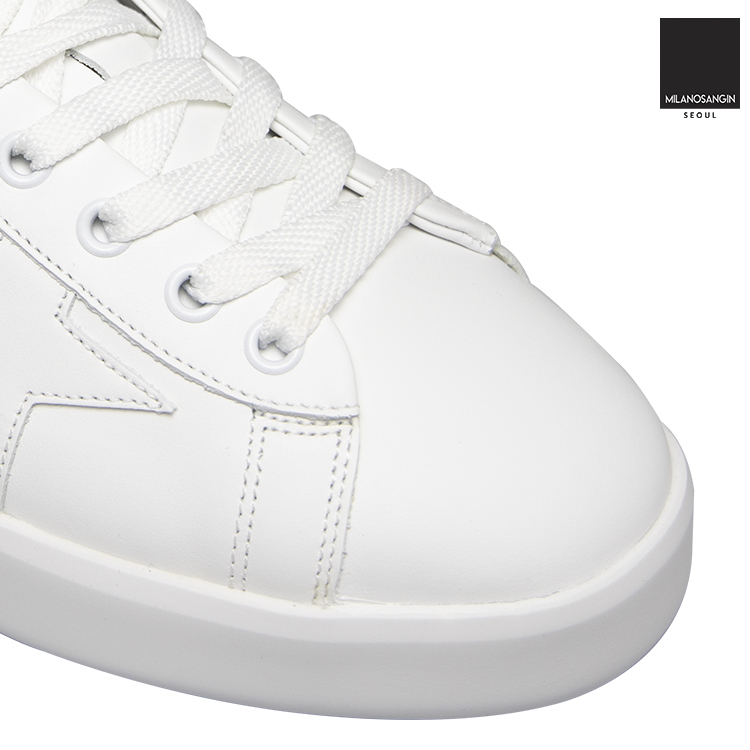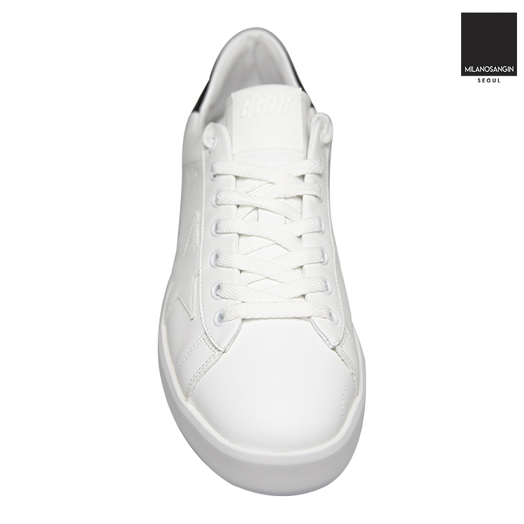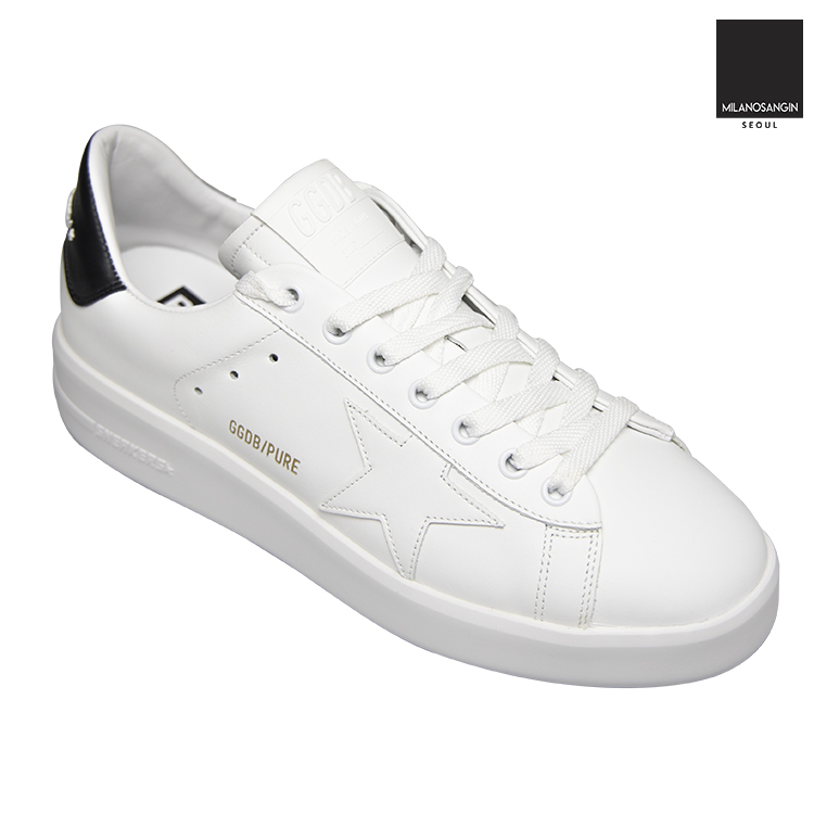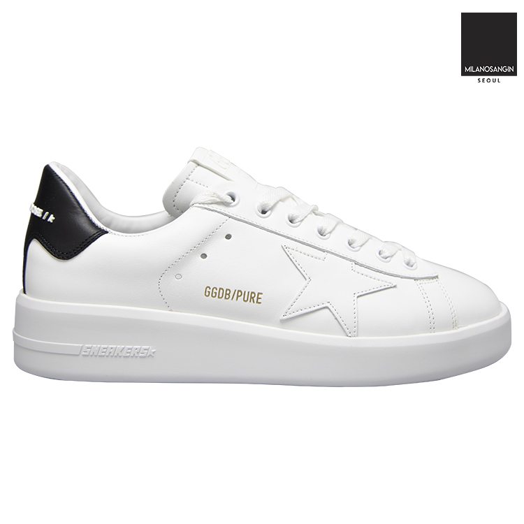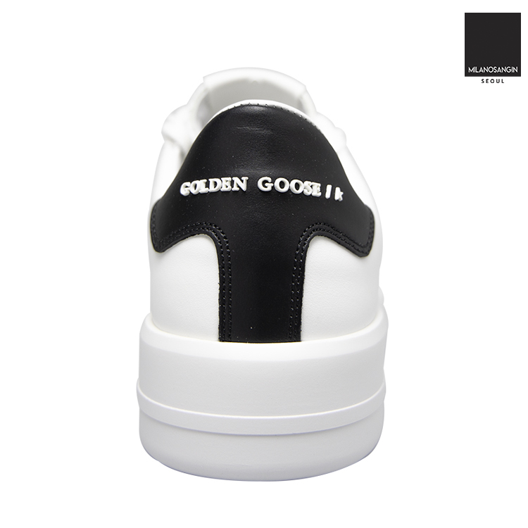 White "Pure" sneakers from Golden Goose. Crafted from leather, this lace-up pair sits on a white rubber sole and features a black insert wielding a tactile white logo applique on the heel counter.