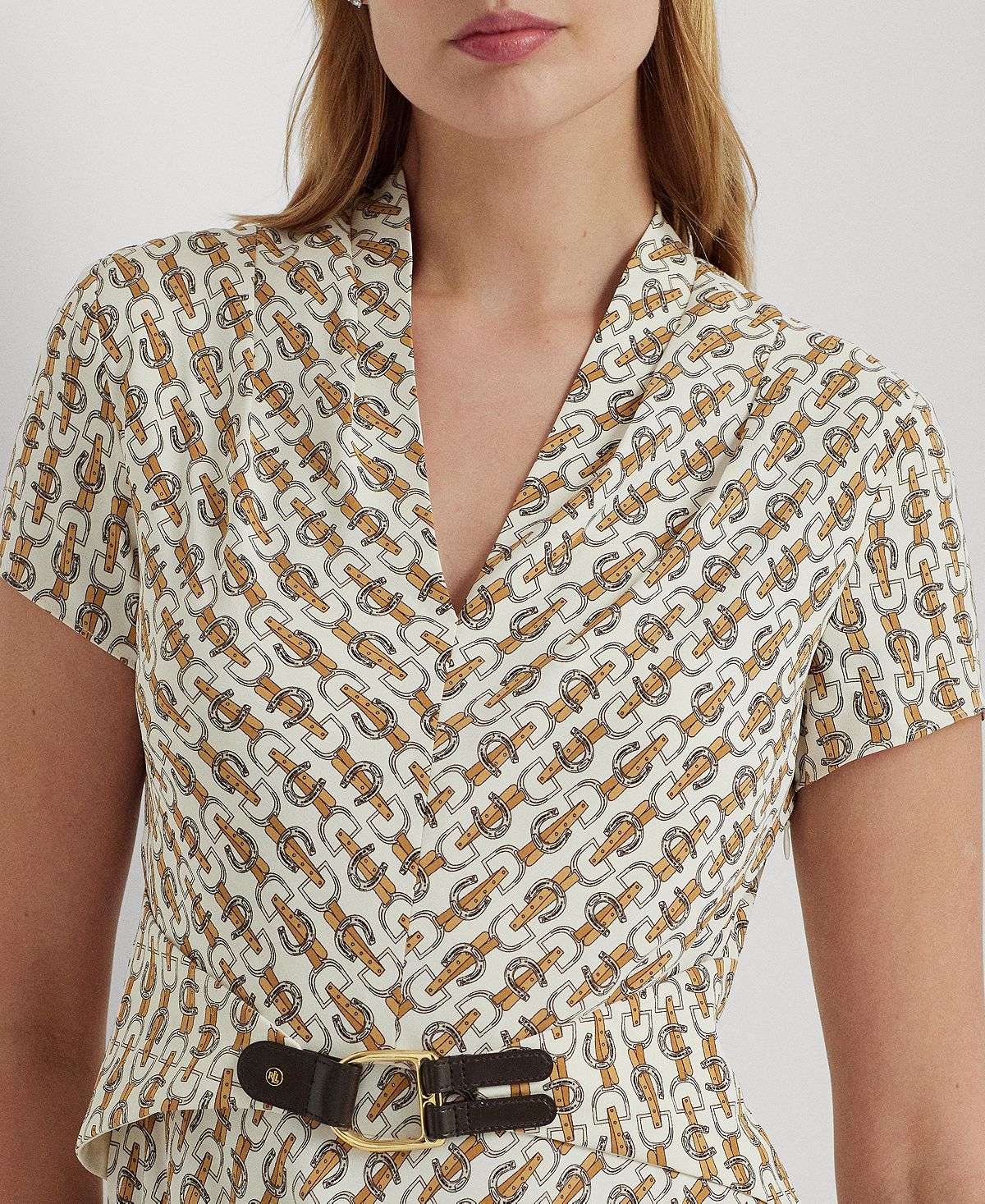 Self-extended panels gather into a faux-leather buckled tab at the center front of the waist