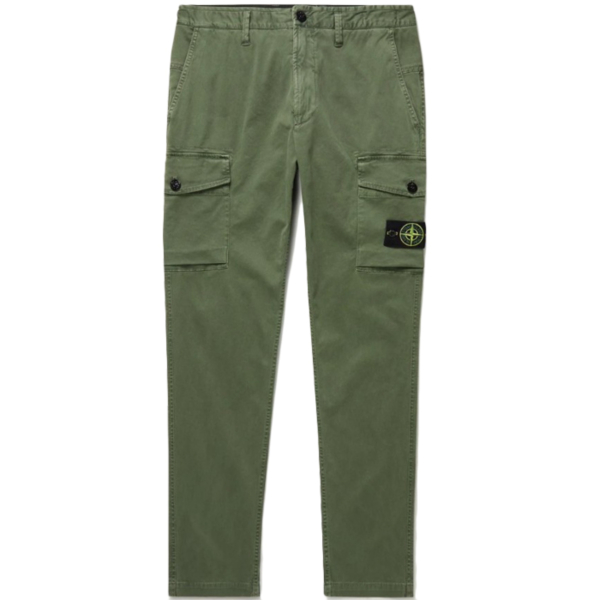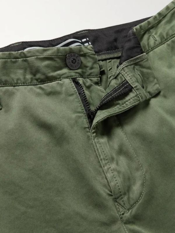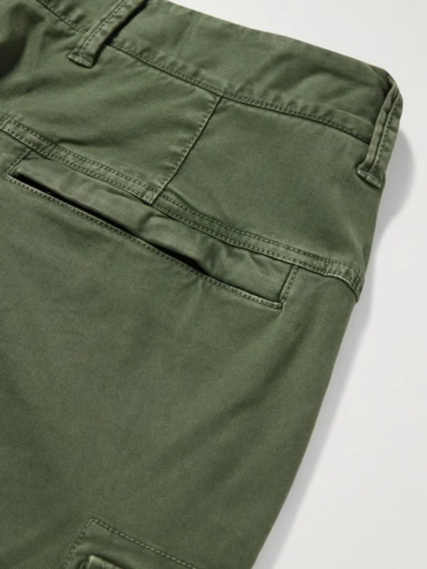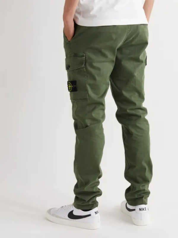 Belt loops, two front slash pockets, two side buttoned cargo pockets, back snap-fastening welt pocket, back zipped welt pocket, detachable designer emblem