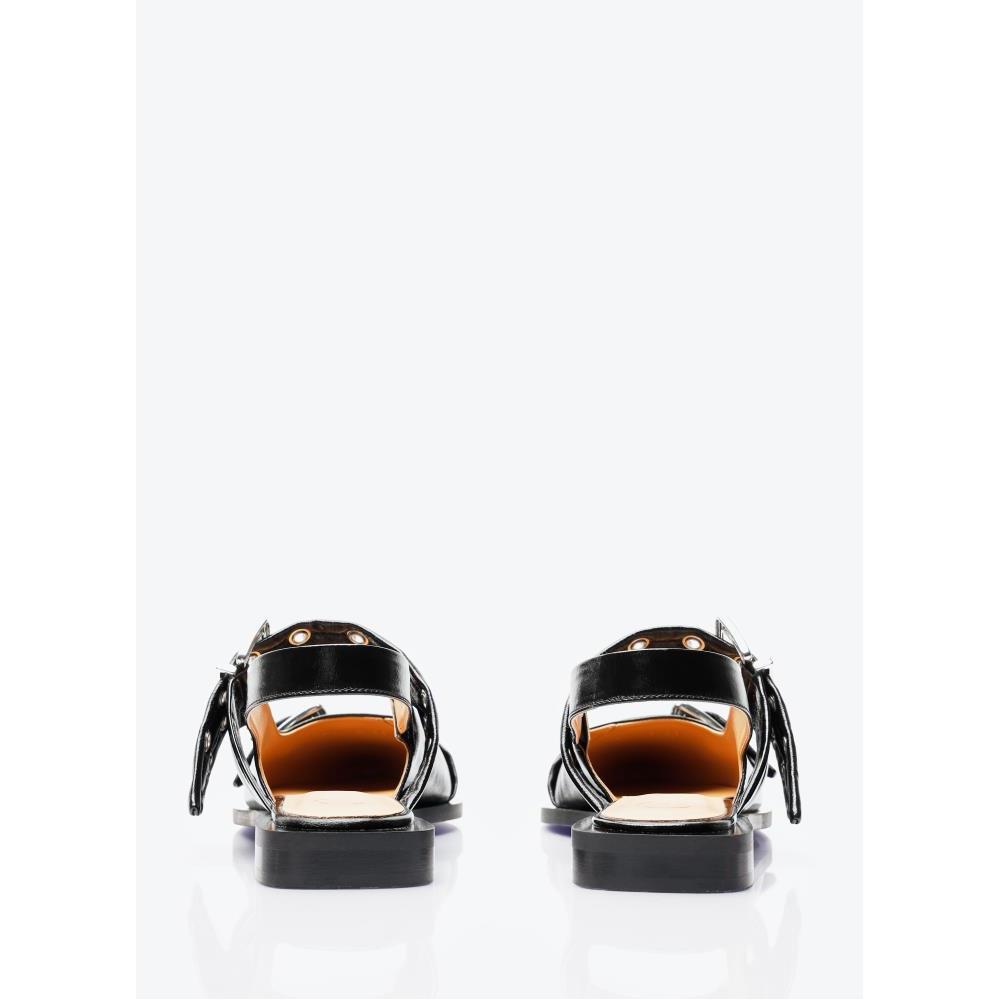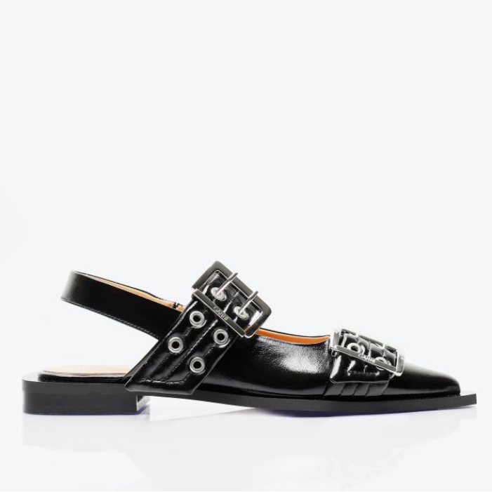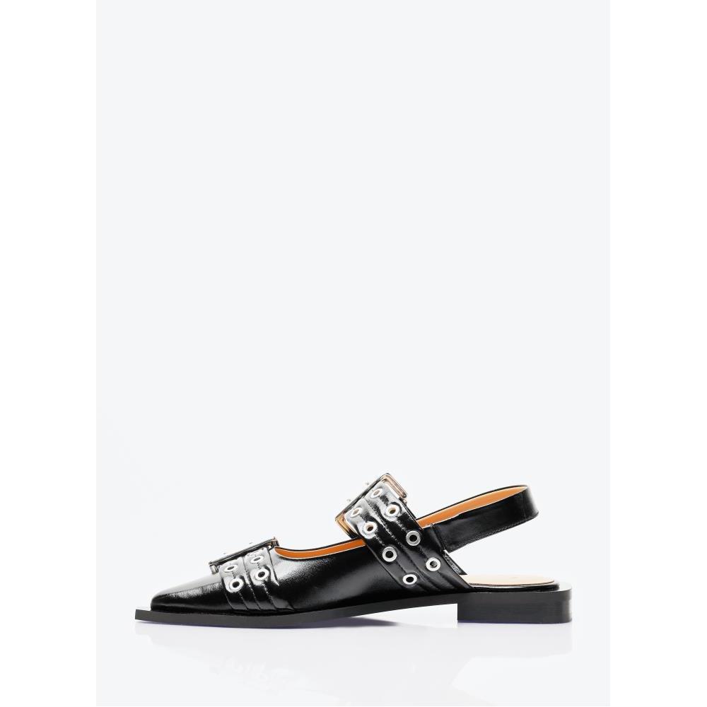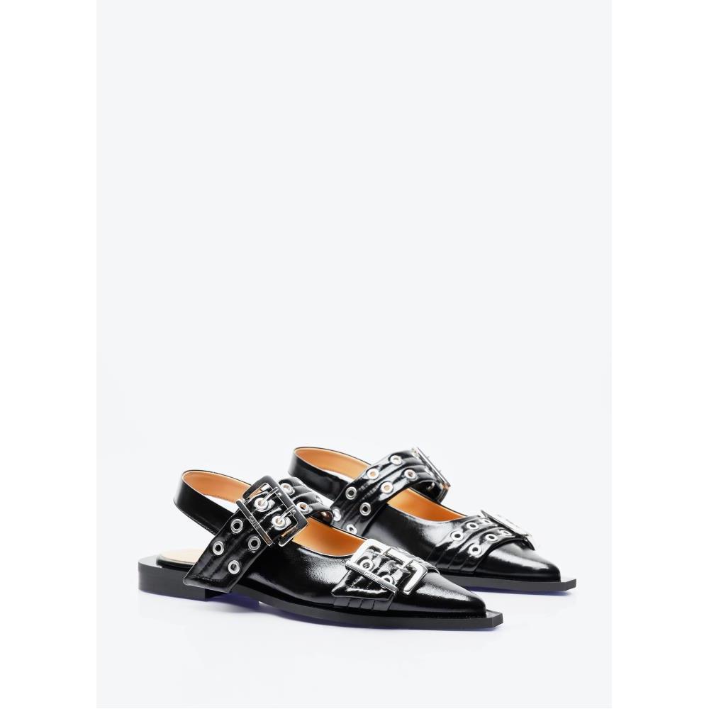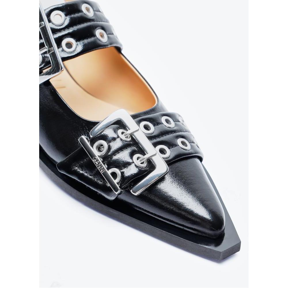 Feminine buckle ballerina flats in high shine finish.
