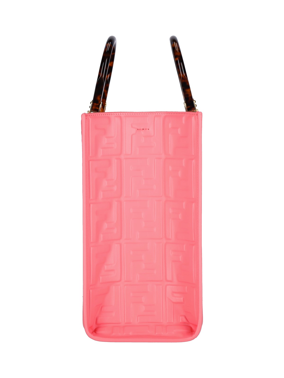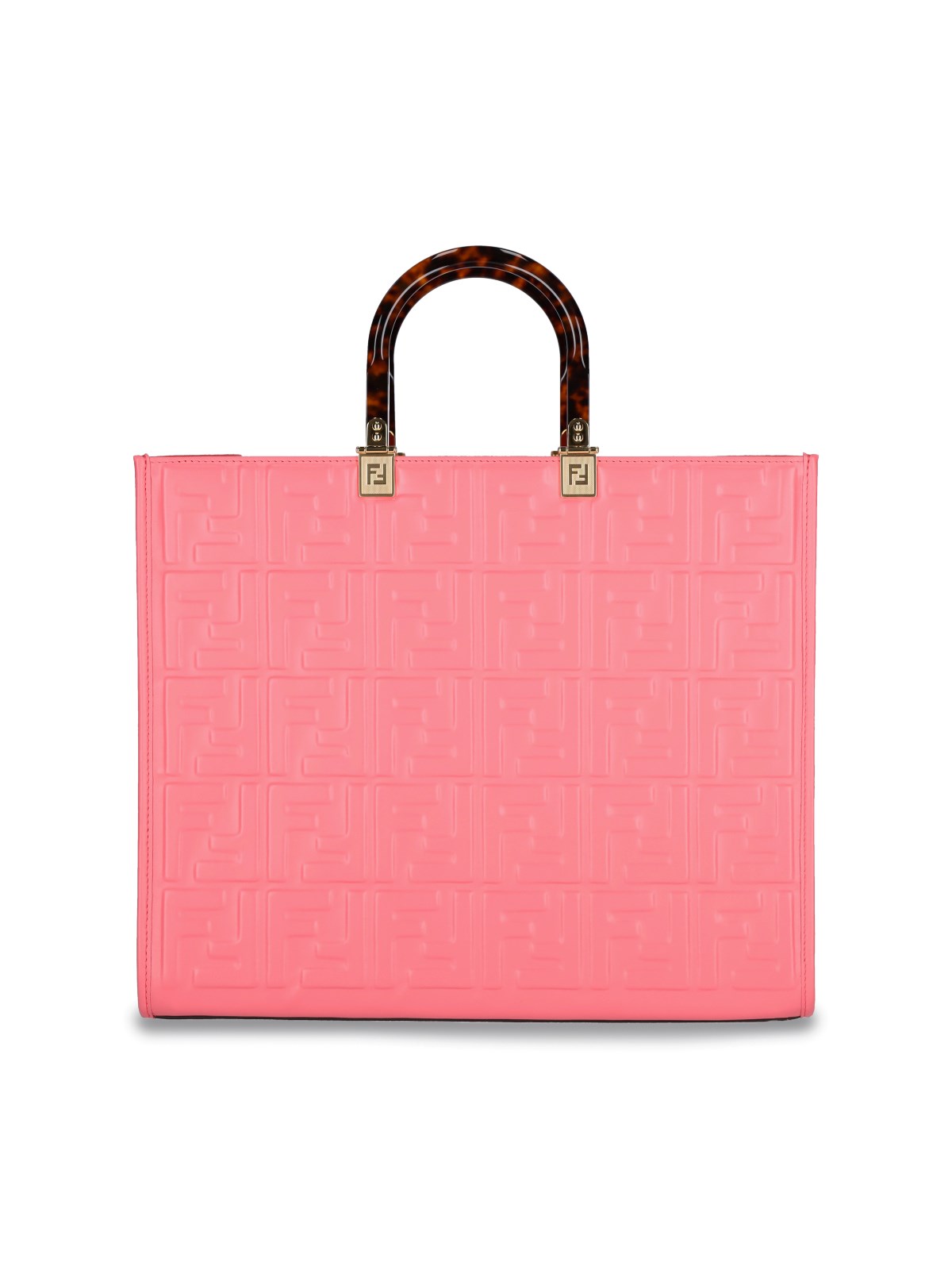 Fendi Sunshine midi tote bag in pink leather with all-over embossed FF pattern, two brown and black tortoise handles, adjustable and removable shoulder strap, gold hardware, main inner compartment.