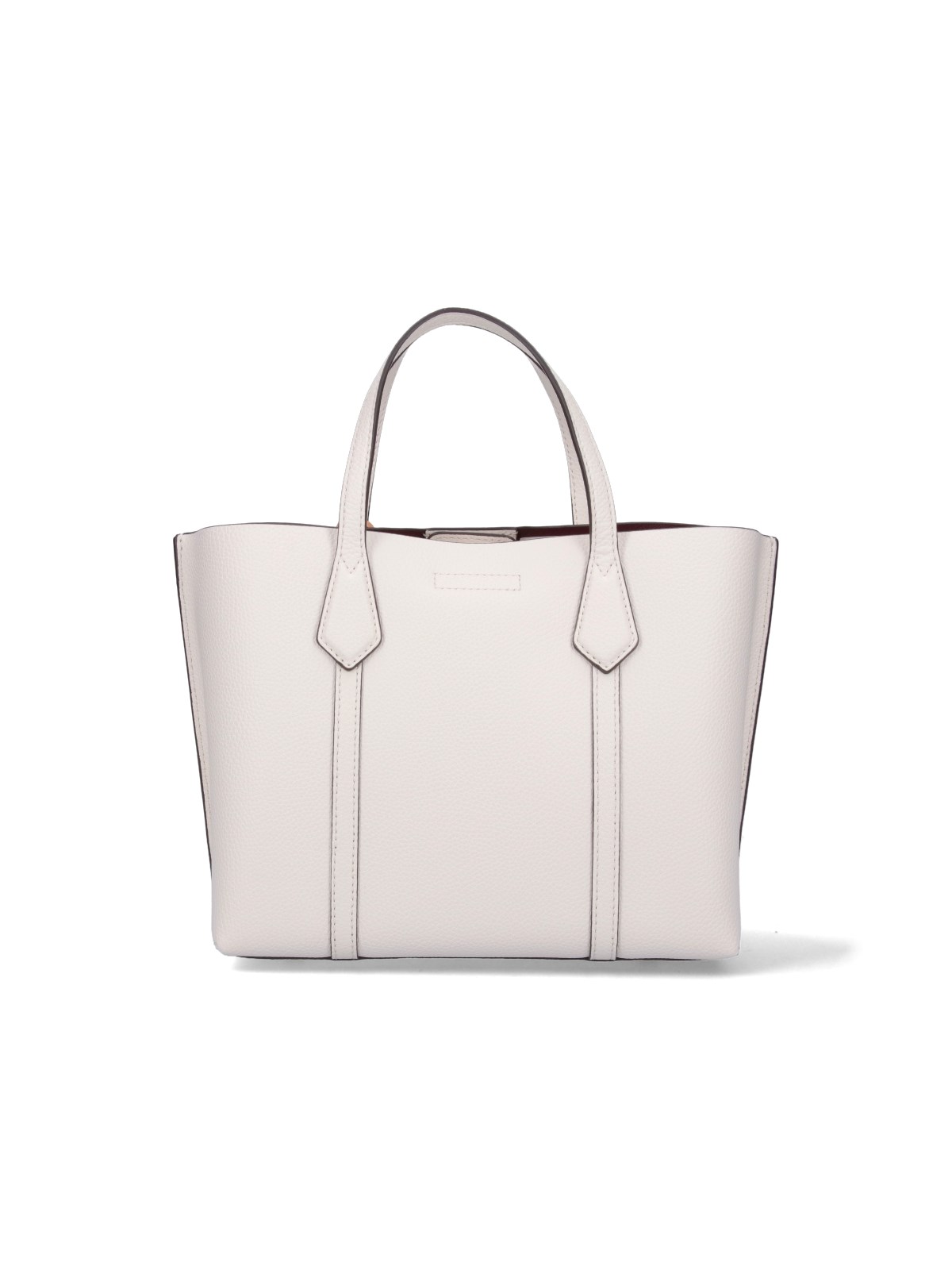 Tory Burch Perry small tote bag in white hammered leather with two top handles, removable handle charm, gold logo print on the front, snap button closure, inner zip pocket, inner open pocket, two separate inner compartments.