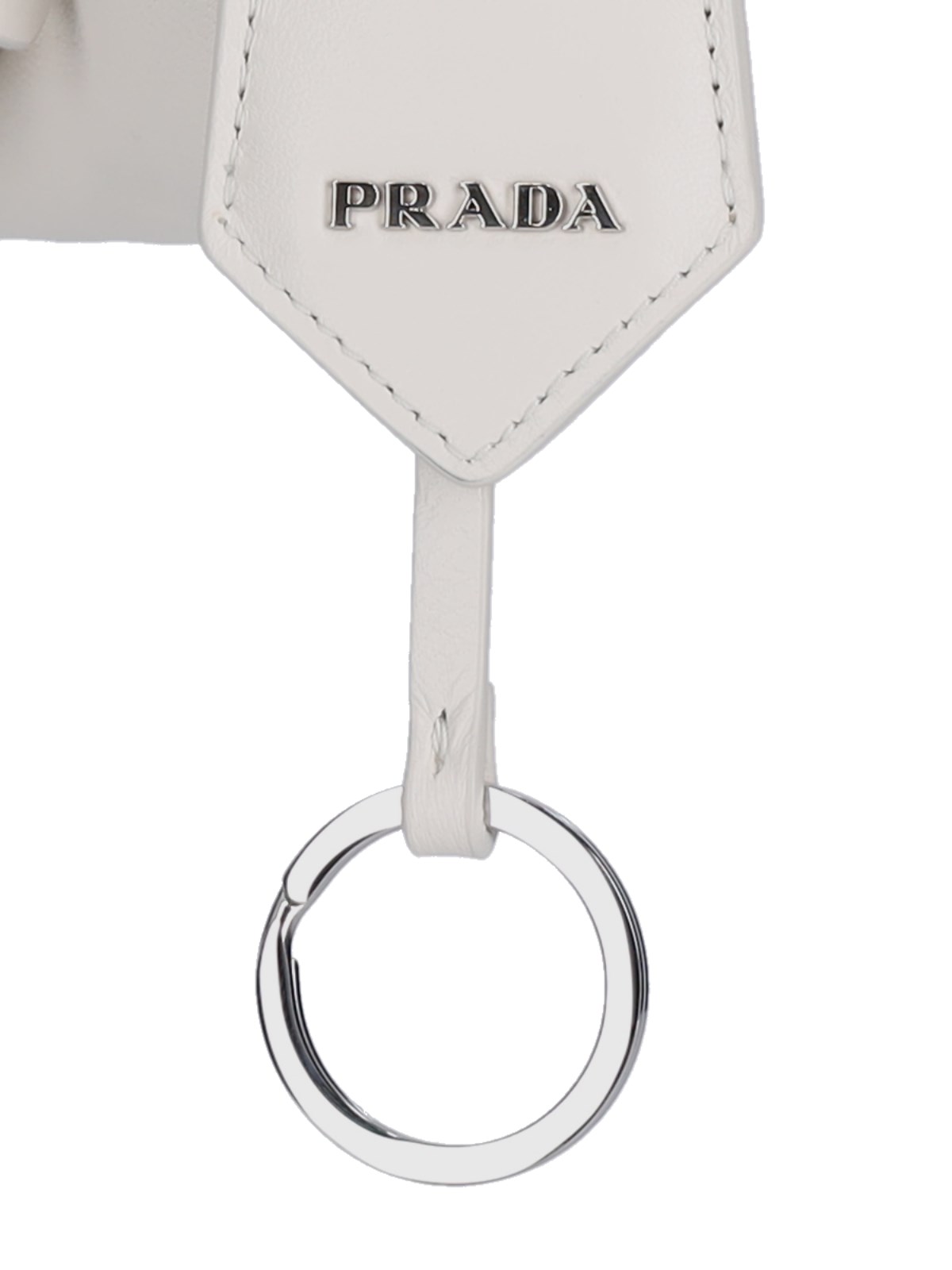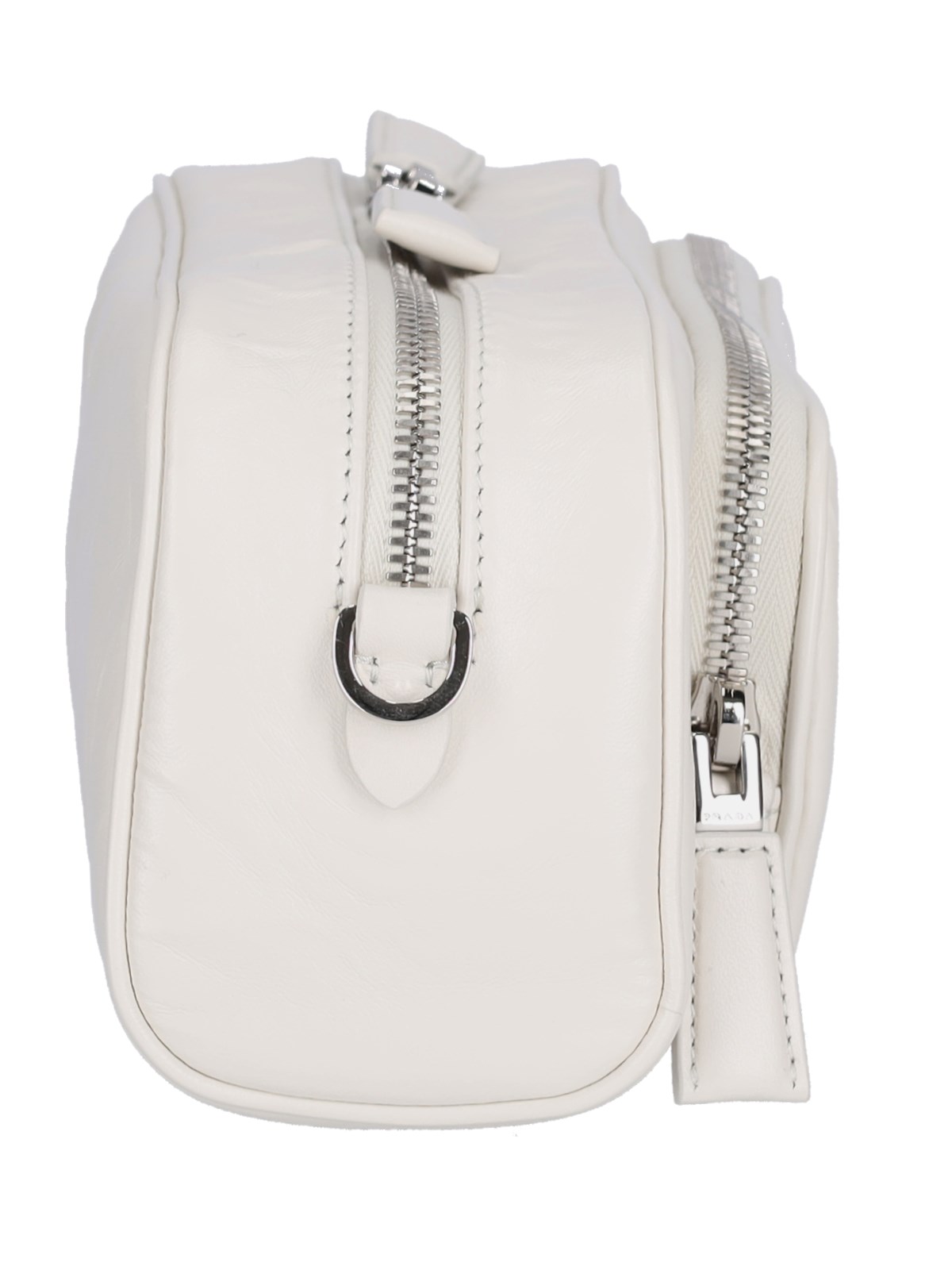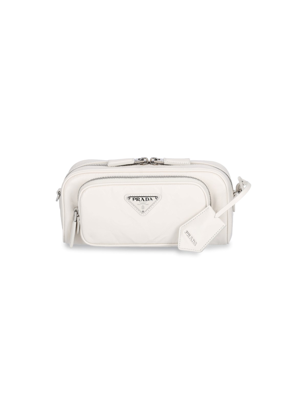 Prada multi pocket crossbody bag in white crinkle leather with double top zip closure, adjustable and removable logo jacquard shoulder strap, zip pocket at the front, enameled triangle logo, removable leather keyring detail at the front, inner zip pocket, inner slip pocket, main inner compartment.