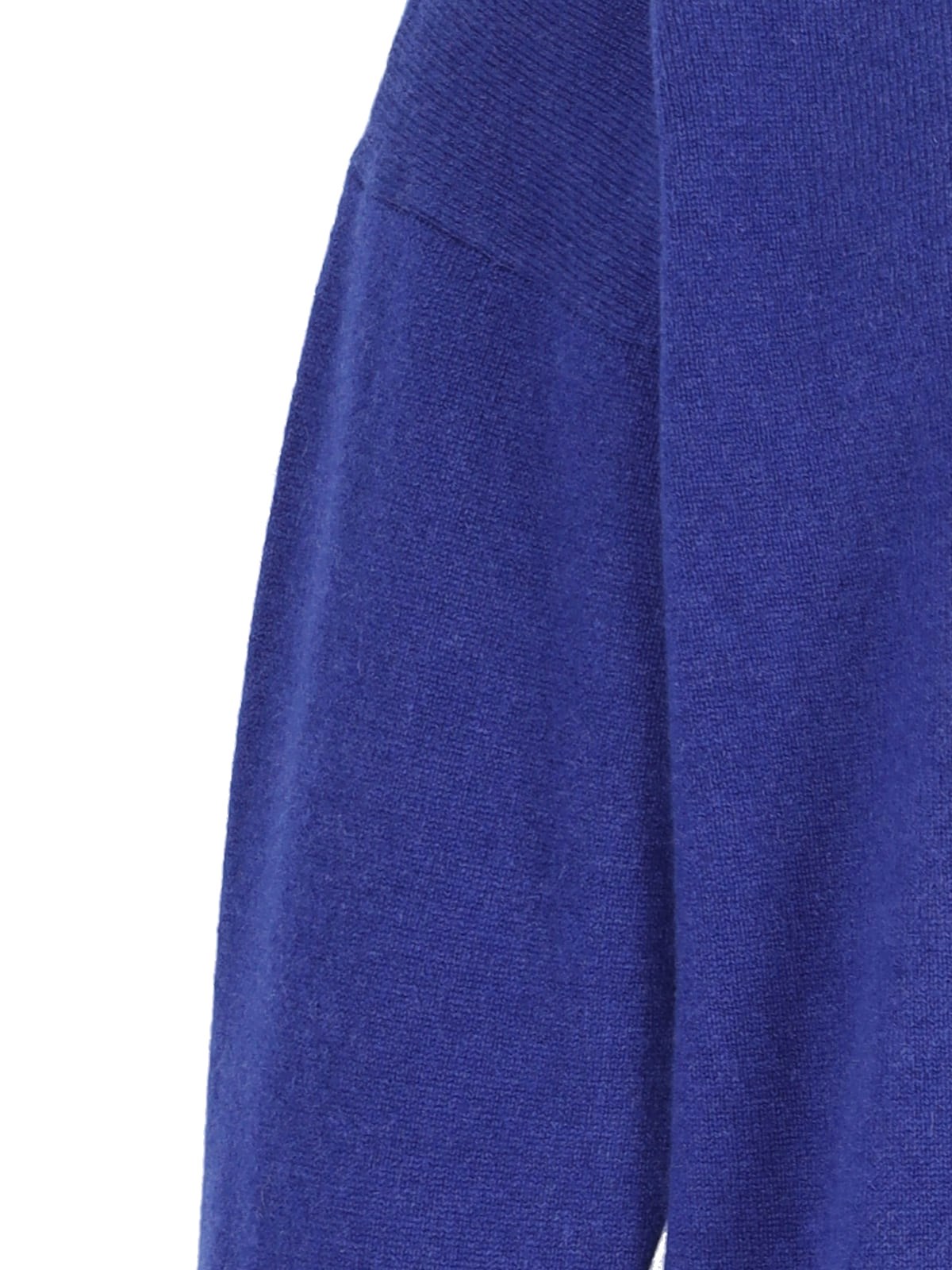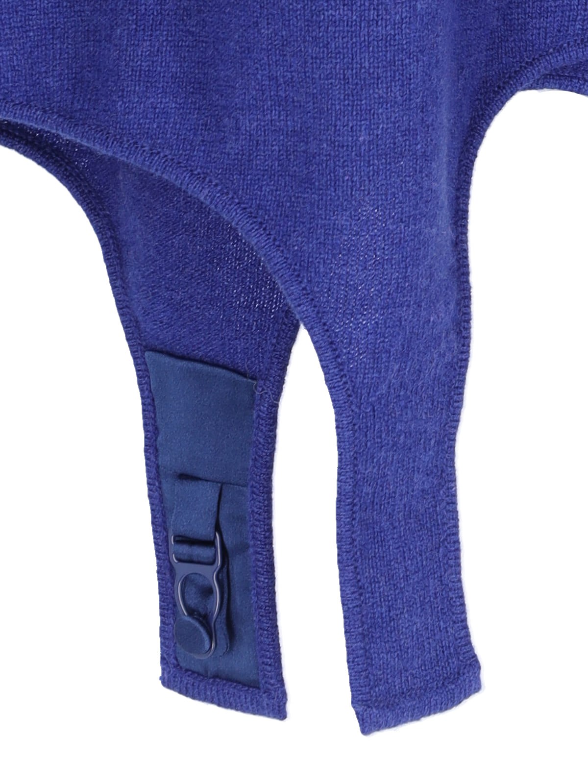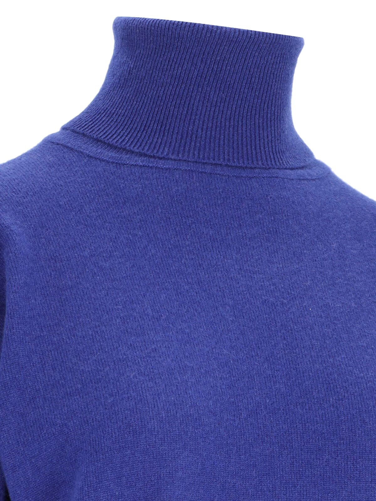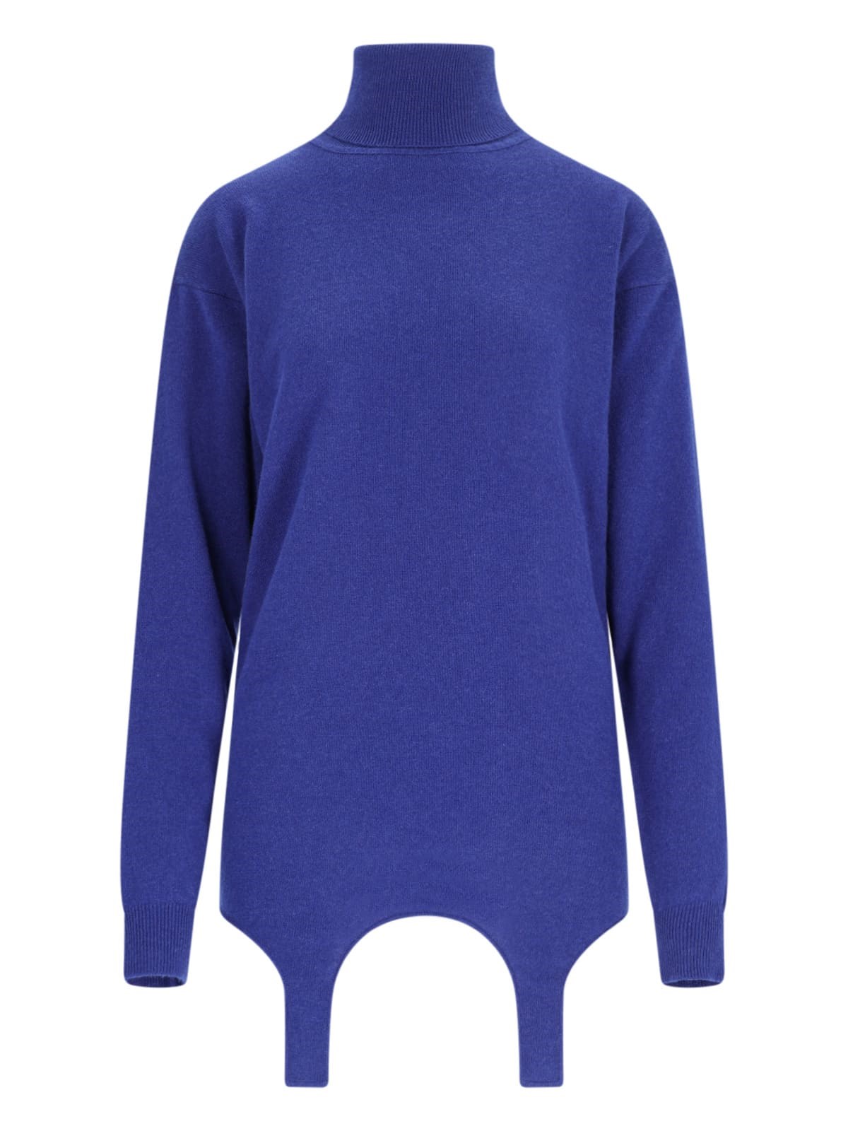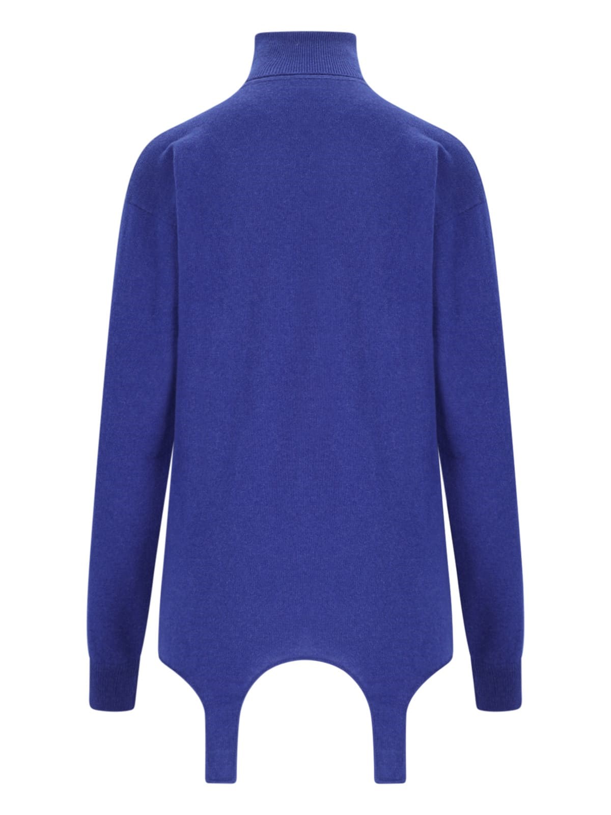 Saint Laurent turtleneck sweater with garter, in blue cashmere, high neck, ribbed trim, four belt loops detail on the bottom, asymmetrical hem.