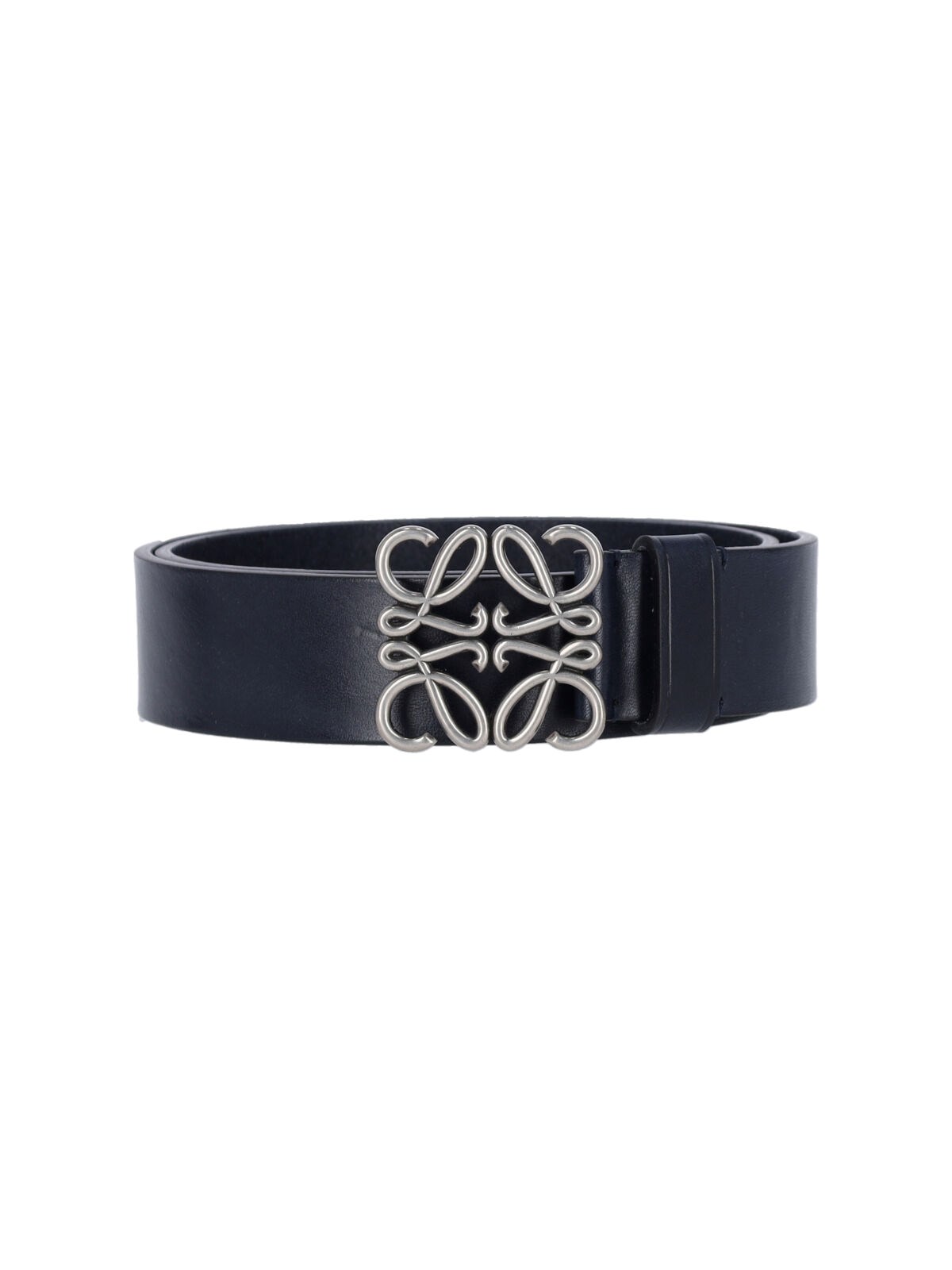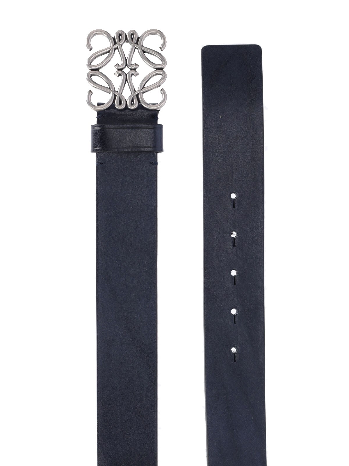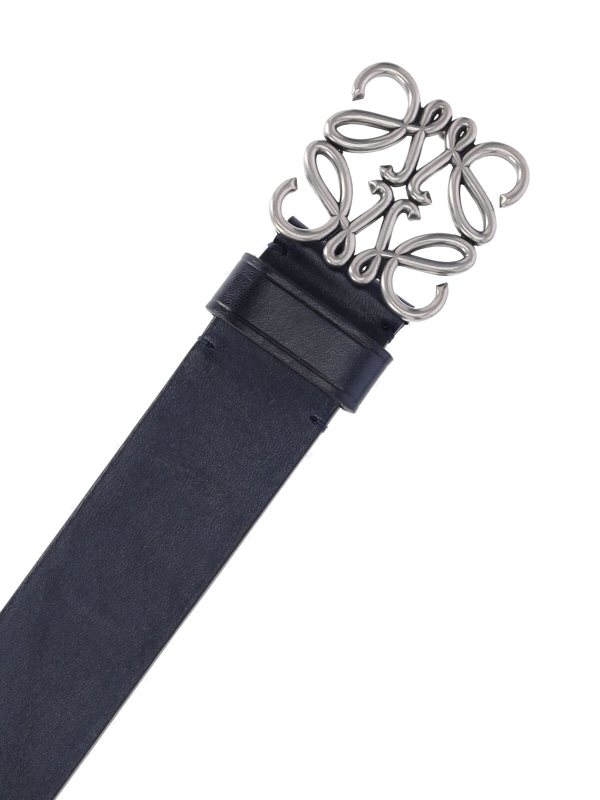 Loewe Anagram belt in blue hammered leather with silver metal logo buckle at the front, adjustable.
