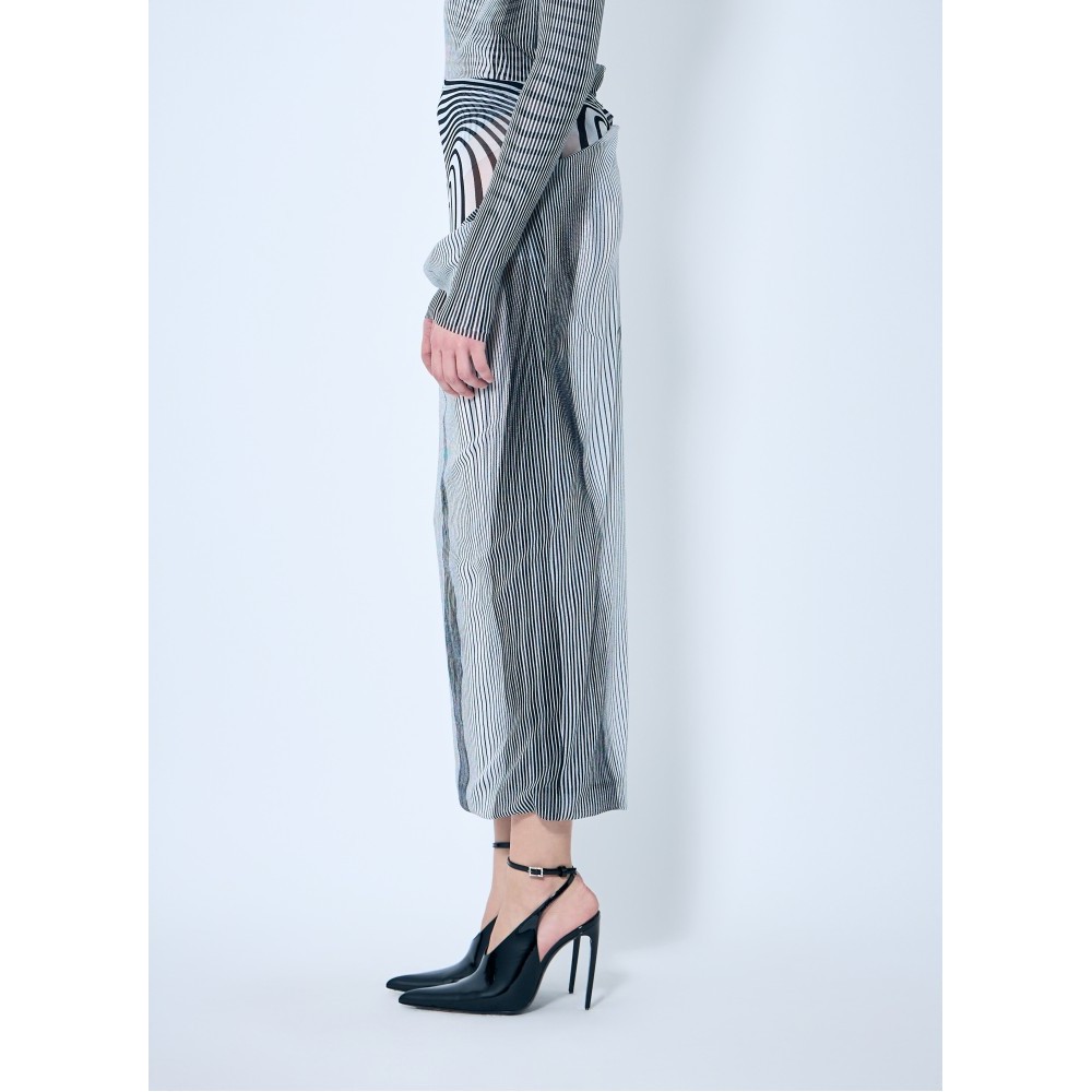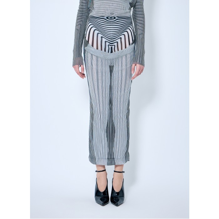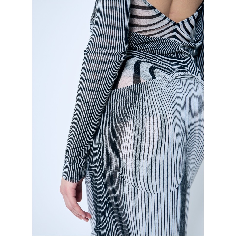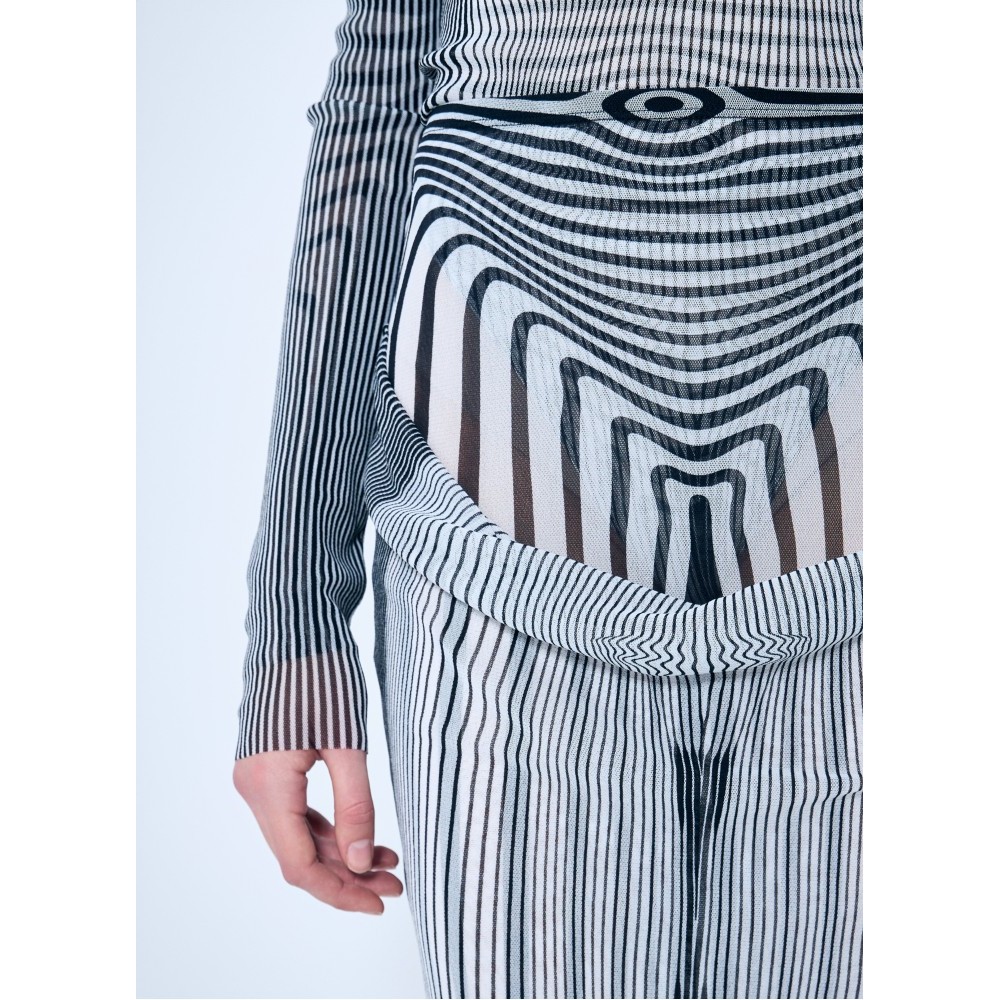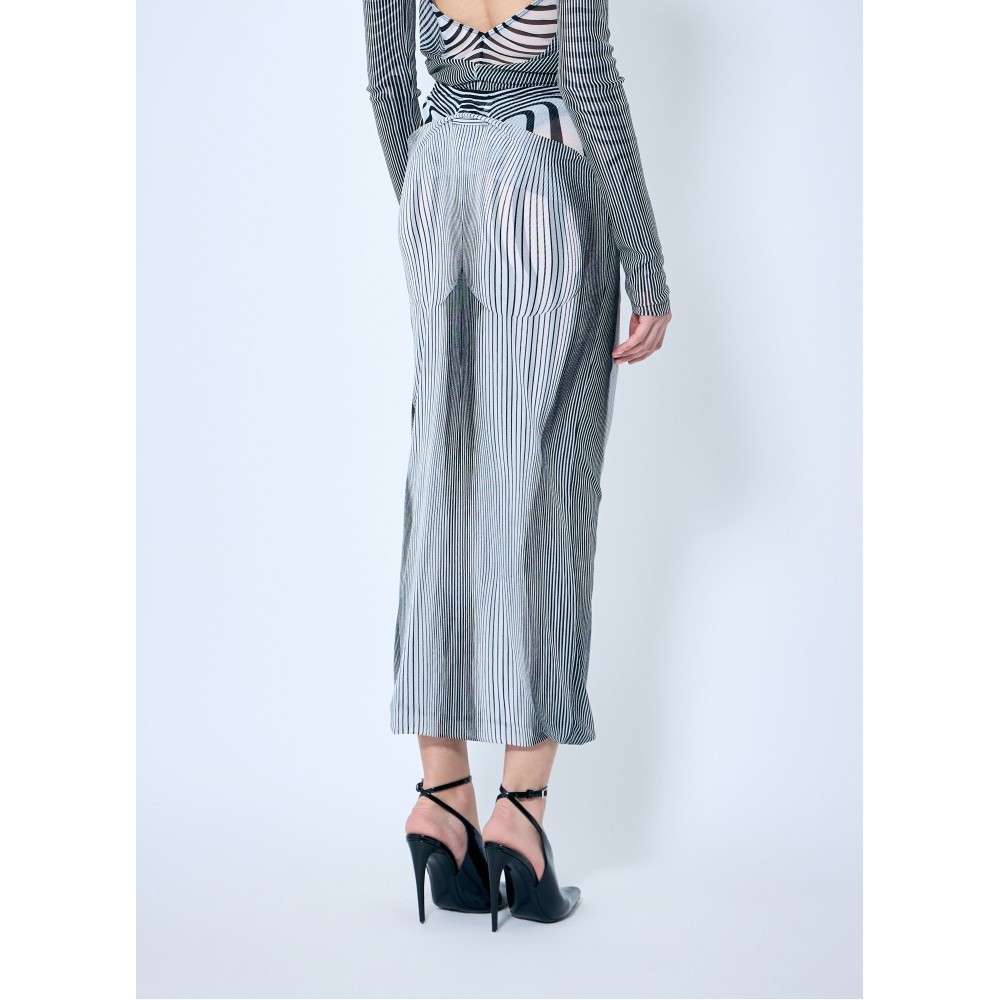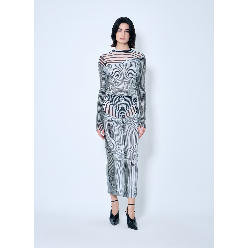 Mesh midi skirt in Pinstripe body morphing and Mariniere body morphing print with draped overlay.