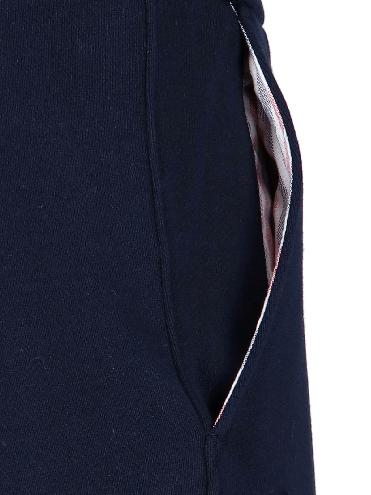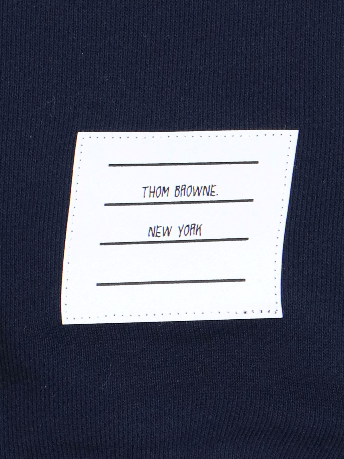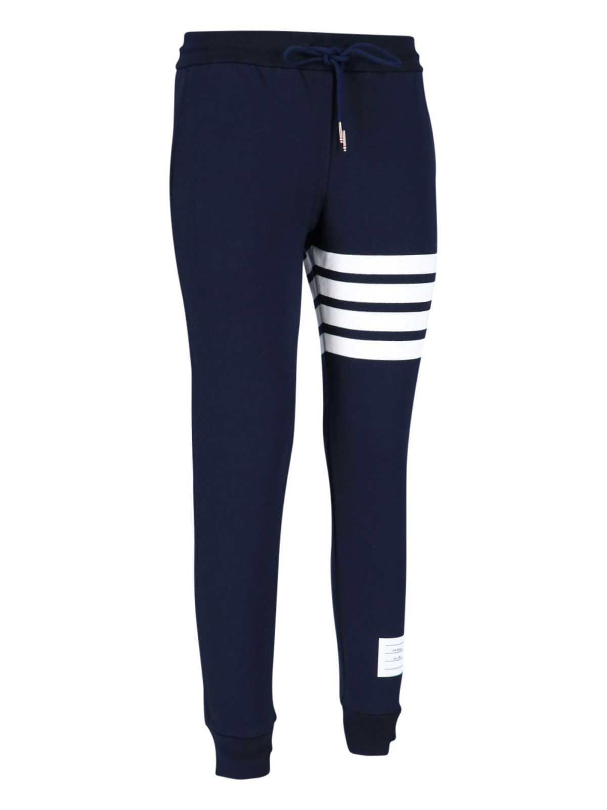 Thom Browne 4-bar blue cotton track pants with drawstring elastic waistband, iconic white stripe print on the front and back, white logo label on the front, two side pockets, elastic cuffs.