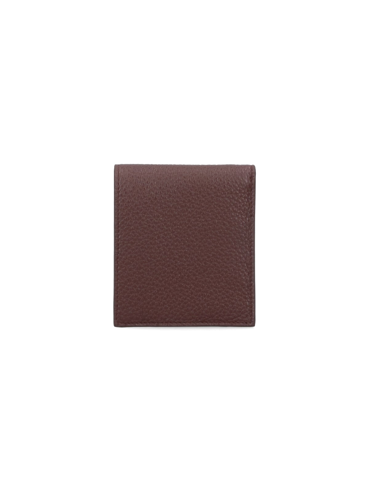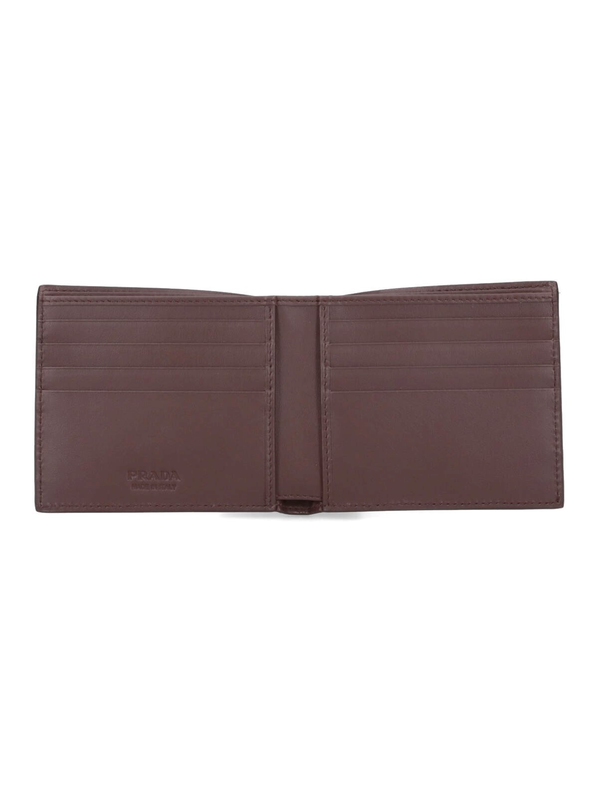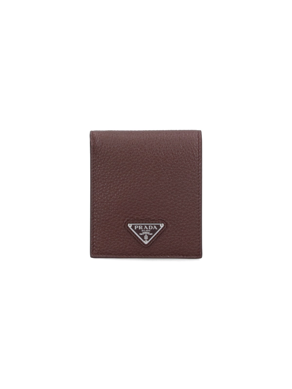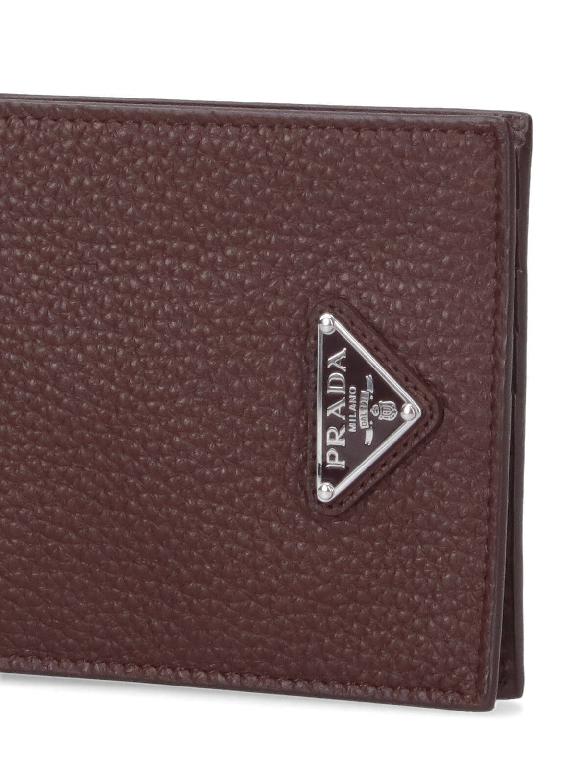 Prada bi-fold logo wallet in brown Saffiano calf leather with triangle metal enamel logo on the front, eight internal card slots, and an inner bill compartment.