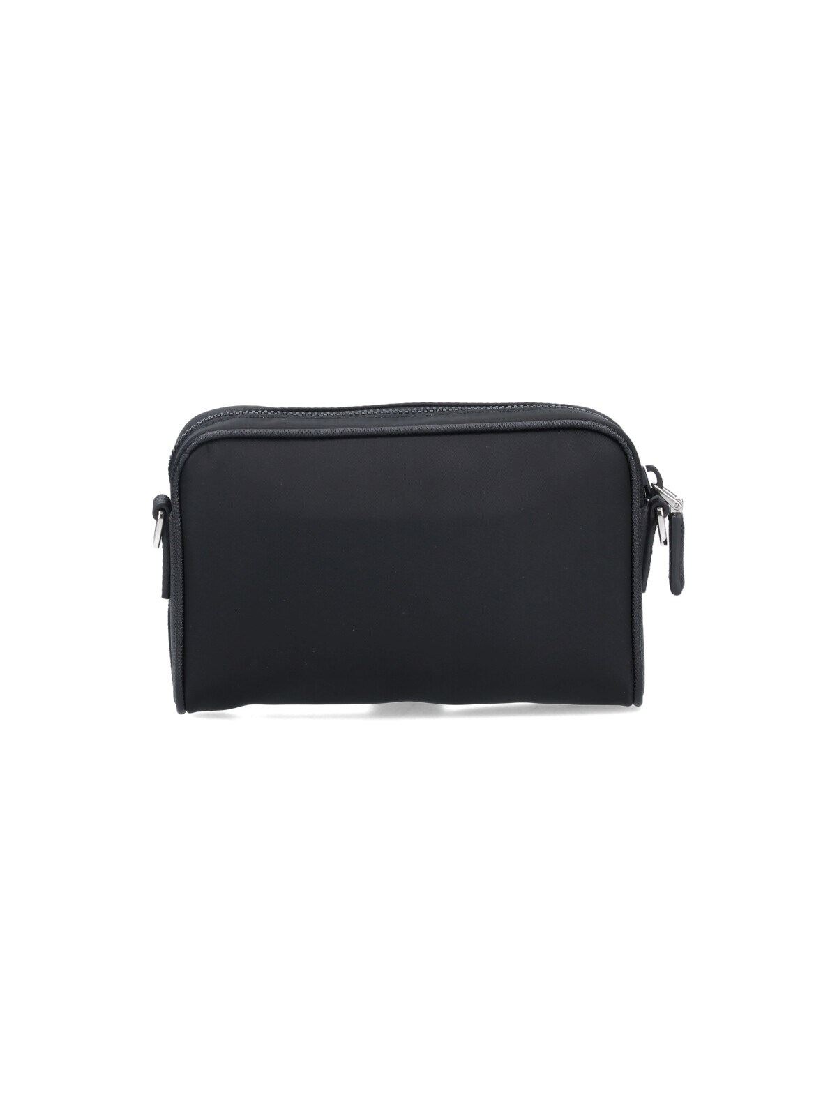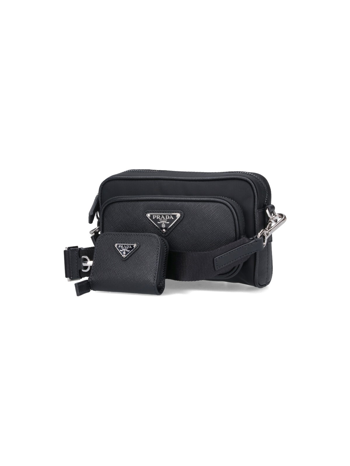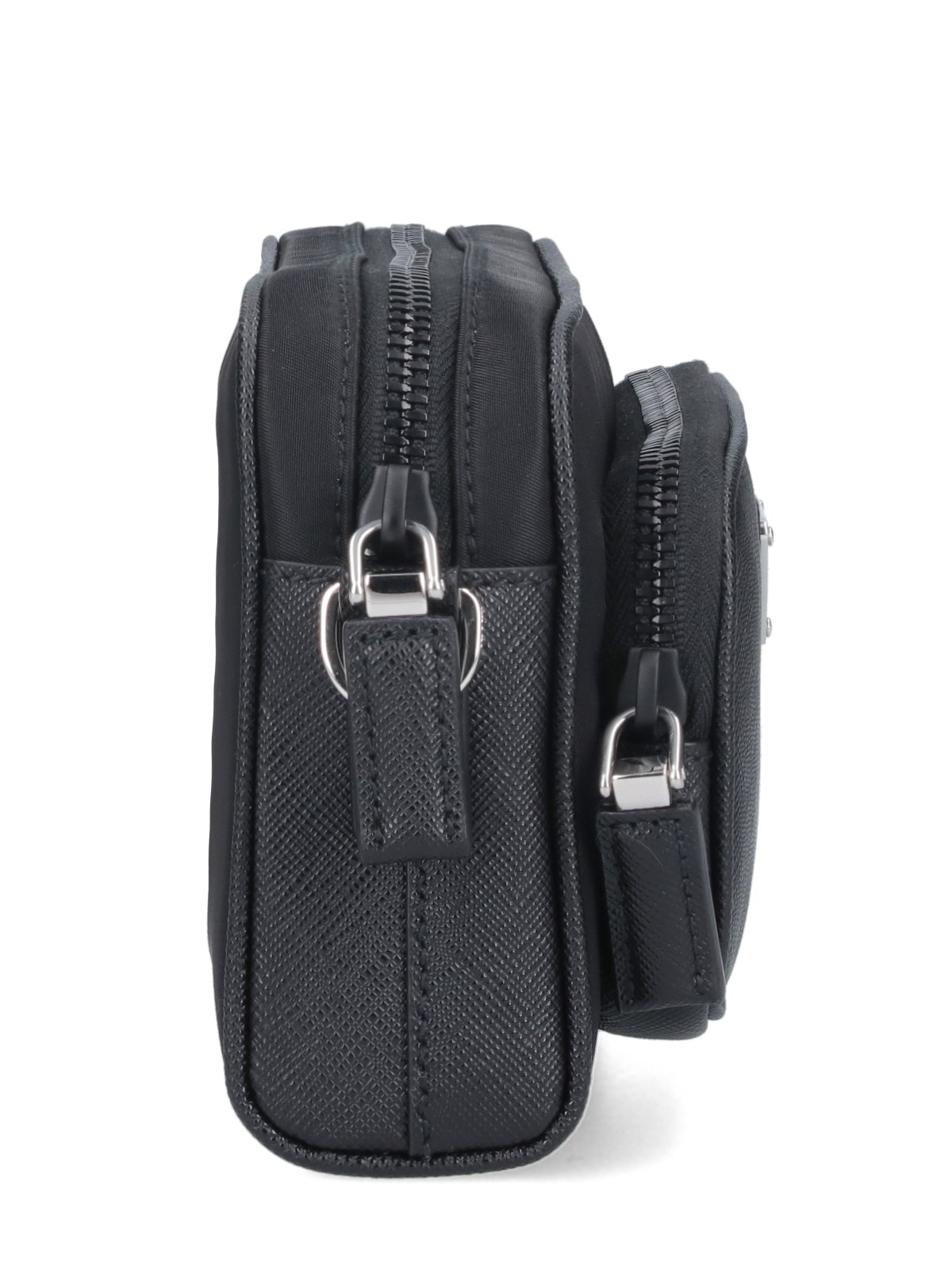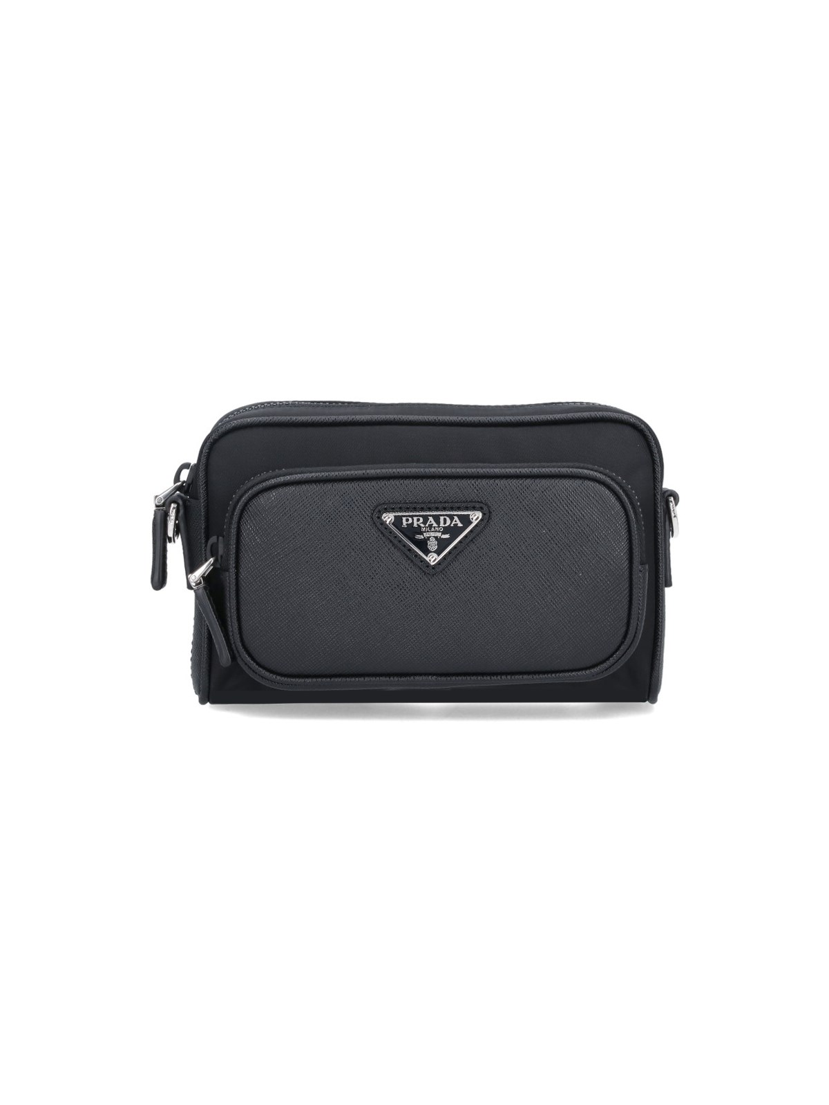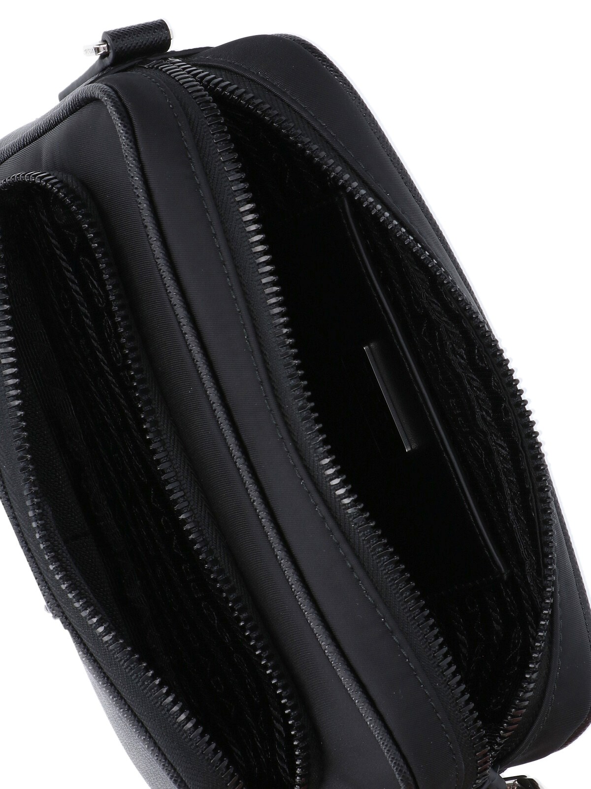 Prada logo crossbody bag in black Re-Nylon with Saffiano leather trim, adjustable and removable shoulder strap, removable zip pouch detail with triangle metal enamel logo, zip closure, front zip pocket, enameled metal triangle logo detail on the front, inner flat pocket, main inner compartment.