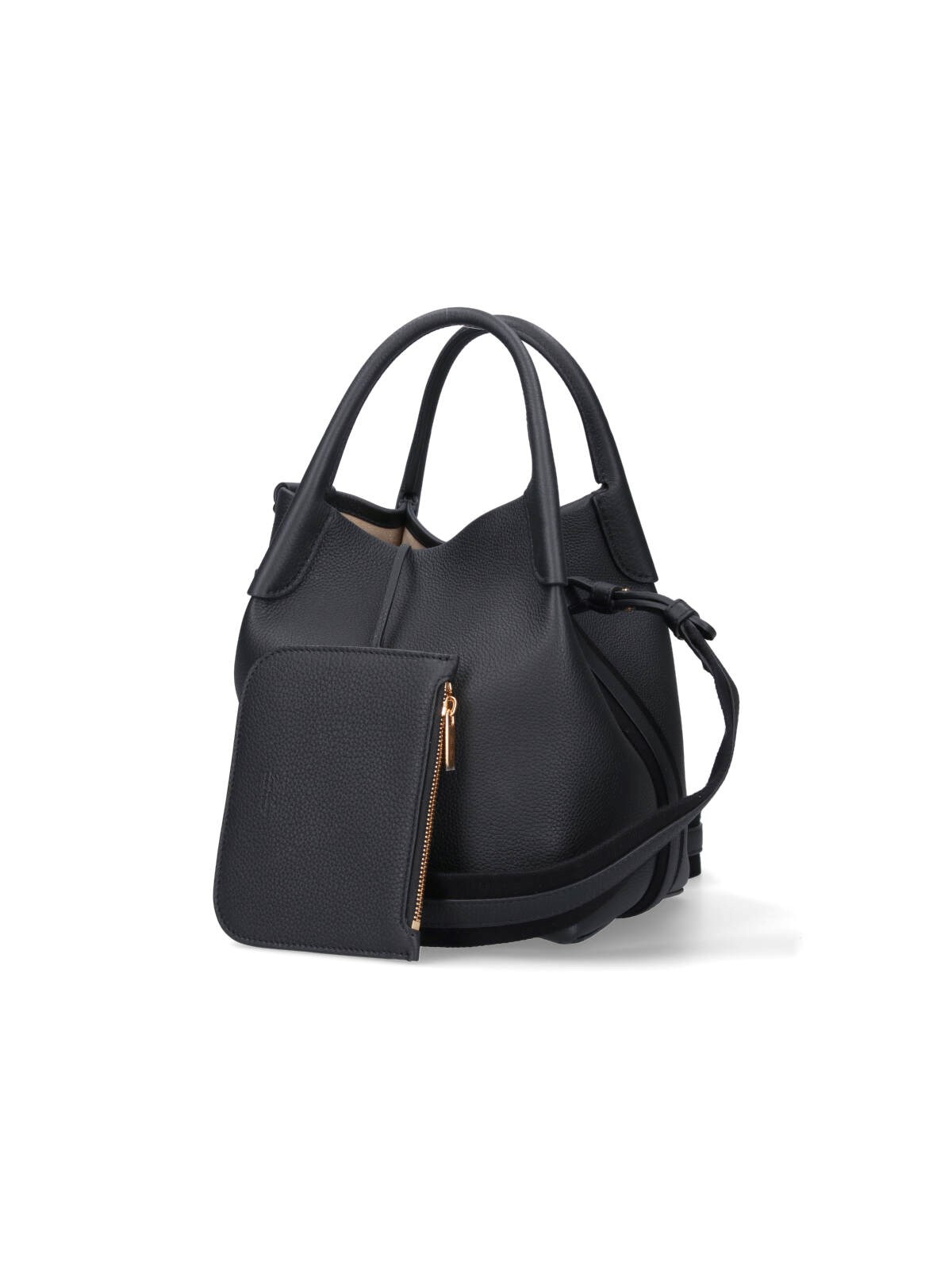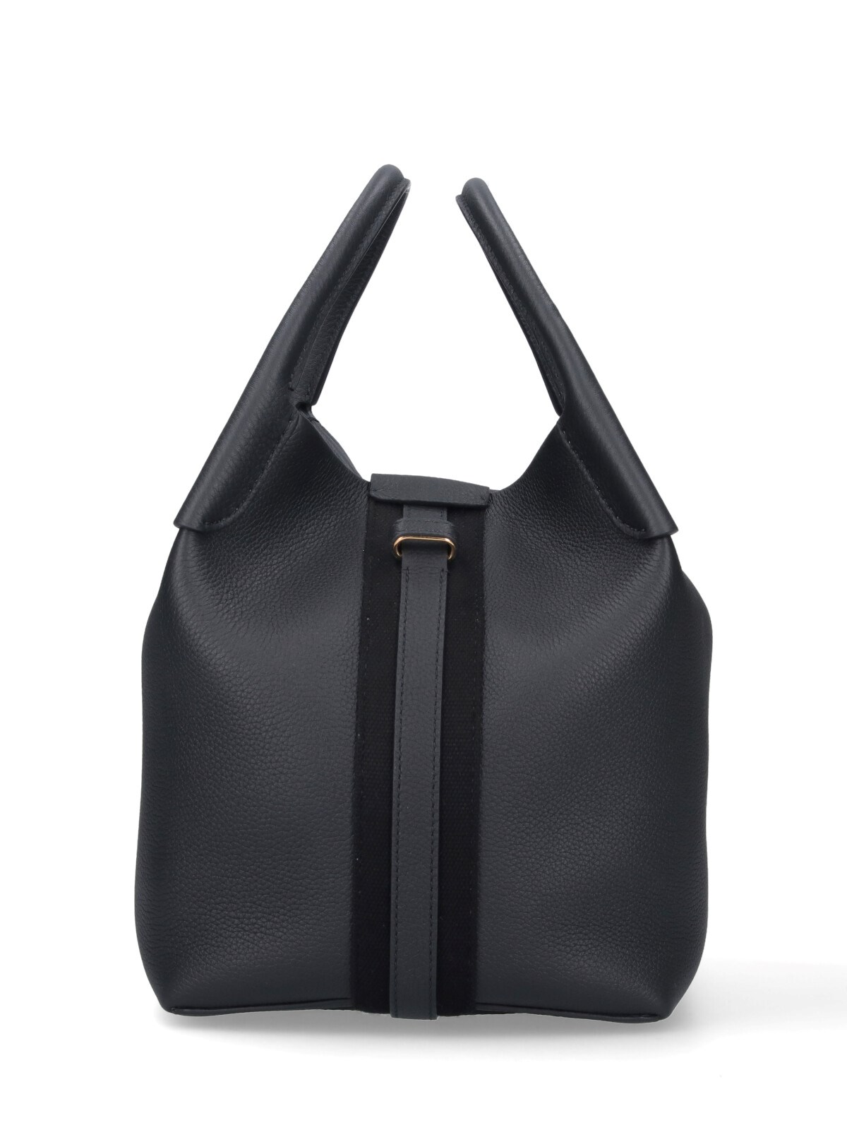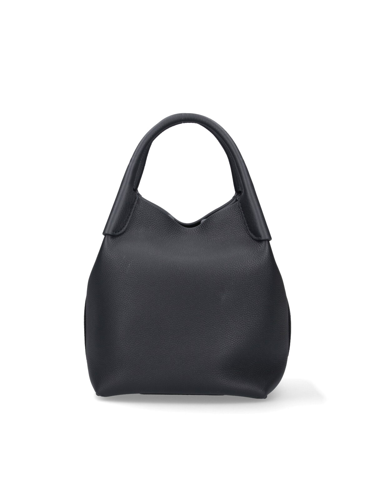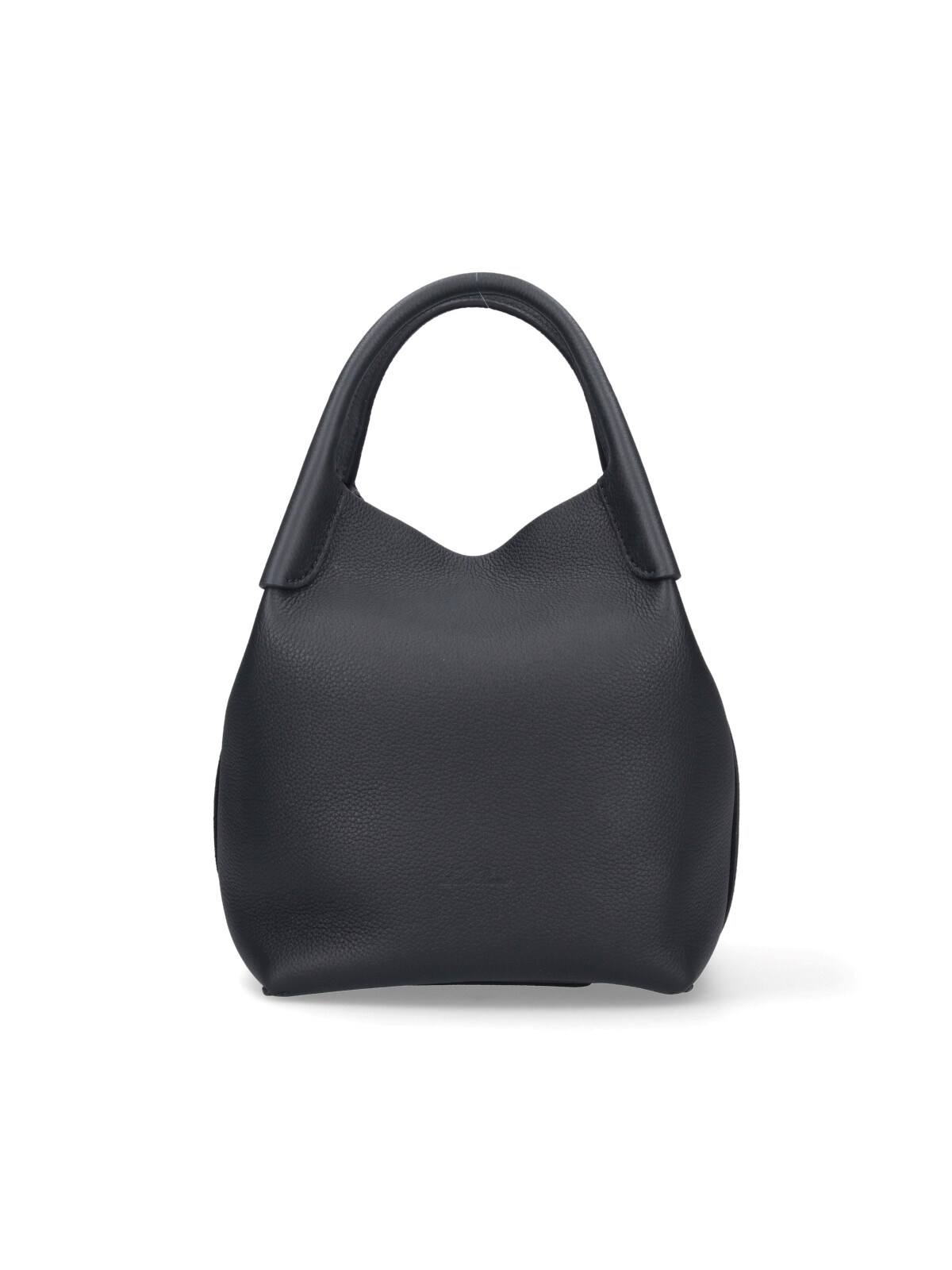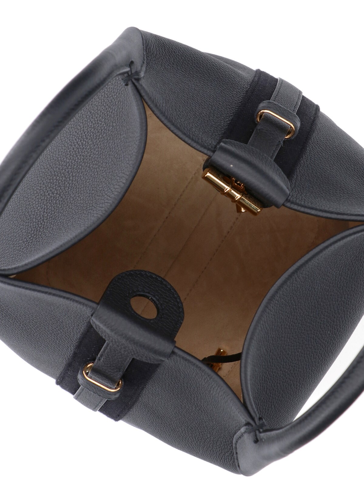 Loro Piana Bale small bucket bag in black hammered calf leather with two top handles, shoulder strap, embossed logo on the front, gold metal charm closure, removable inner pouch, single inner compartment.