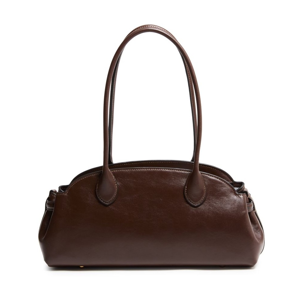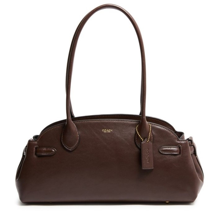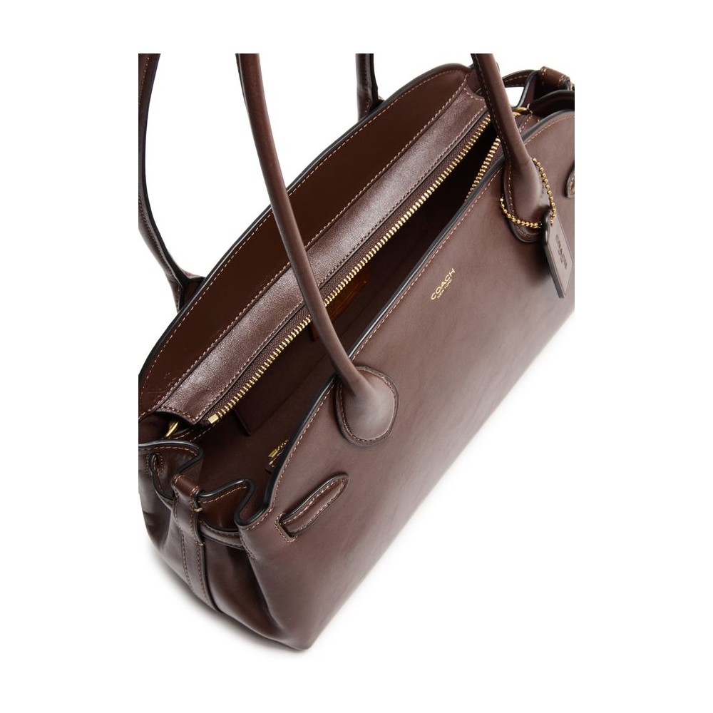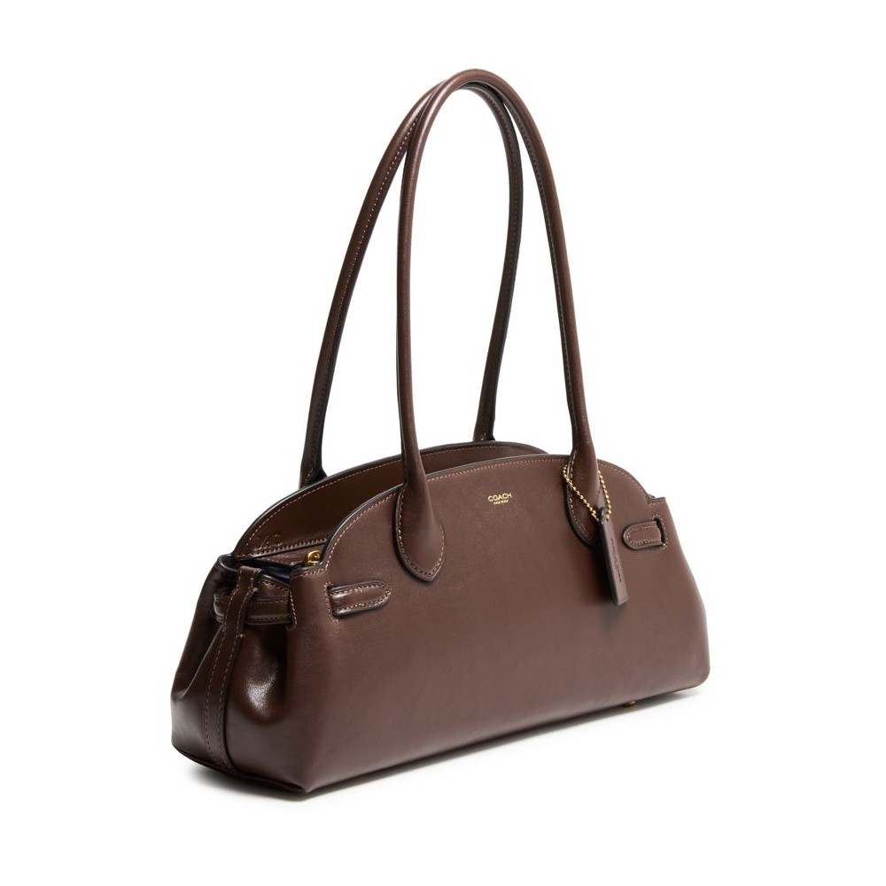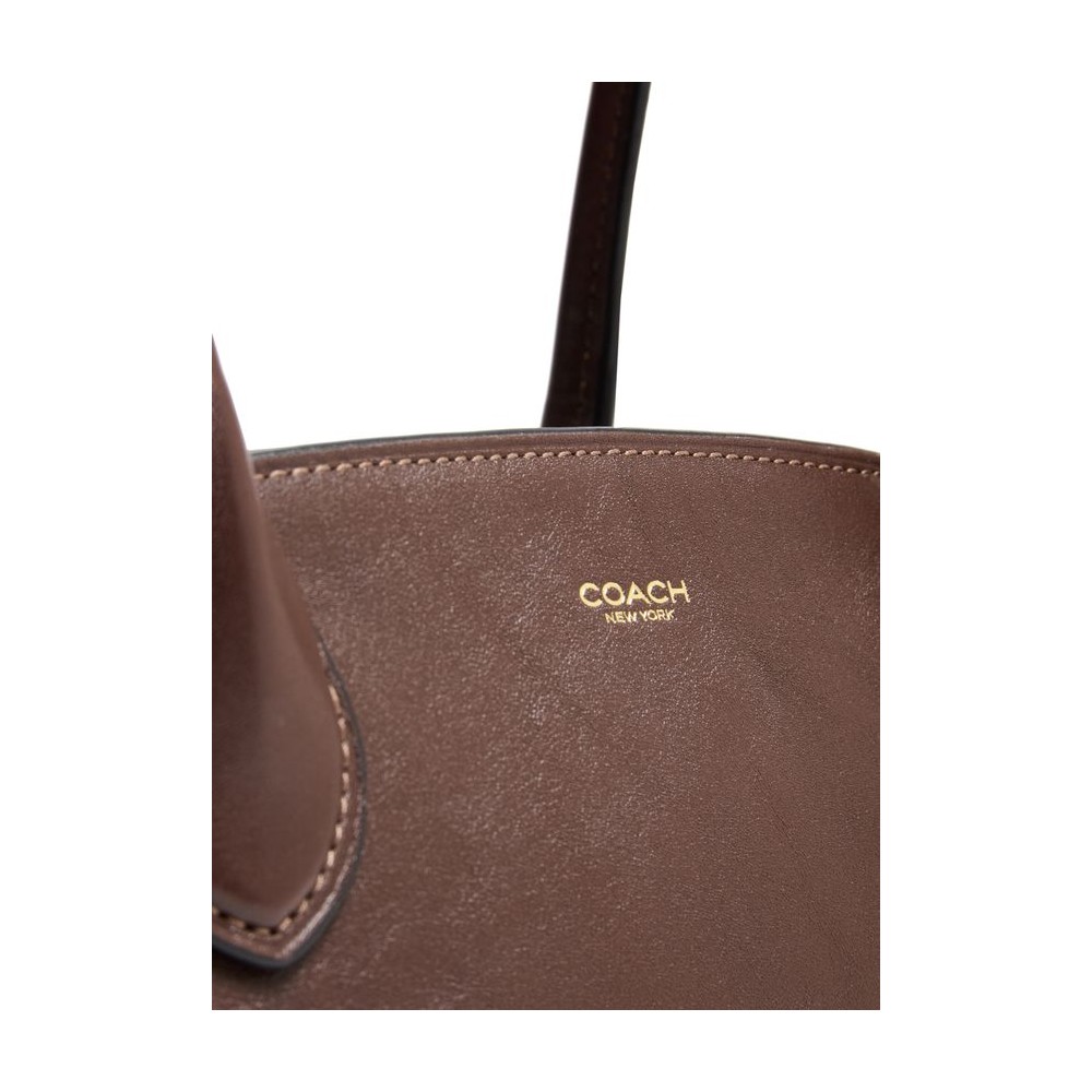 Shoulder bag, decorative label with embossed 'coach' logo, double handles, leather handle, front logo, logo in gold letters, smooth leather, zipper closure, visible topstitching, gold finish