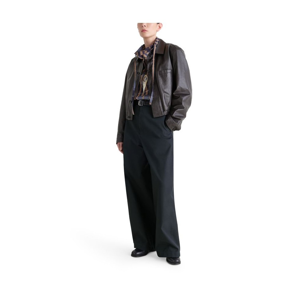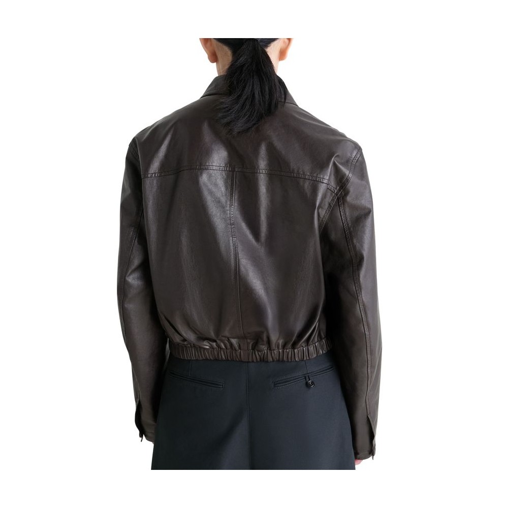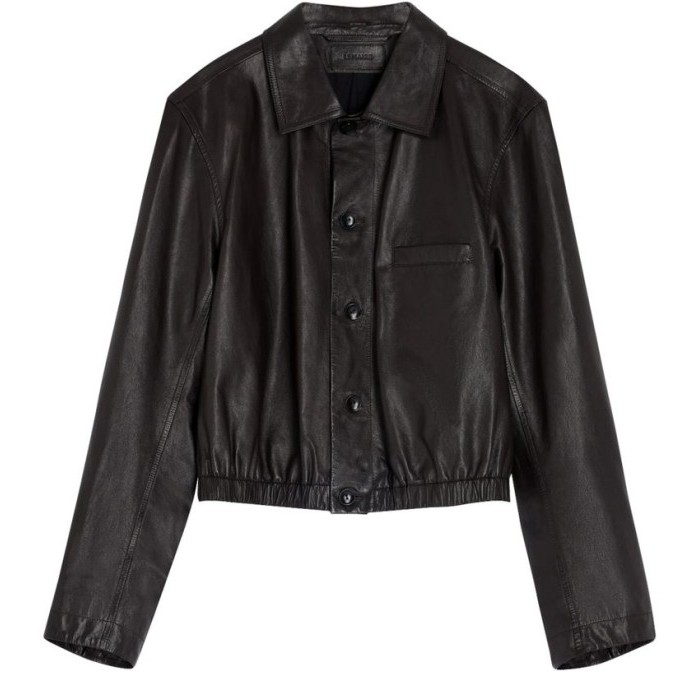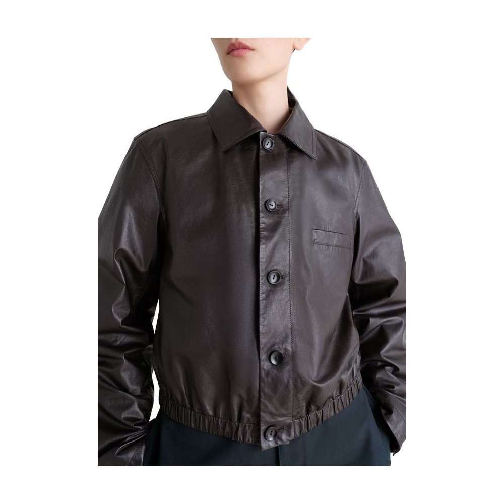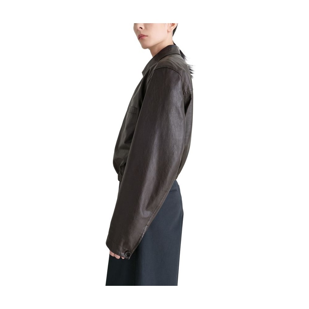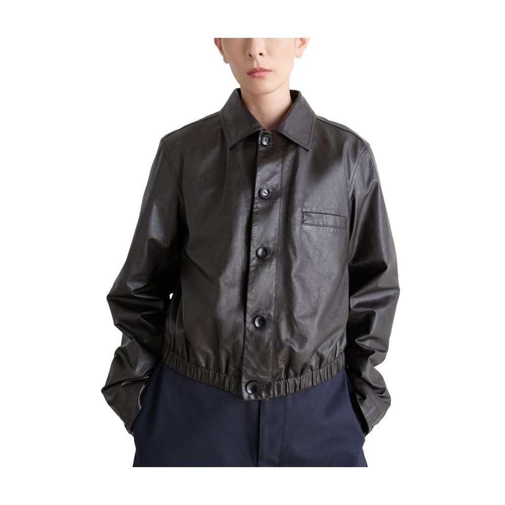 Glossed leather, regular fit, collar, breast pocket, welt pockets, long-sleeved, button fastening, notched collar