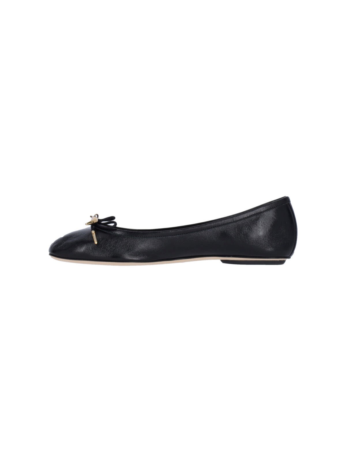 Chloe "Iris" bow ballet flats in black hammered leather with round toe, top bow, gold metal banana charm detail, slip-on fit, leather sole.