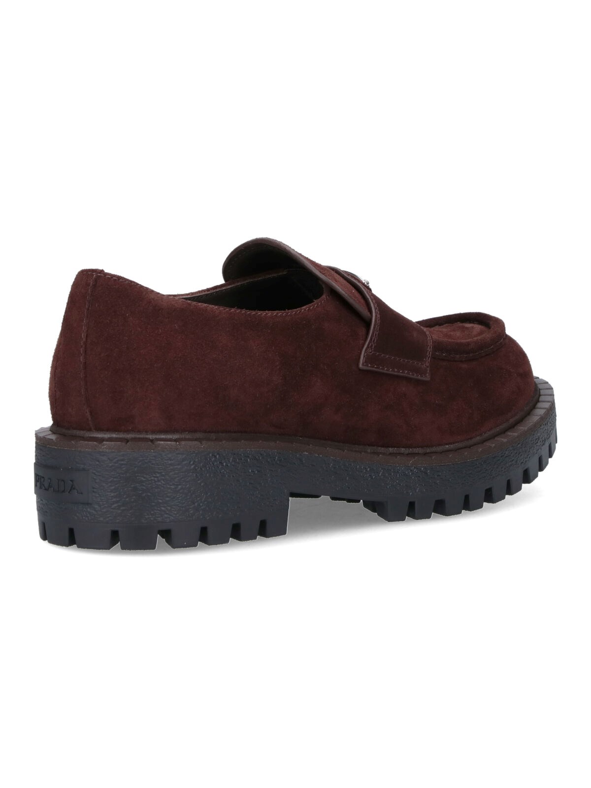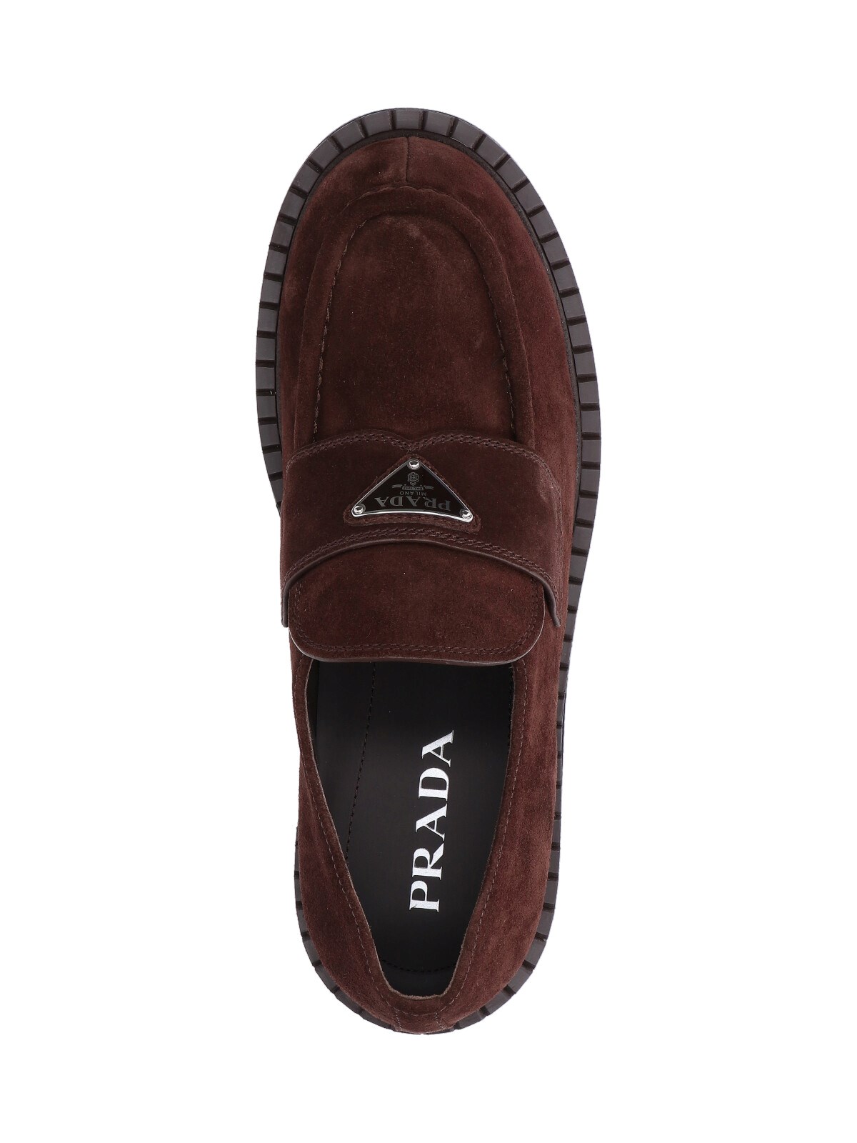 Prada logo loafers in brown suede with top band, enameled metal logo on the front, embossed stitching, tone-on-tone logo on the back, slip-on fit, rubber sole.