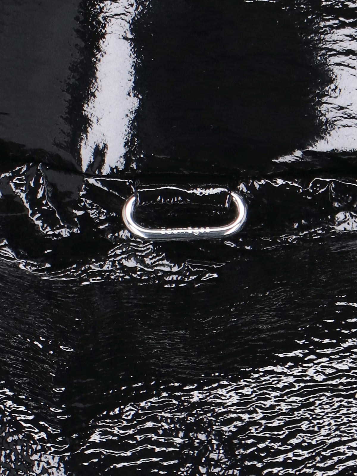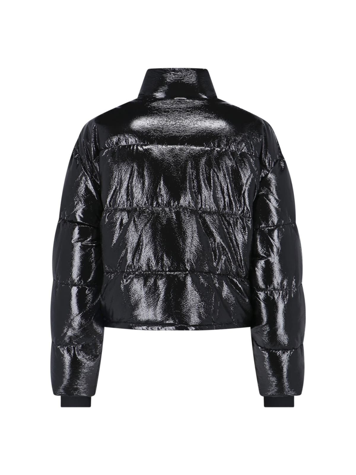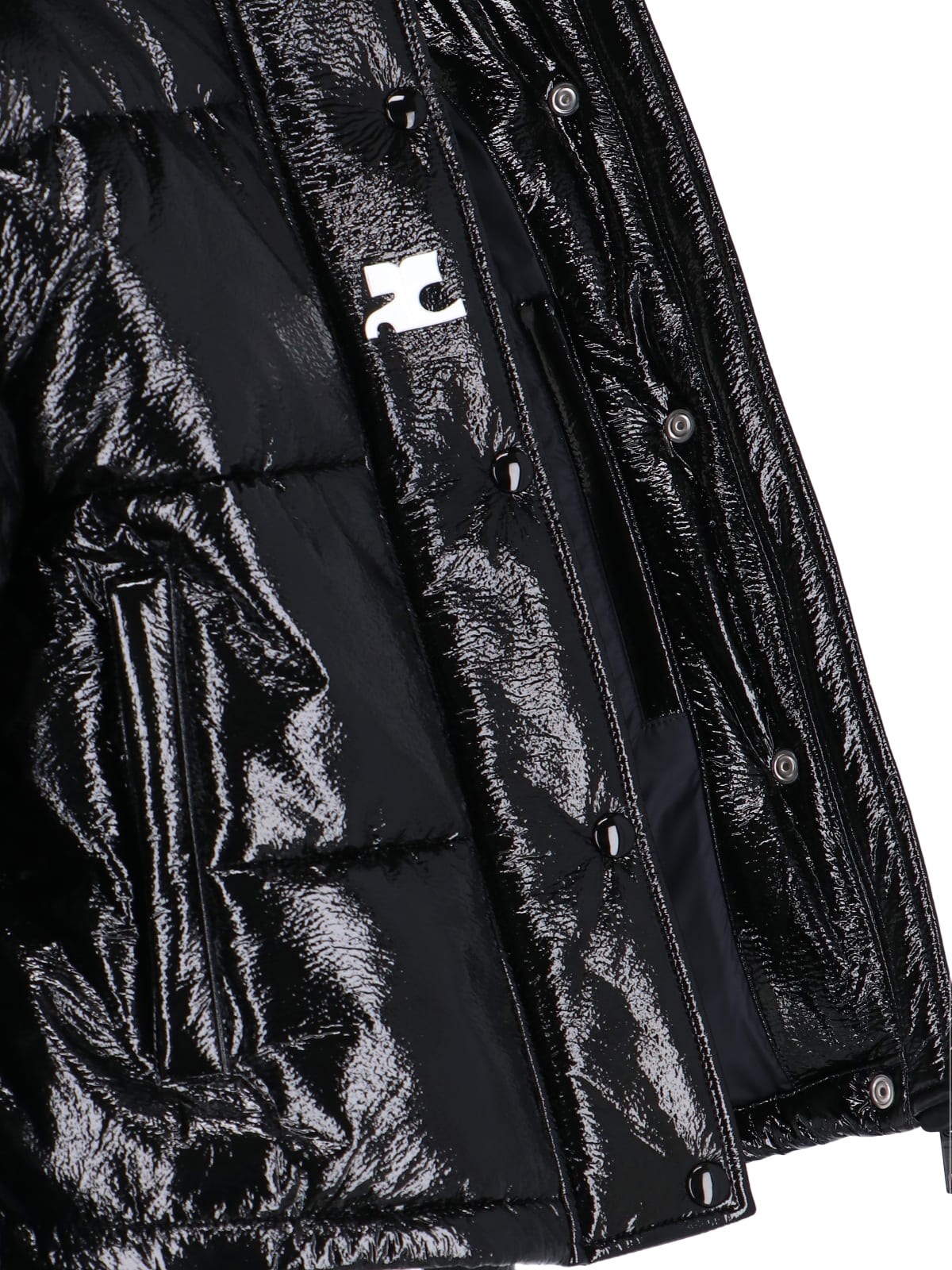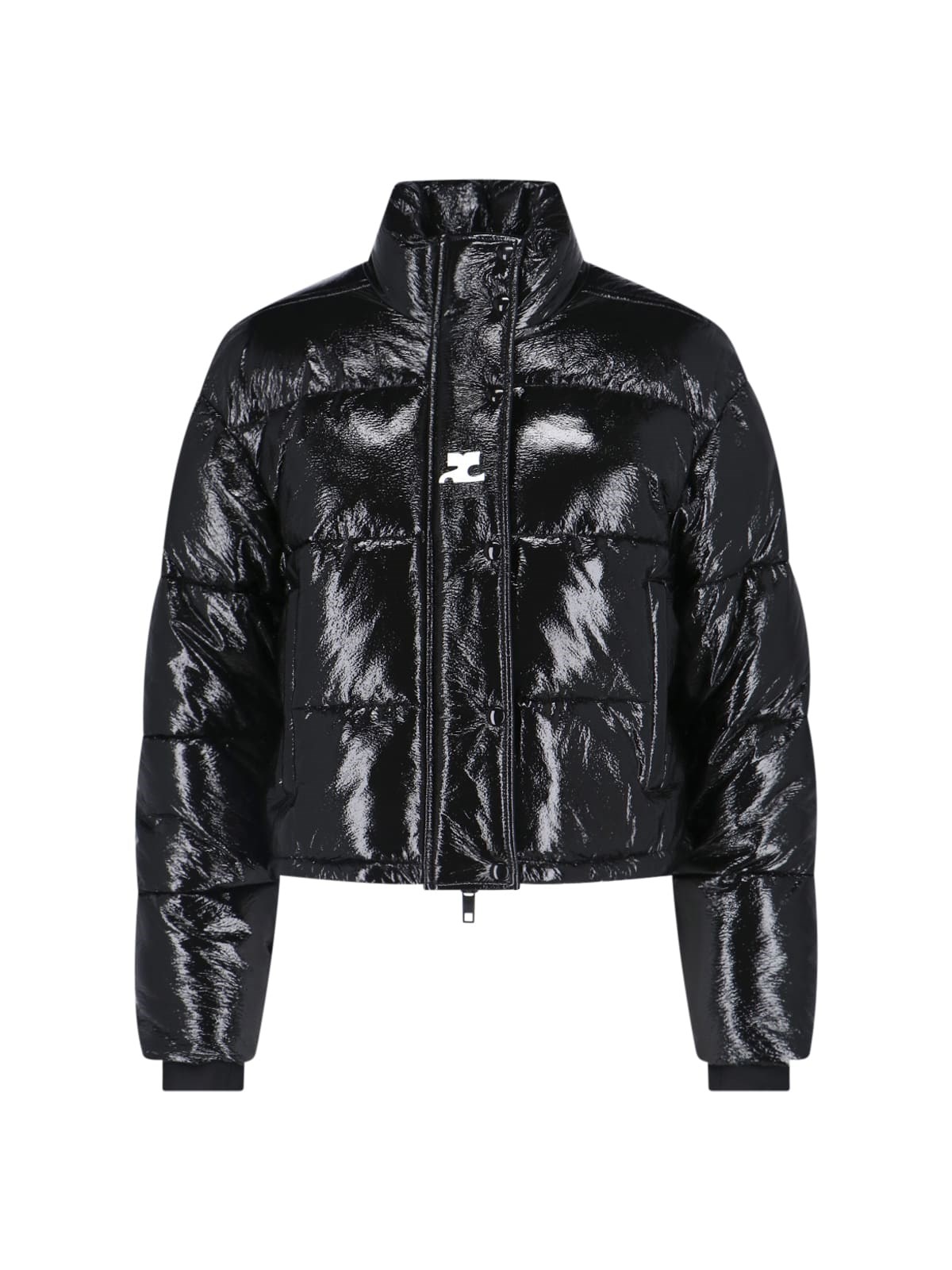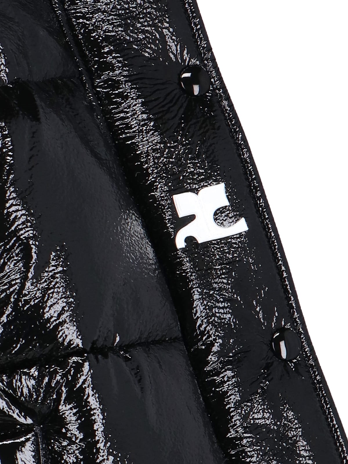 Black Courreges short vinyl down jacket with quilted design, high neck, zip and button closure, two side zip pockets, white logo patch applique on the front, elasticated cuffs, drawstring hem, straight hem.