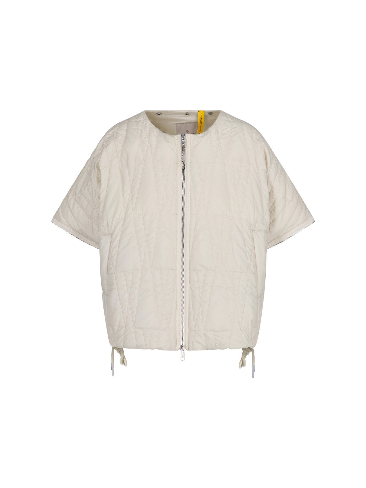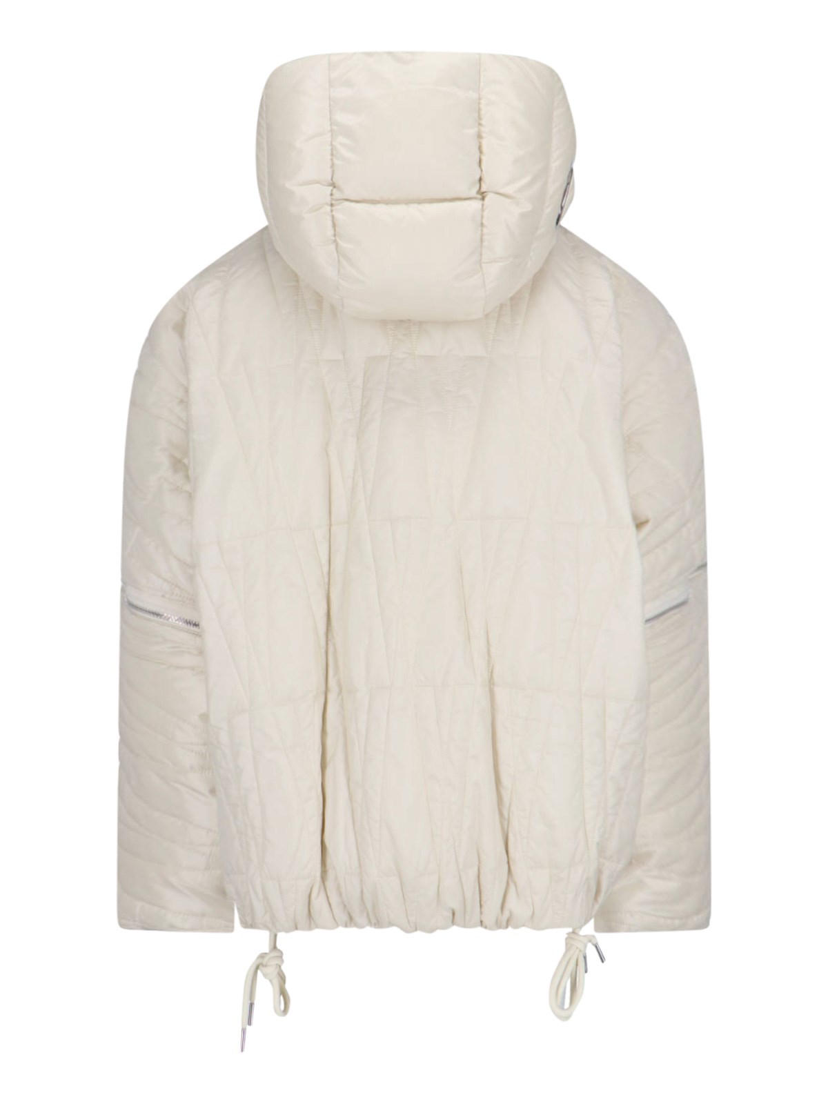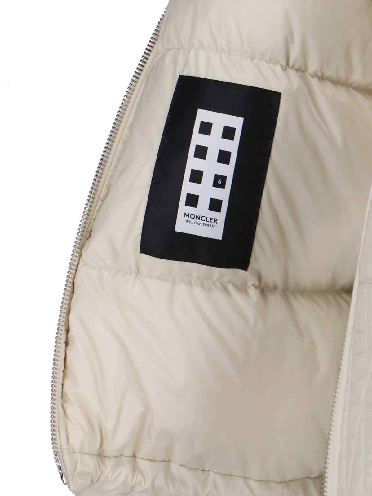 Moncler Genius x Willow Smith "Haissa 2 in 1" short down jacket in cream fabric with quilted and padded design, removable drawstring hood, side cut-out details, high neck, double zip closure, two side button pockets, removable sleeves, tonal logo patch on the sleeve, drawstring on the hem, straight hem.