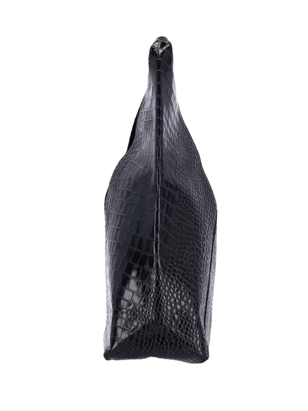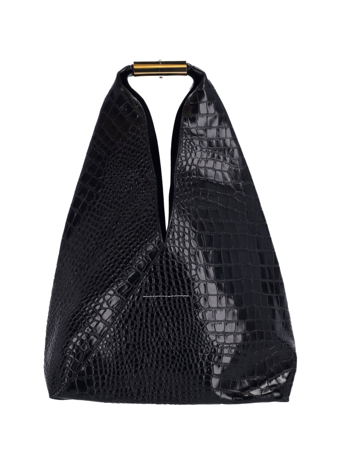 Maison Margiela MM6 medium Japanese bag in black leather with crocodile print, top handle in gold brass with 'numeric' logo detail, and a single inner compartment.