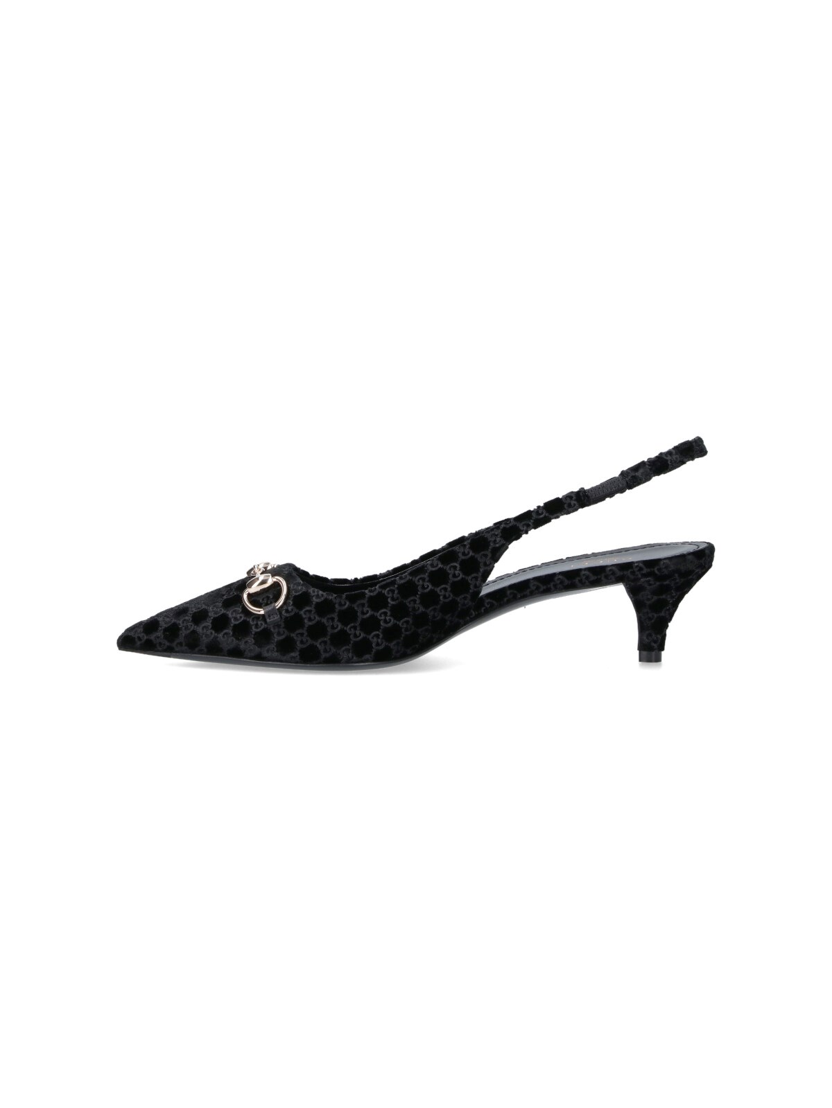 Gucci "Horsebit" black velvet slingback pumps with all-over "GG" logo pattern, gold metal "Horsebit" hardware on the front, elasticized strap, slip-on fit, leather sole.