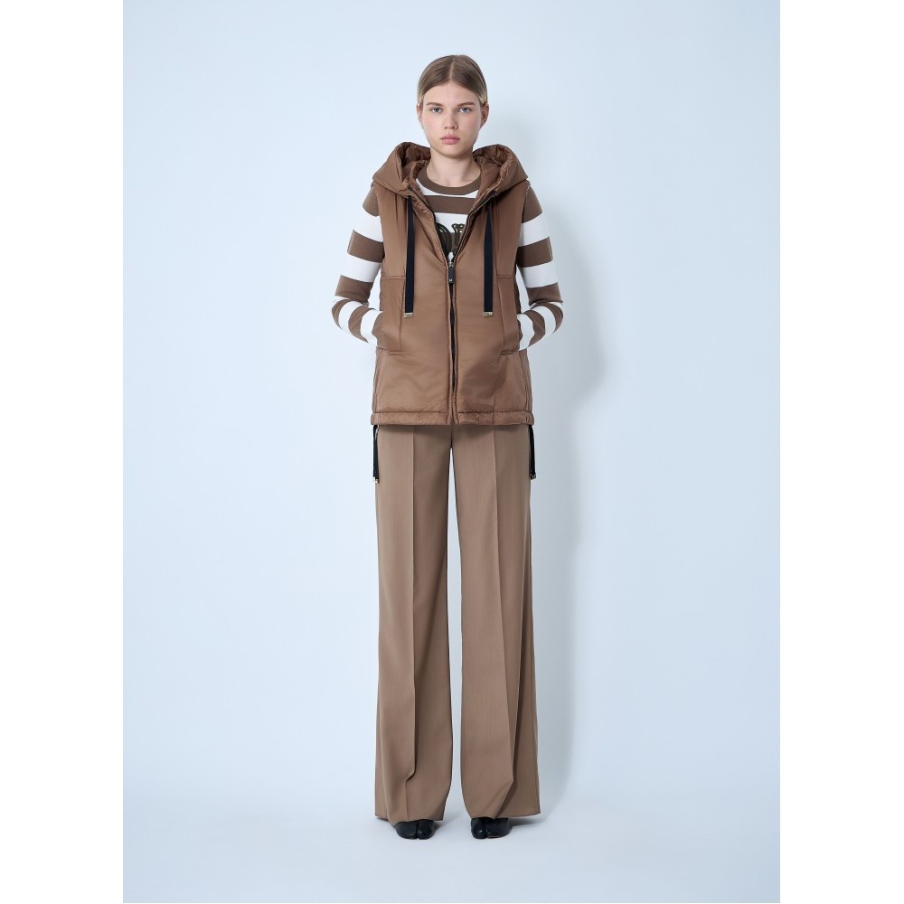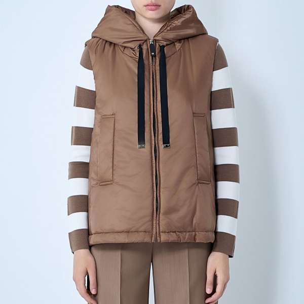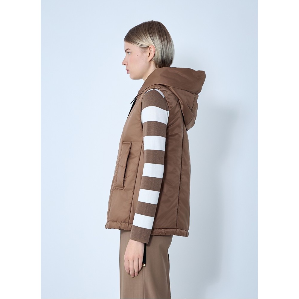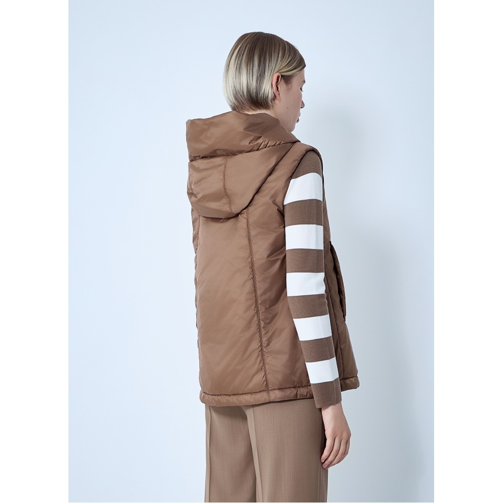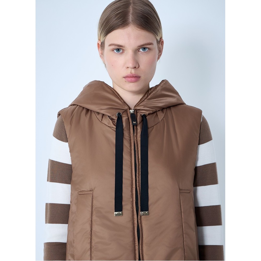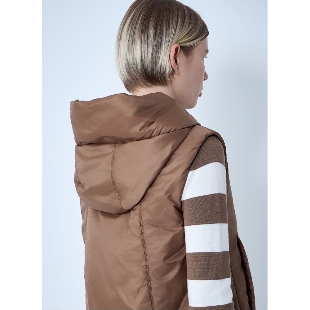 Quilted puffer gilet with drawstring hood.