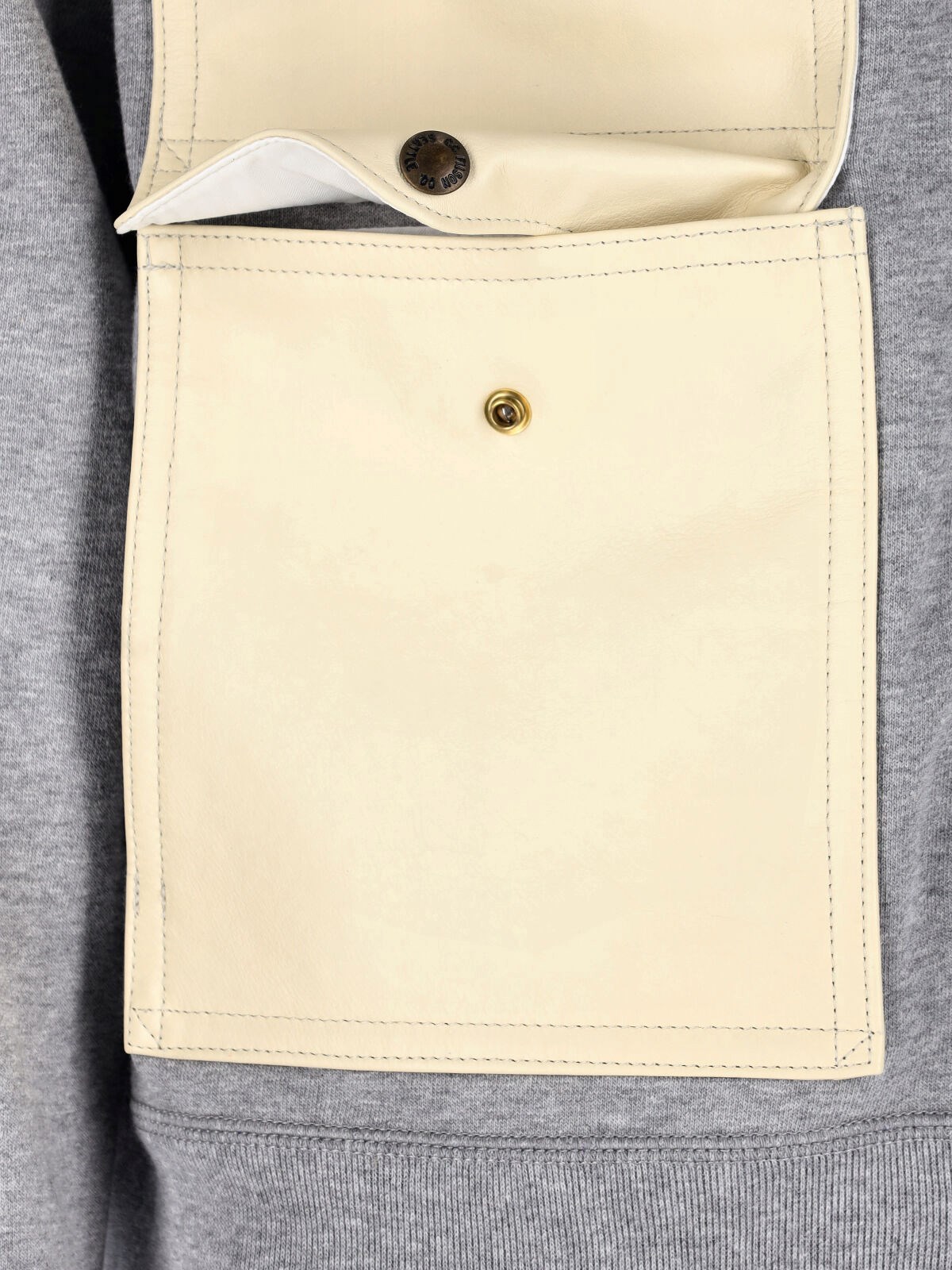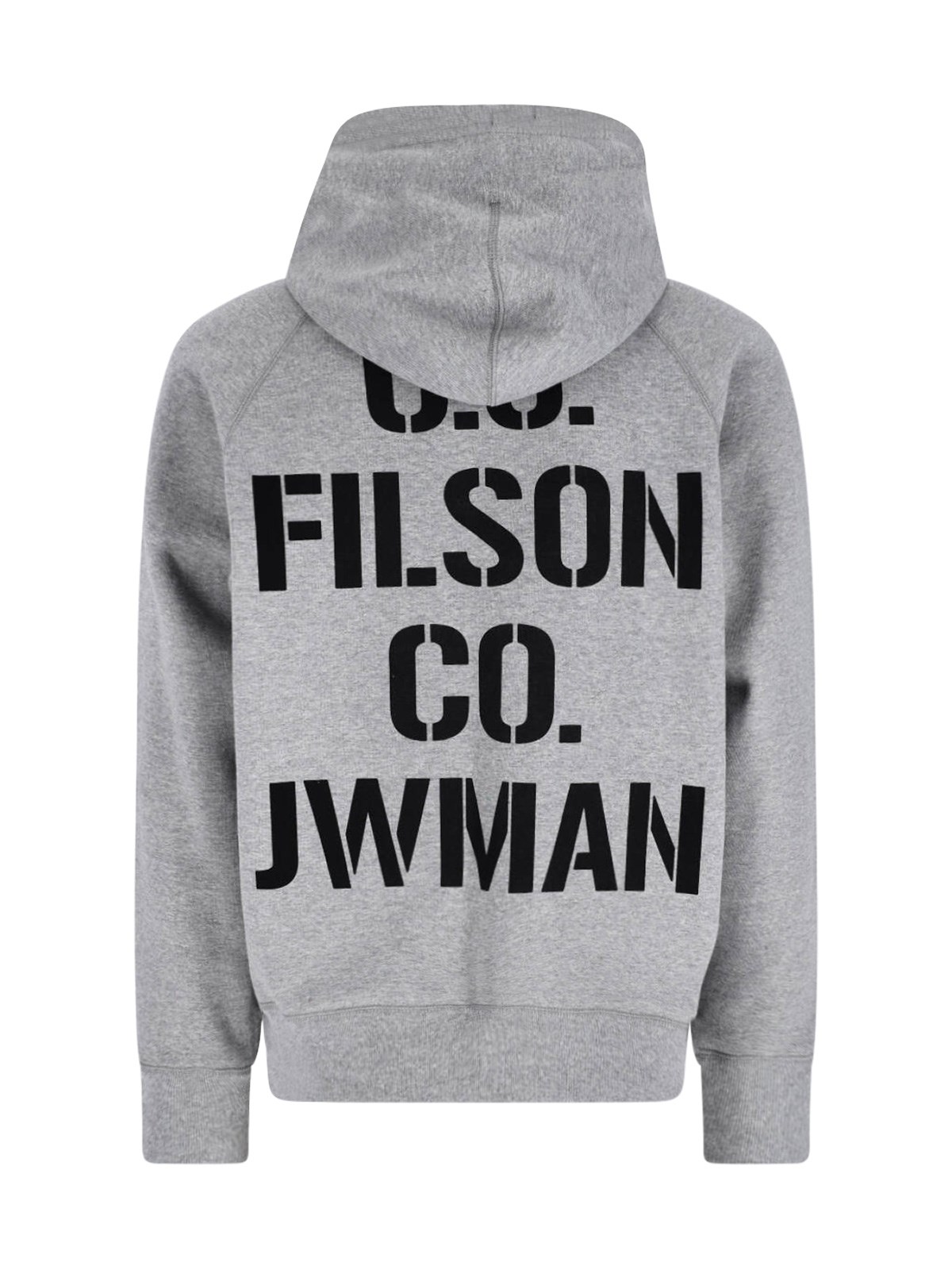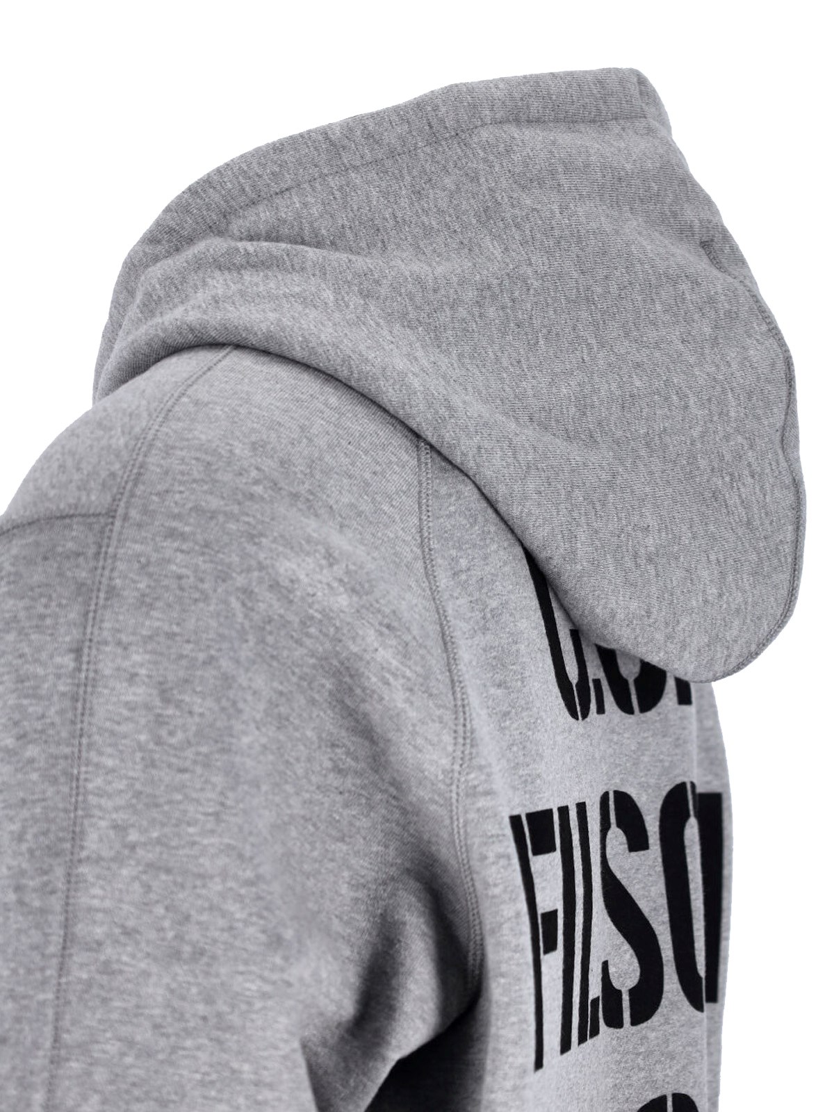 Junya Watanabe Filson sweatshirt in gray cotton with drawstring hood, zip closure, four cream leather patch pockets on the front, maxi print on the back, elastic trim, and straight hem.