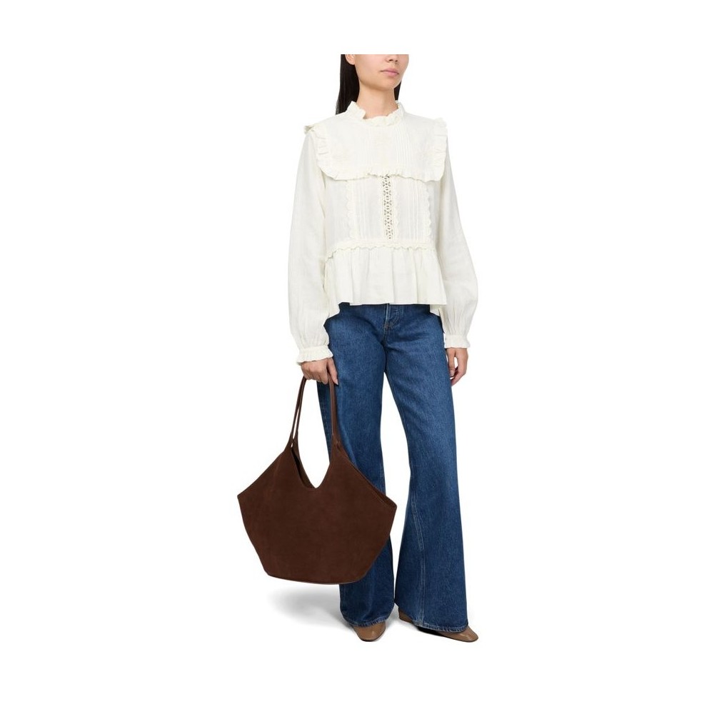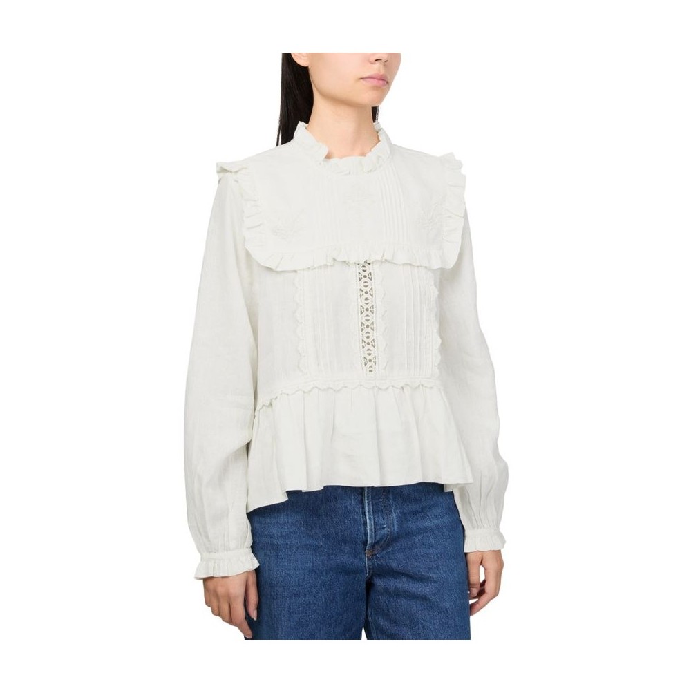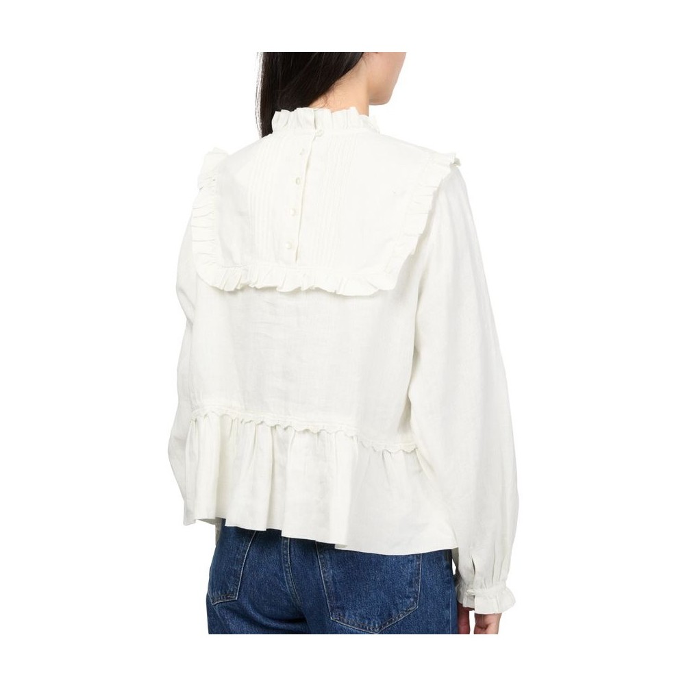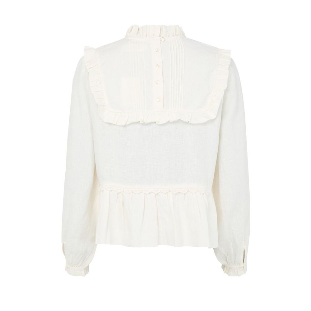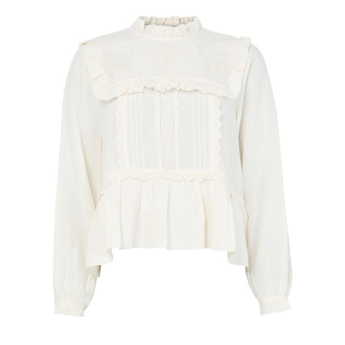 Description : High-neck, ruffled sleeve, long-sleeved, front panel / front paneling, back panel, ruffled and pleated details, gathered at the waist, back buttoned fastening, ruffle details, lace details.