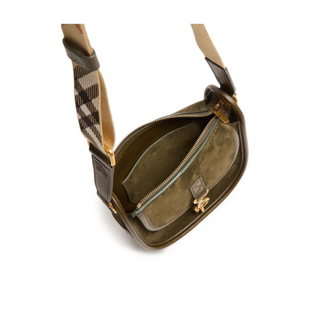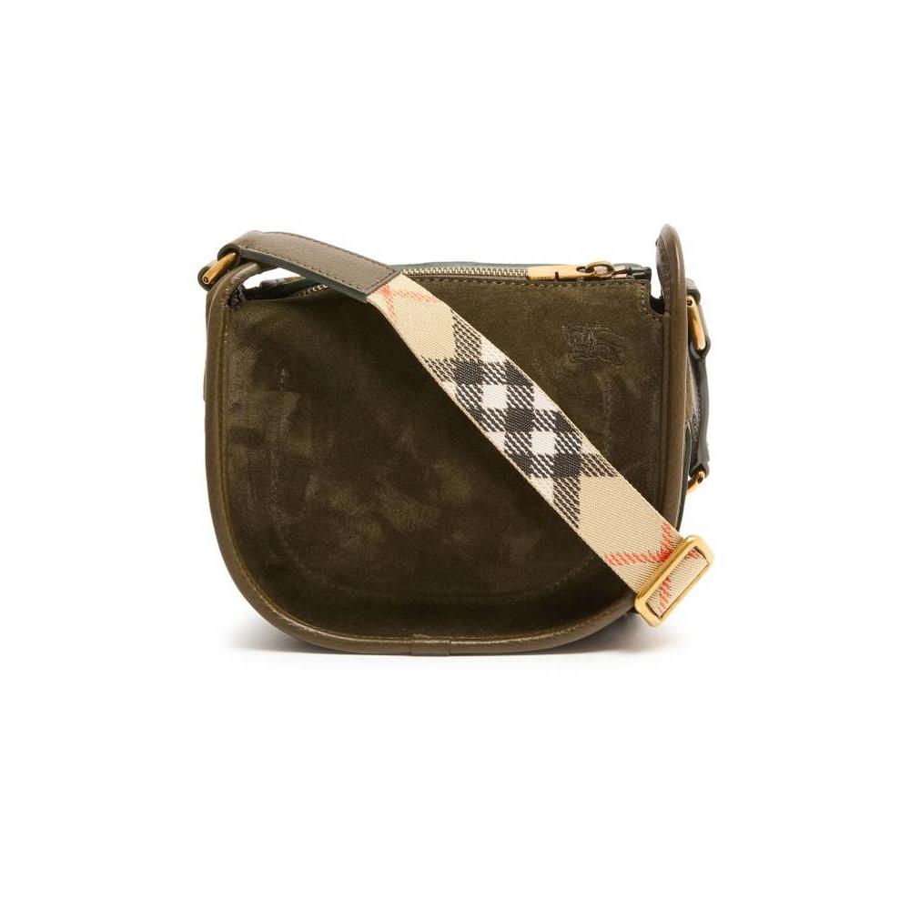 Description : Crossbody bag, shoulder bag, messenger bag, burberry Check, wide strap, adjustable, detachable strap, front logo, suede, grained leather, zipper closure.