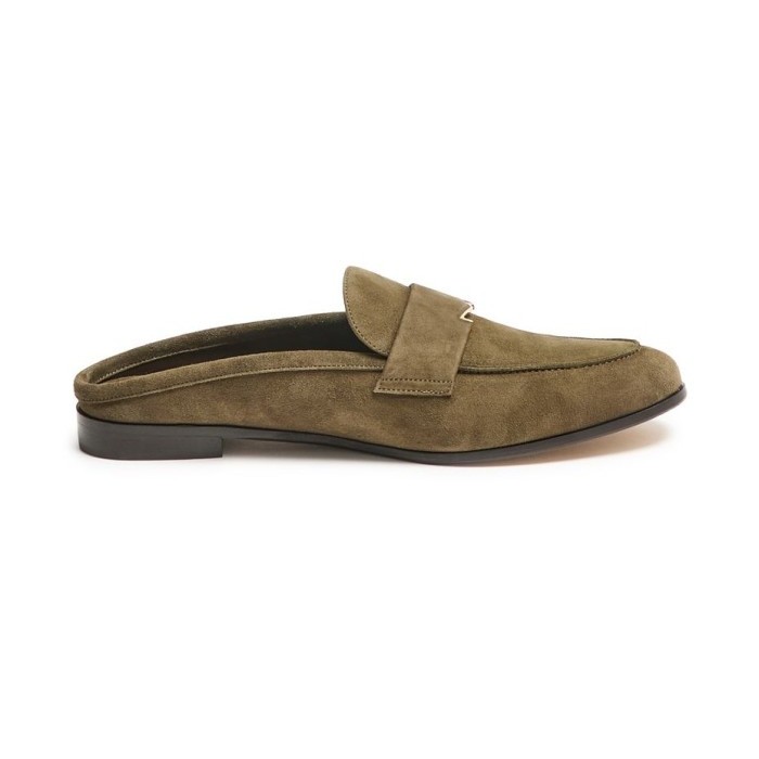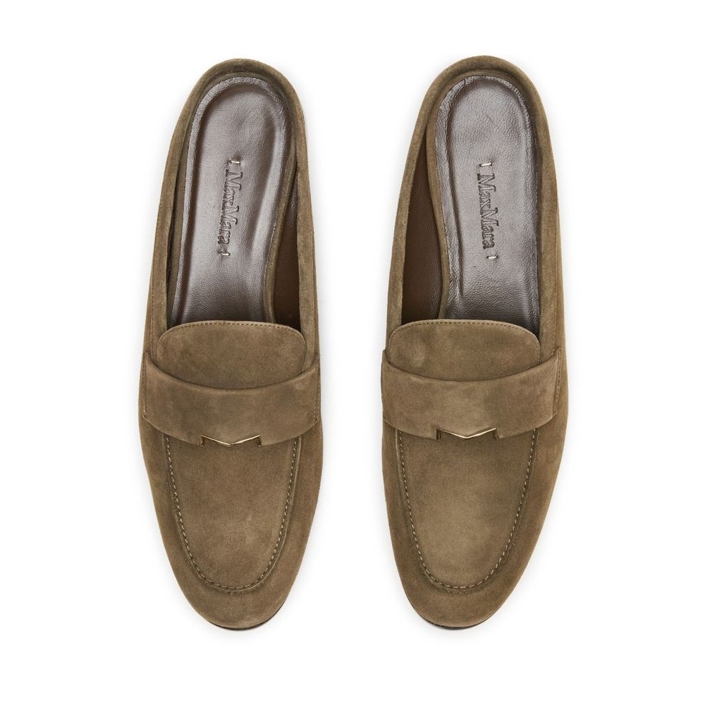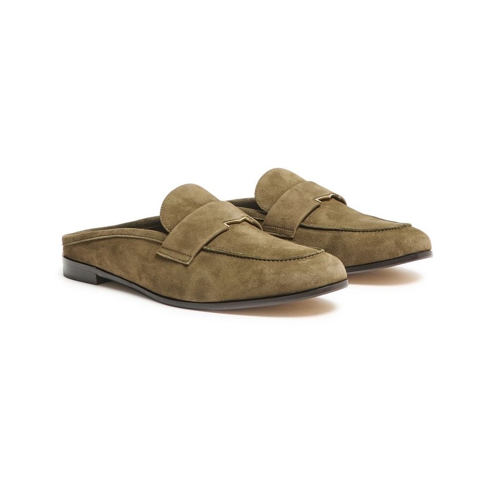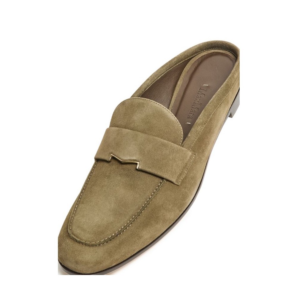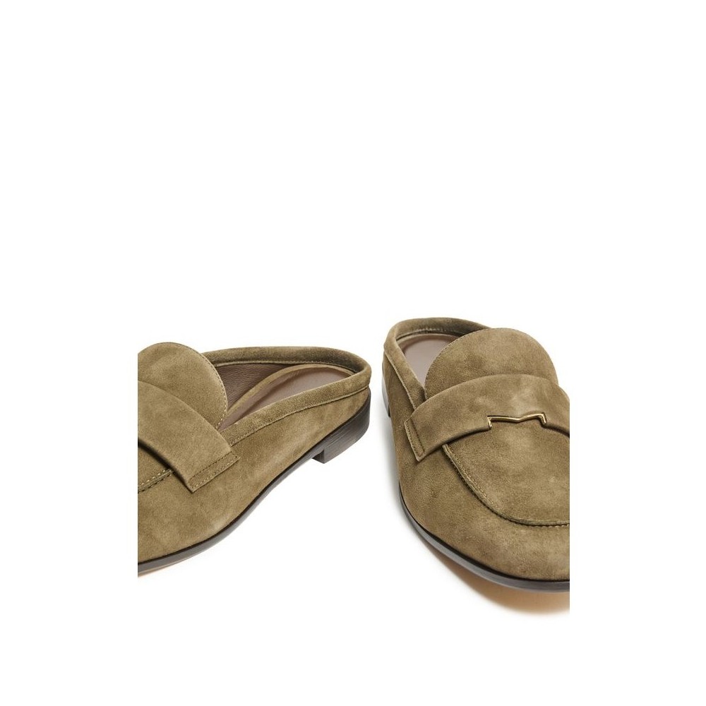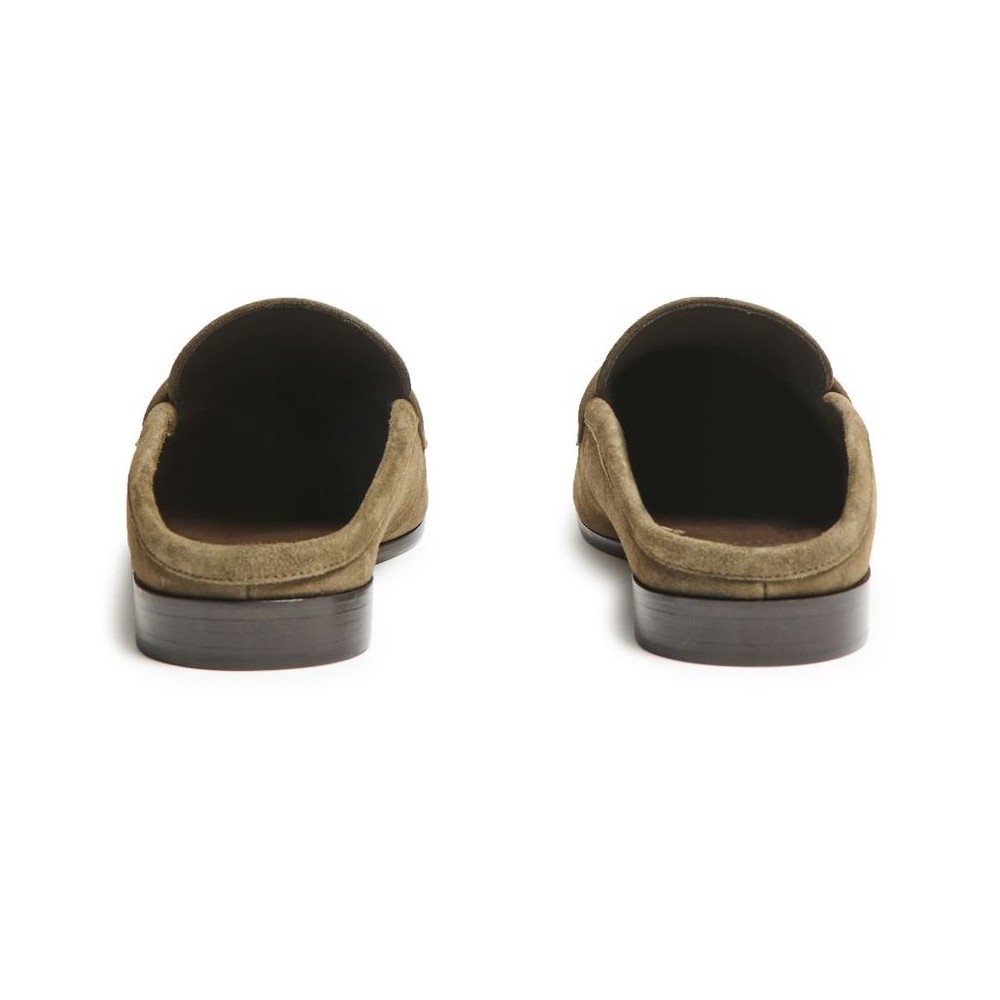 Description : Mules, engraved logo, suede, low heel, closed, round toe, visible stitching.