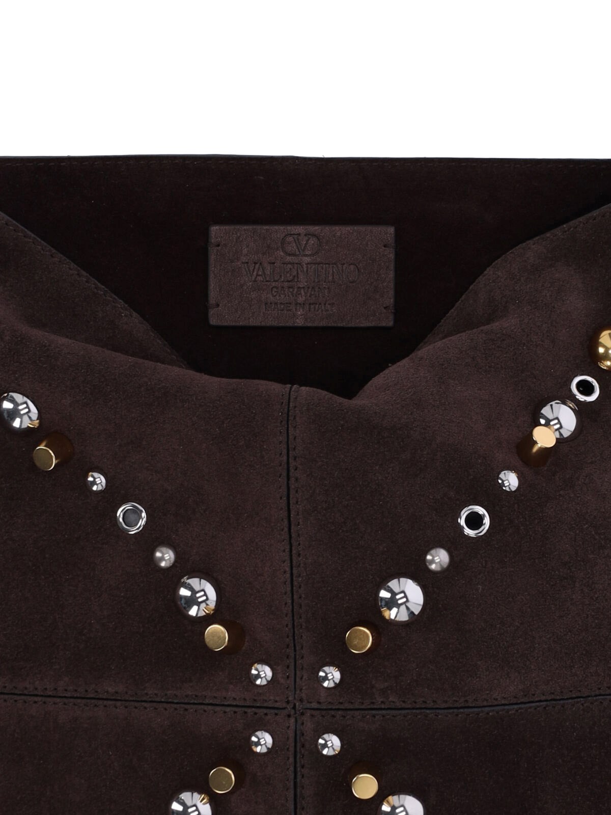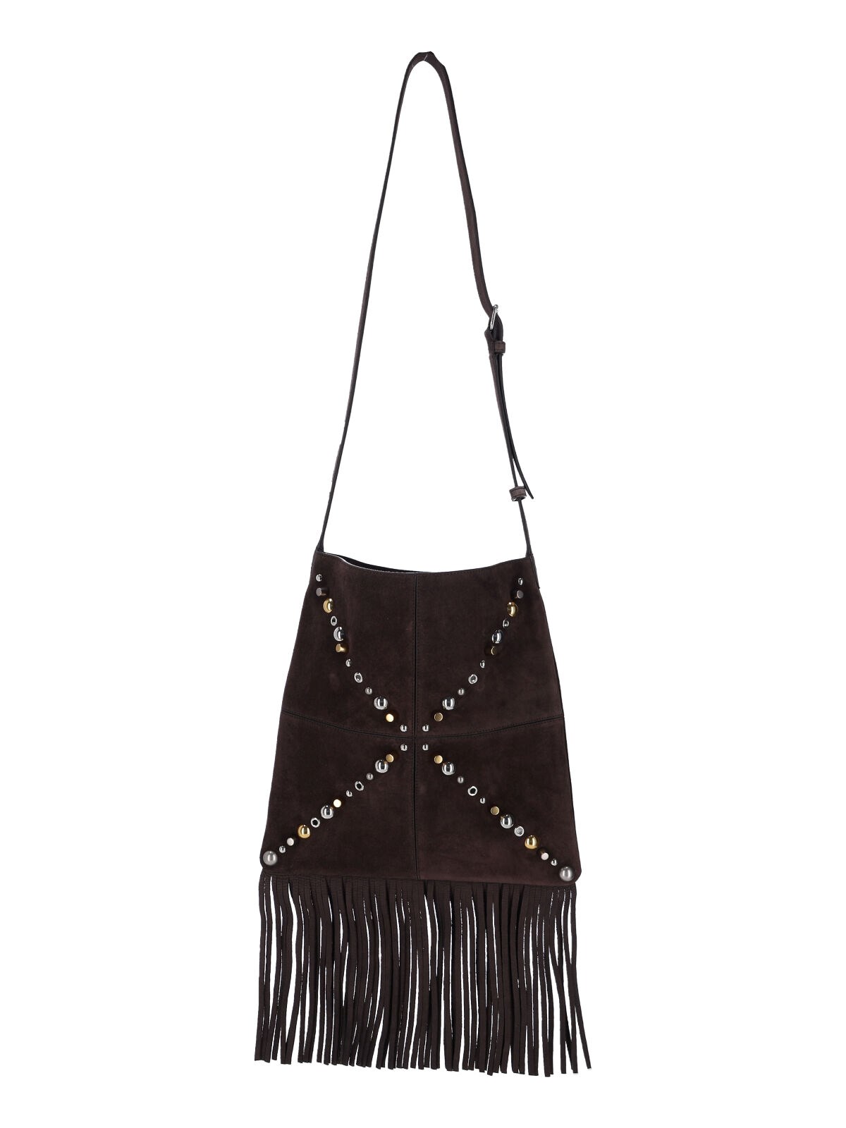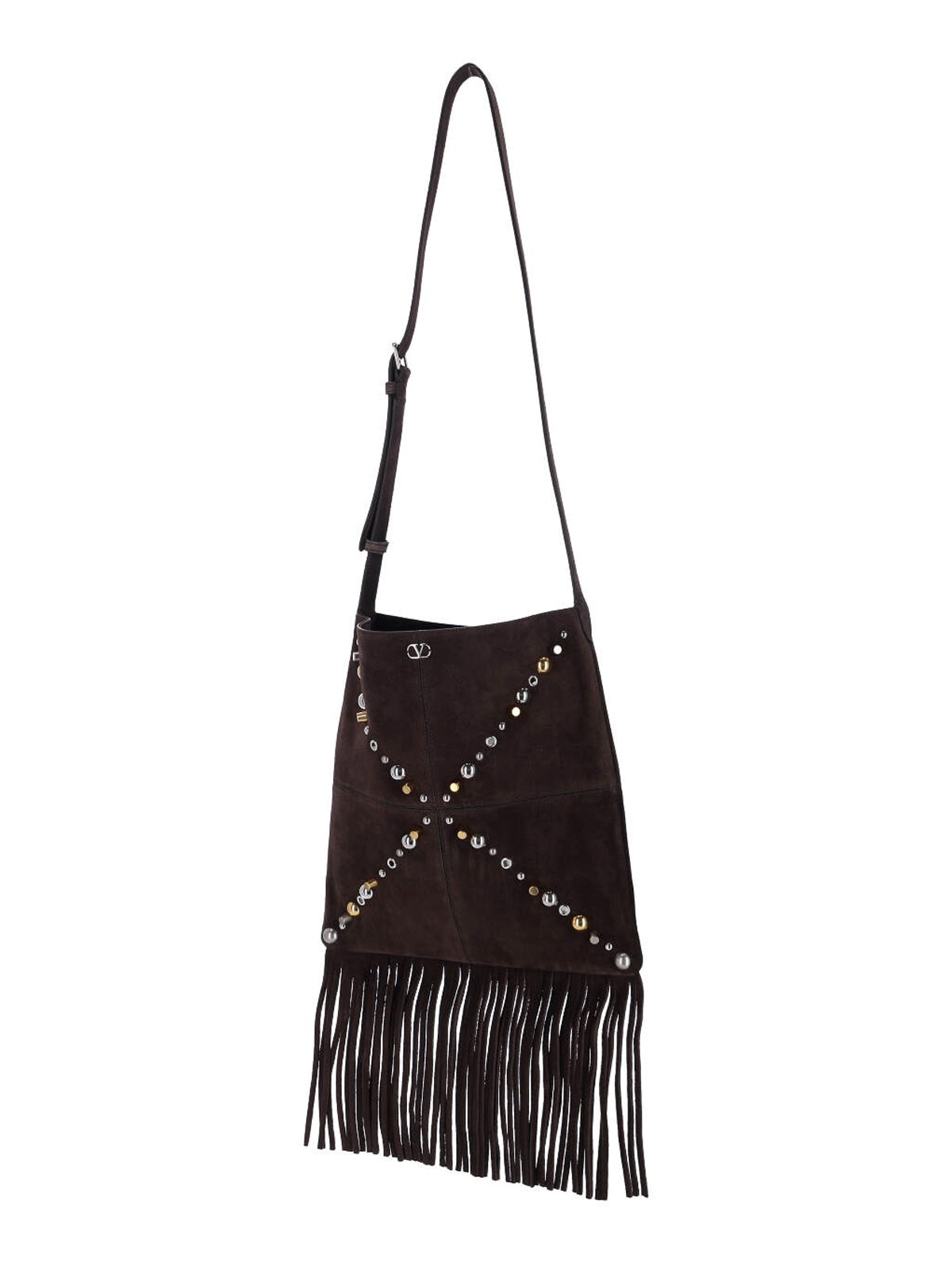 Valentino Garavani Nellcoete shoulder bag in brown suede with adjustable shoulder strap, gold and silver metal studs on the front and back, VLogo signature logo on the front, fringes on the bottom, and a main inner compartment.