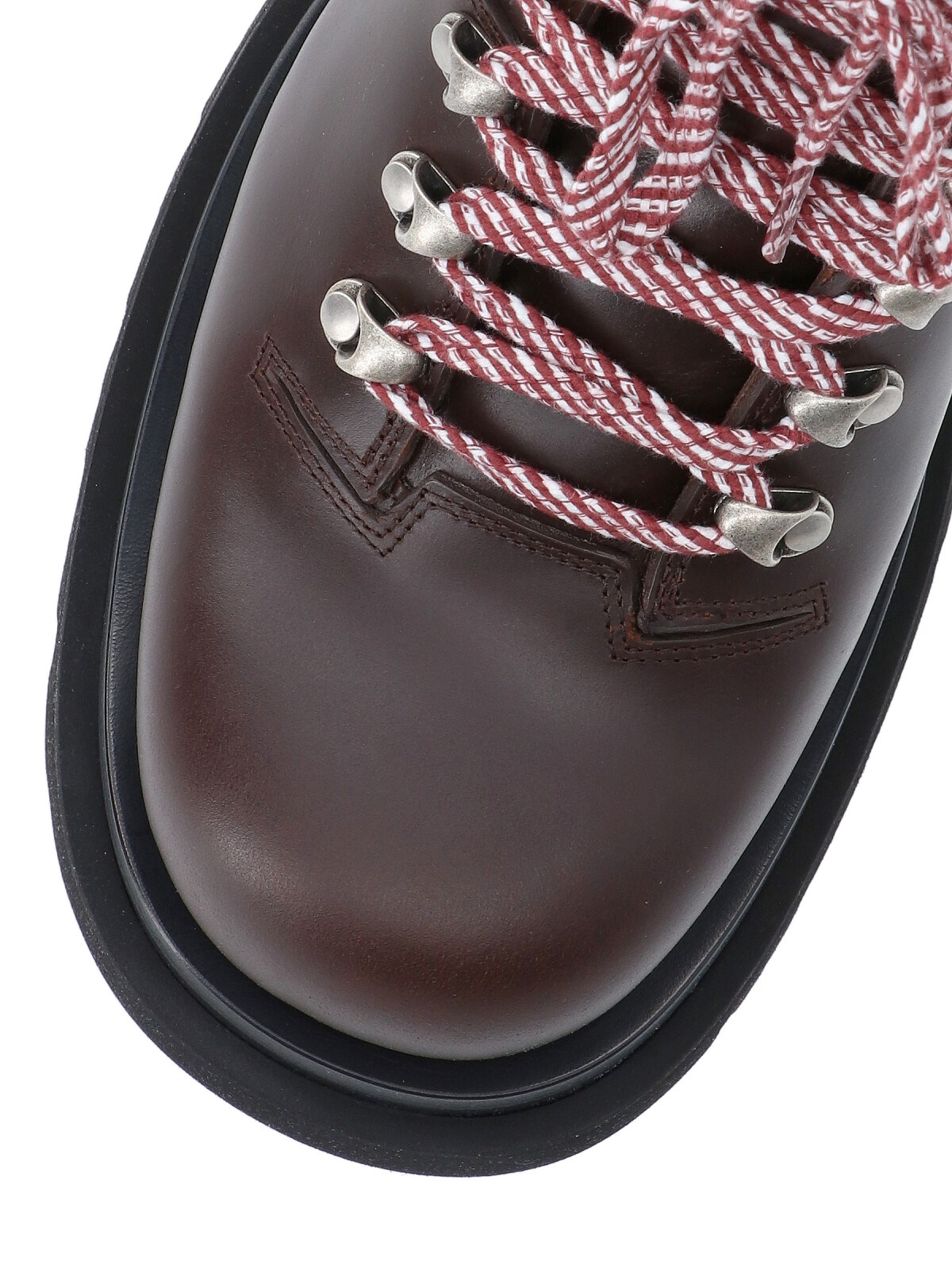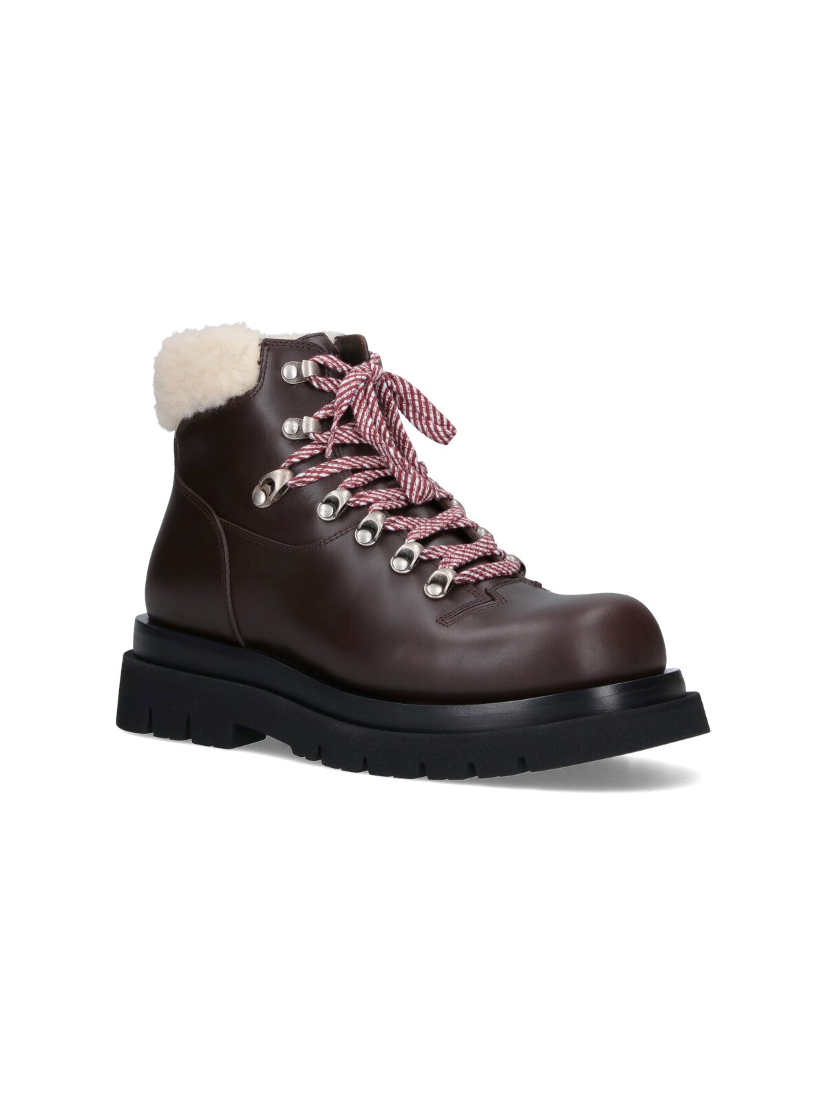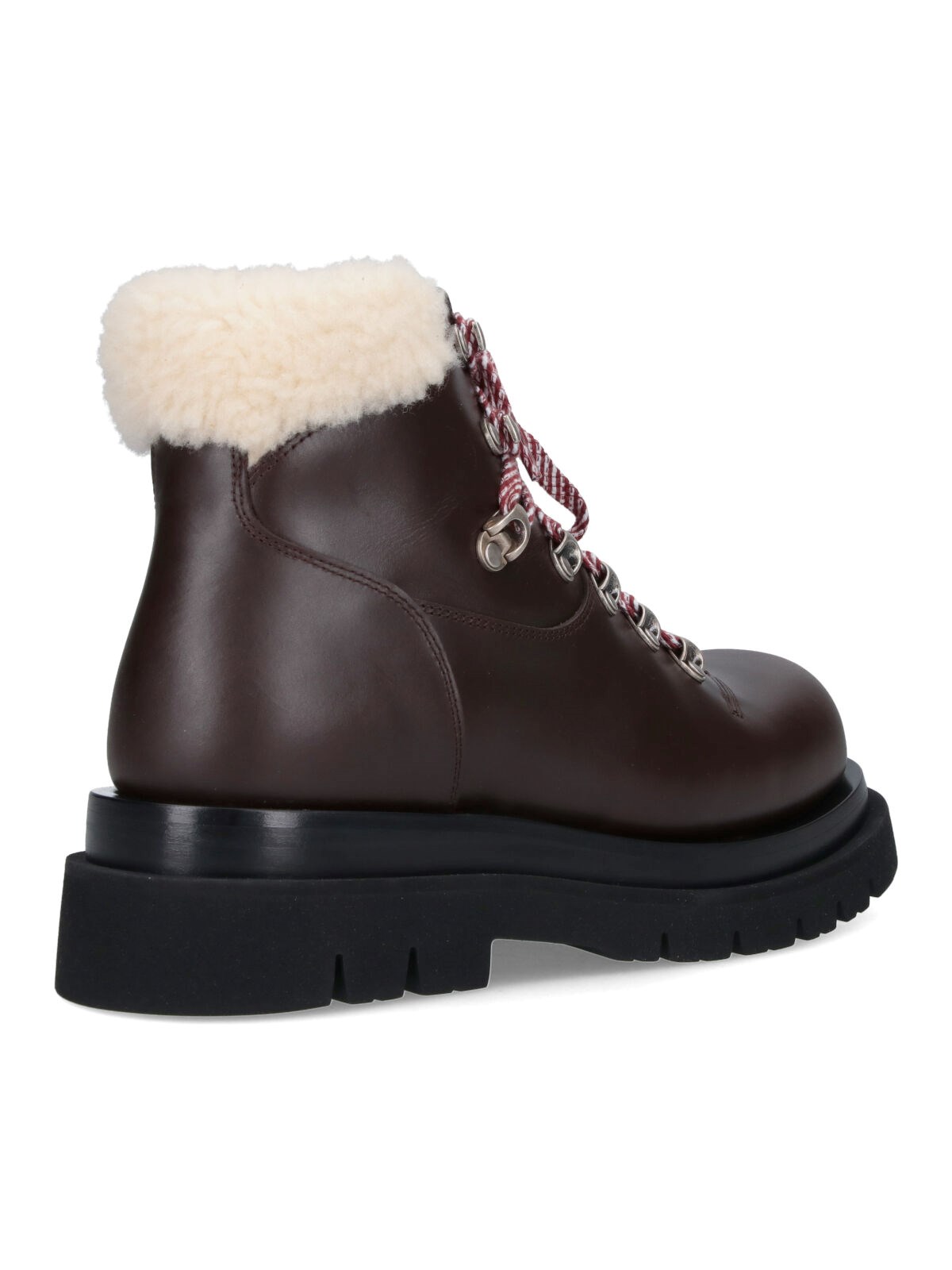 Bottega Veneta "Lug" ankle boots in brown calf leather with round toe, lace-up closure, silver metal details, shearling collar, logo embossed on the front tab, rubber sole.