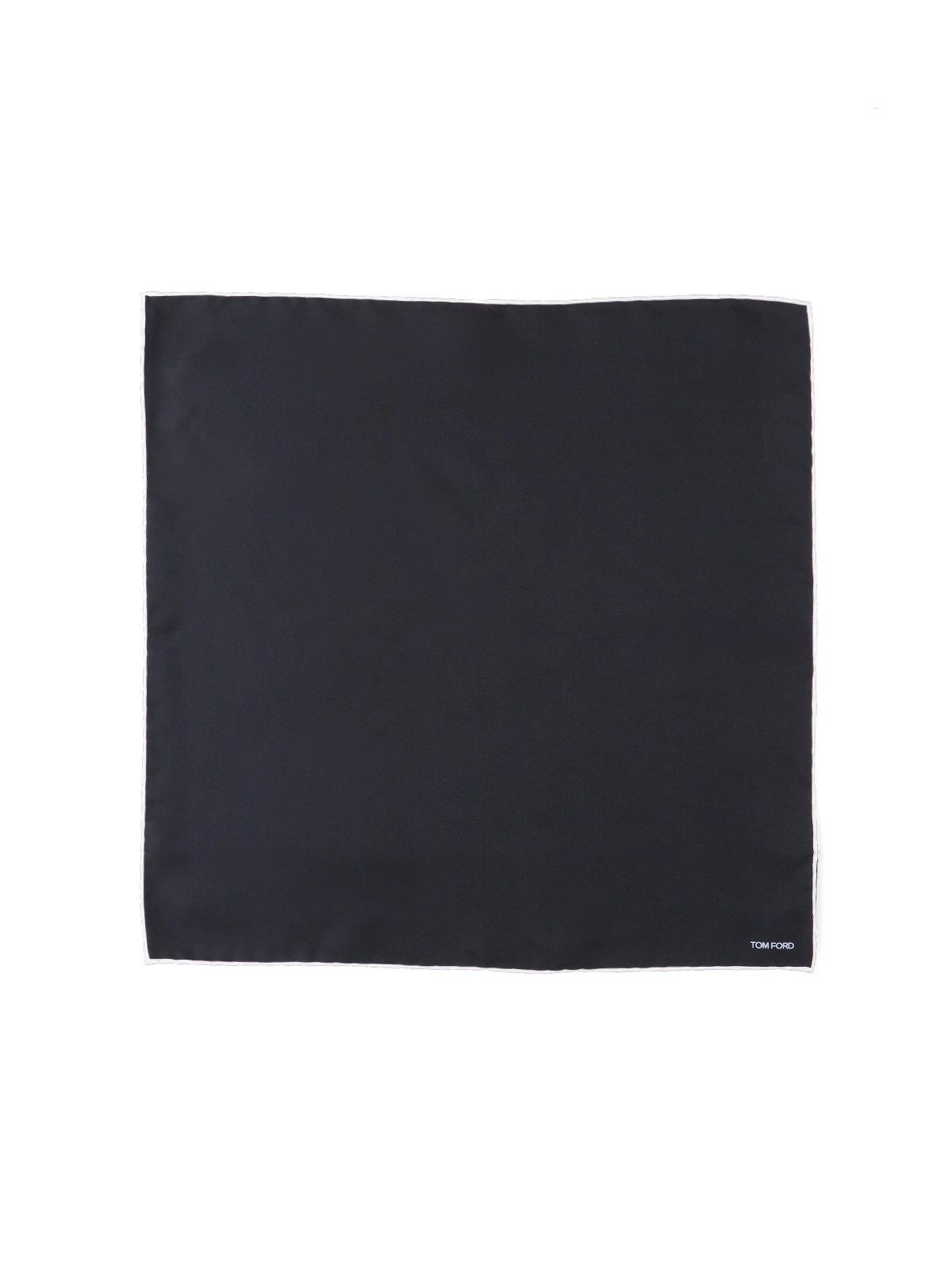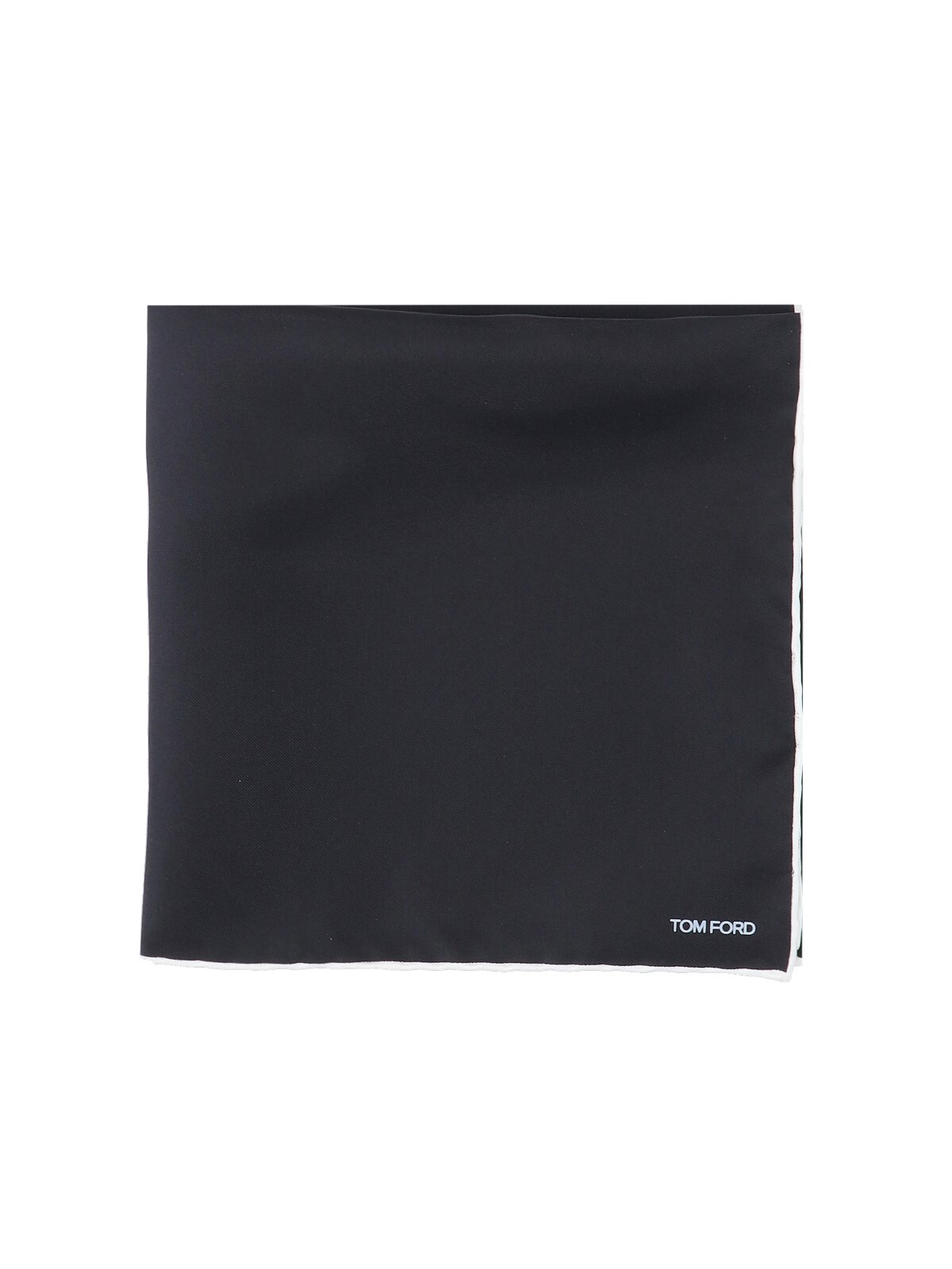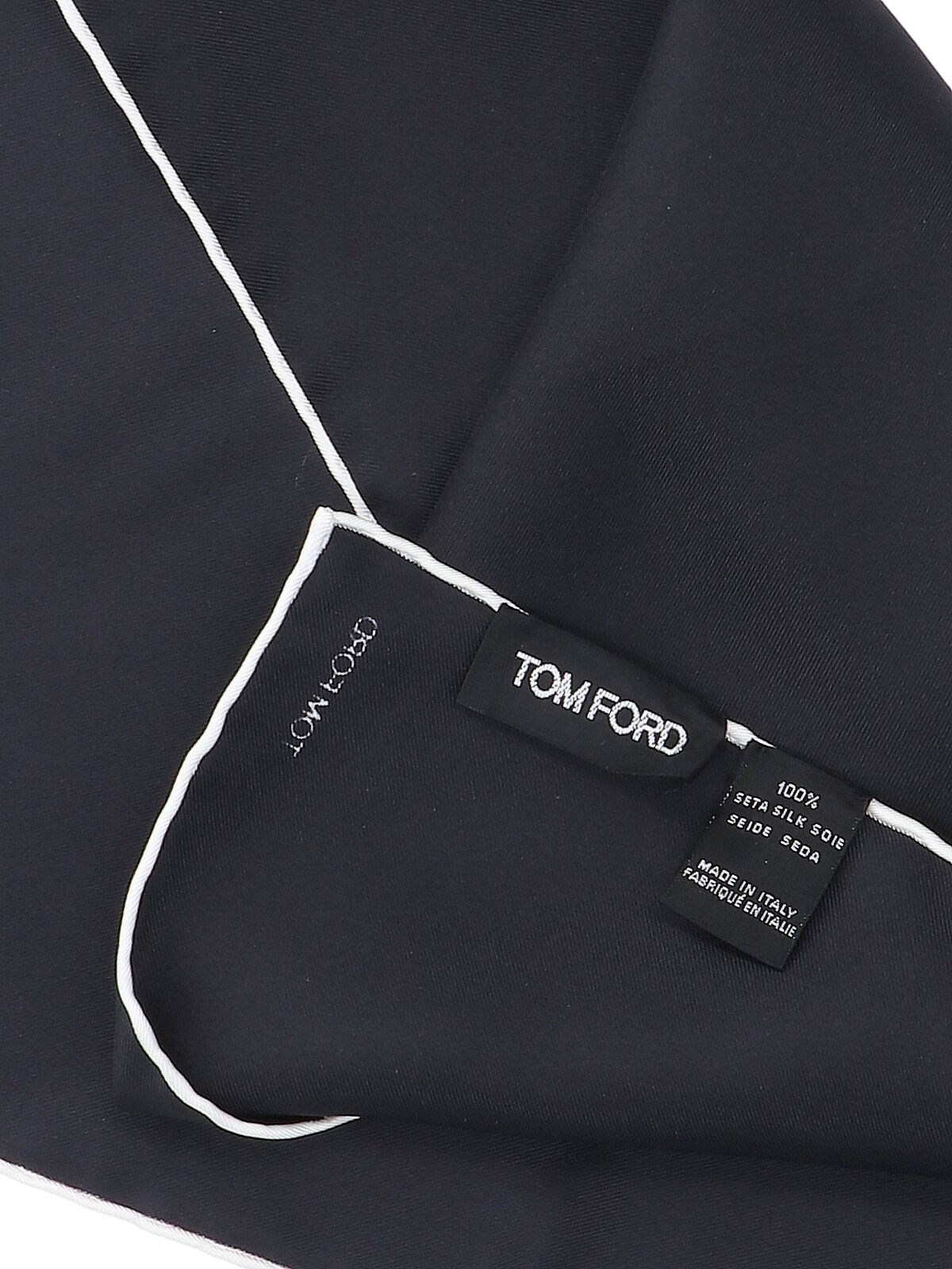 Tom Ford black silk pocket handkerchief with square design, logo detail printed on the front.