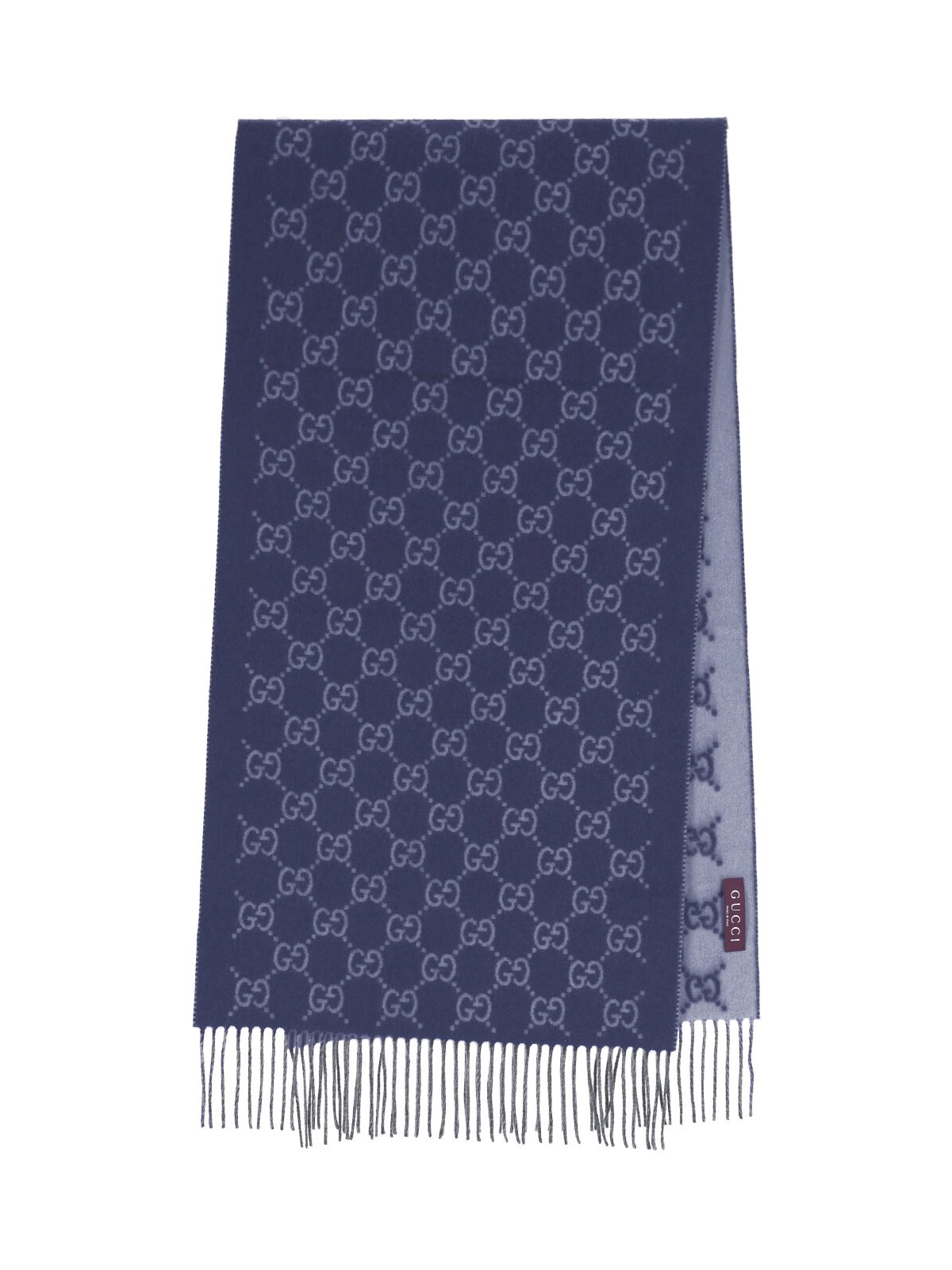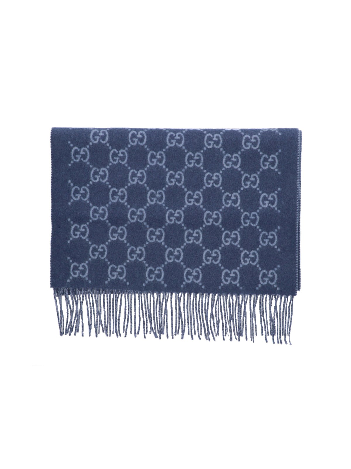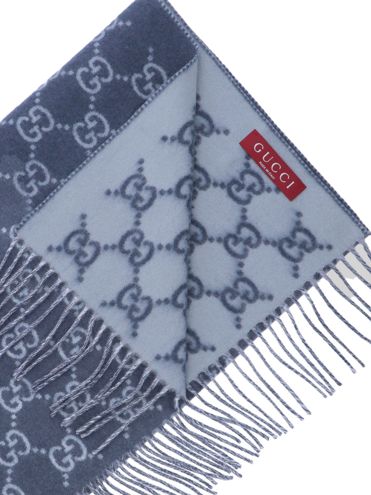 Gucci "GG" blue cashmere scarf with all-over contrasting GG jacquard pattern, back logo label, frayed hem.