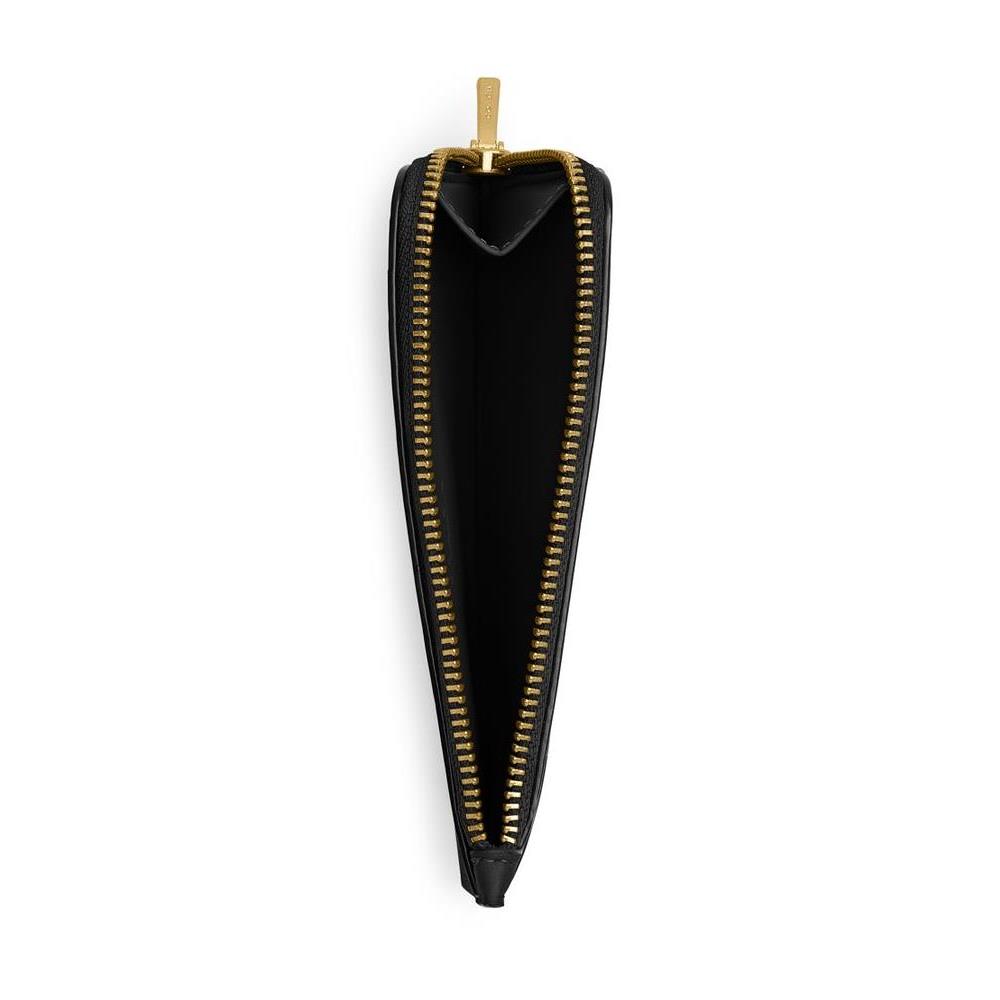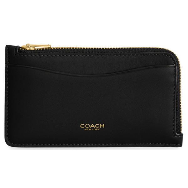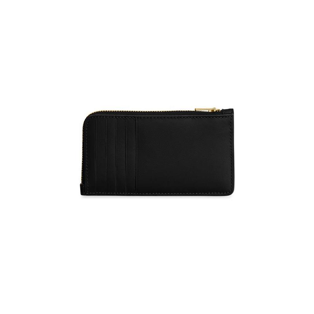 Description : Card holders, logo in gold letters, front logo, smooth leather, zipper closure, visible topstitching, gold finish.
