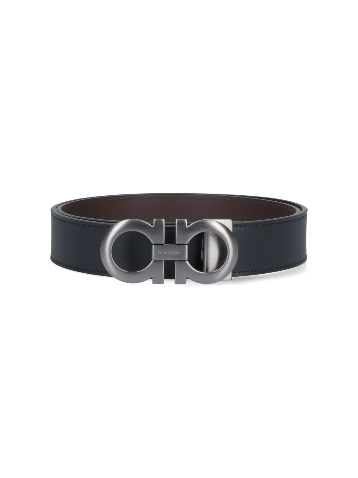Ferragamo "Gancini" reversible belt, in black leather on one side and brown on the other, silver metal buckle closure, adjustable fit.