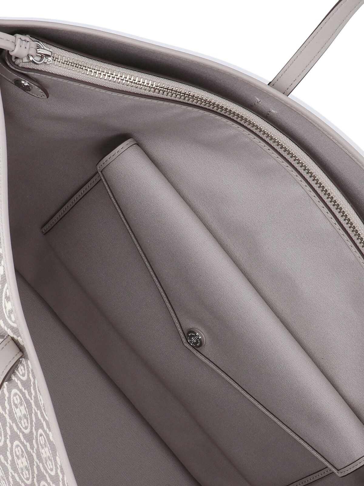 perry T shopper bag tory burch in gray fabric, all-over jacquard "T monogram" pattern, two top handles, a zip compartment with removable button flap pocket, and a single main inner compartment.