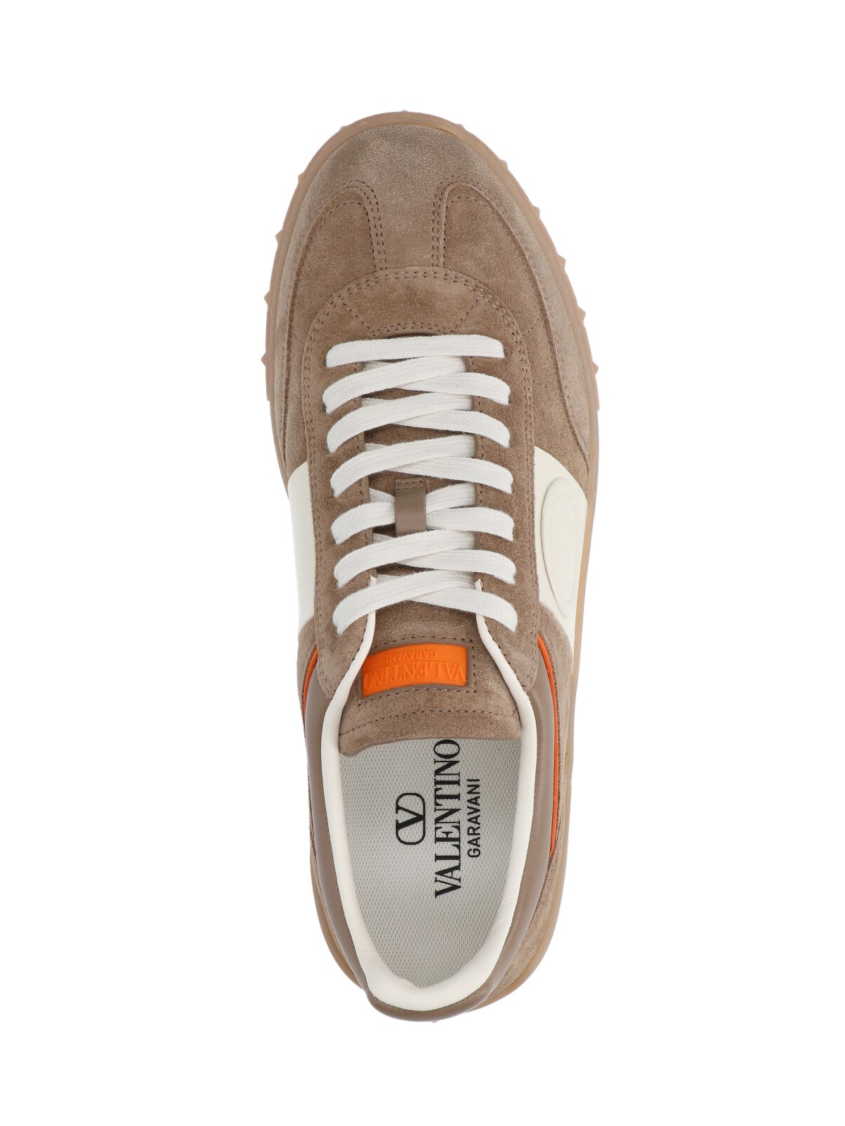 Valentino Garavani "Upvillage" low-top sneakers in brown calf suede with round toe, contrast laces, logo patch on the tongue, side leather inserts, embossed "VLogo Signature" logo detail, rubber sole, embossed logo detail on the side.