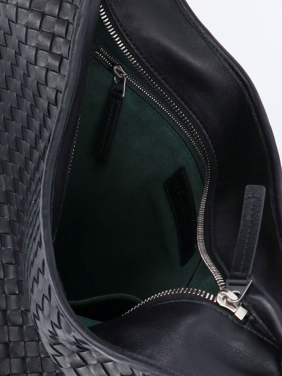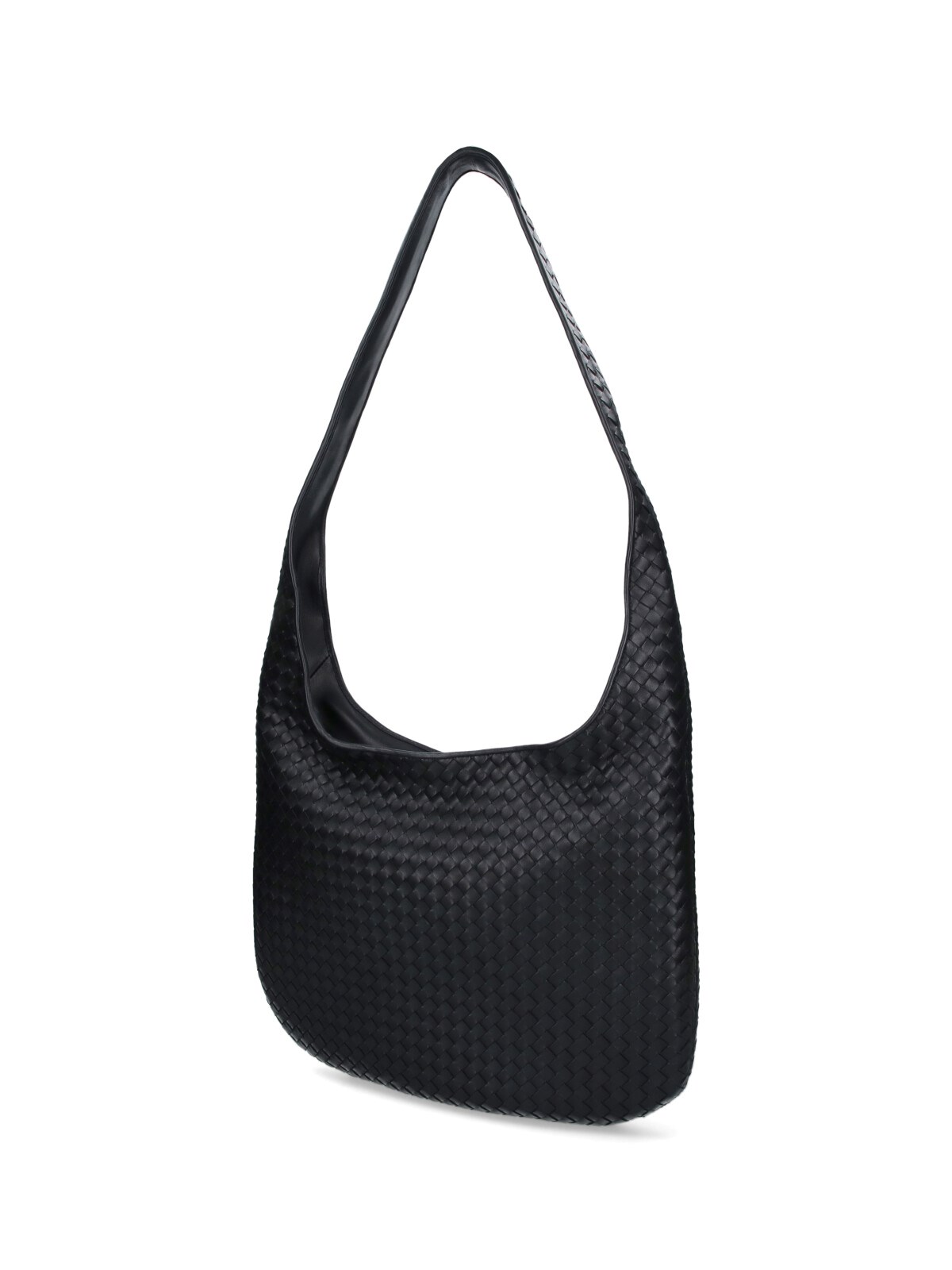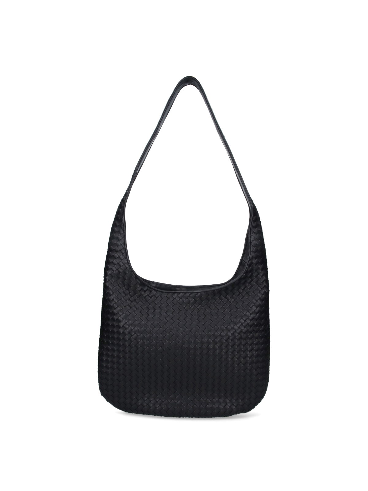 Bottega Veneta "Veneto" crossbody bag in black lambskin with Intrecciato pattern, top handle, zip closure, inner zip pocket, suede lining, single main inner compartment.