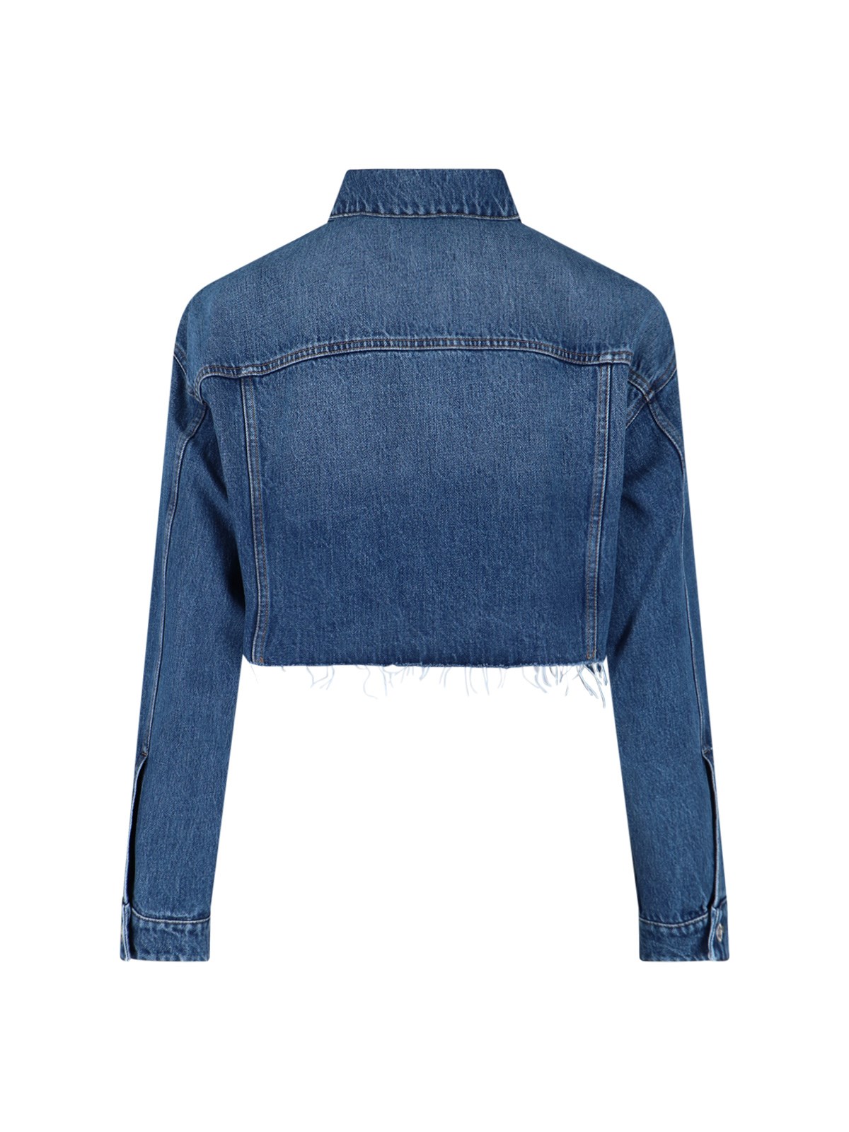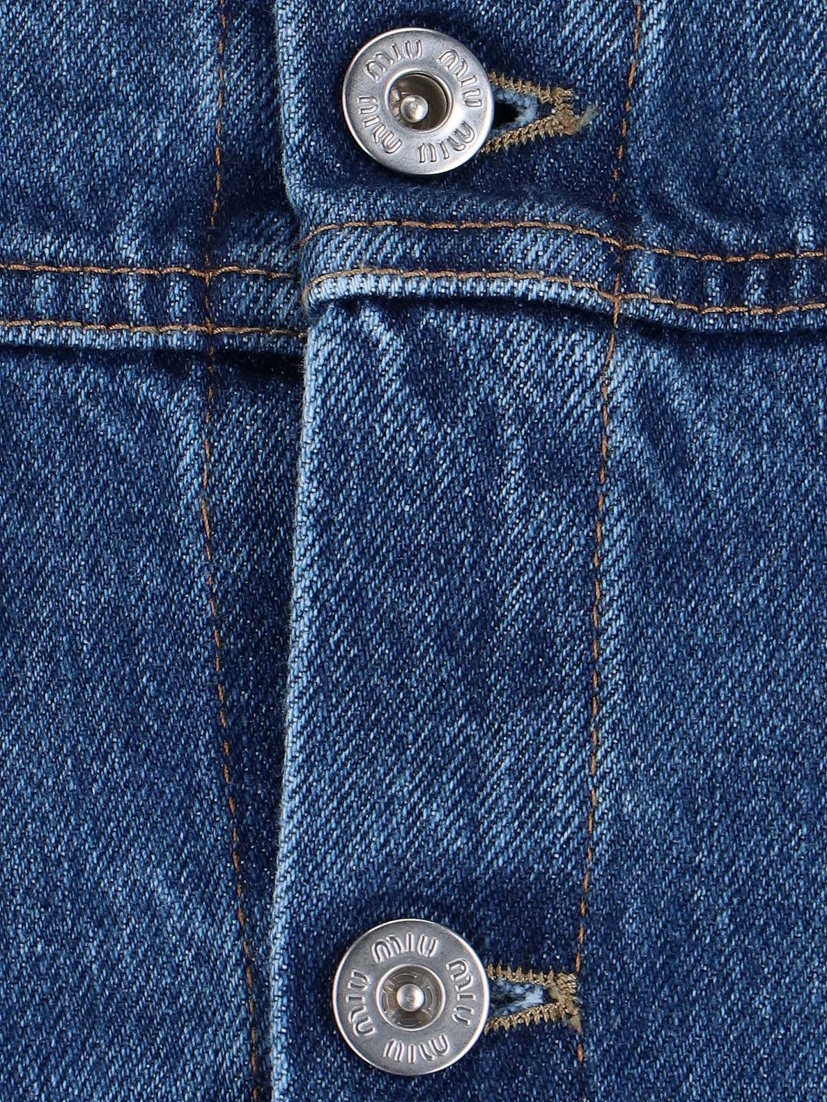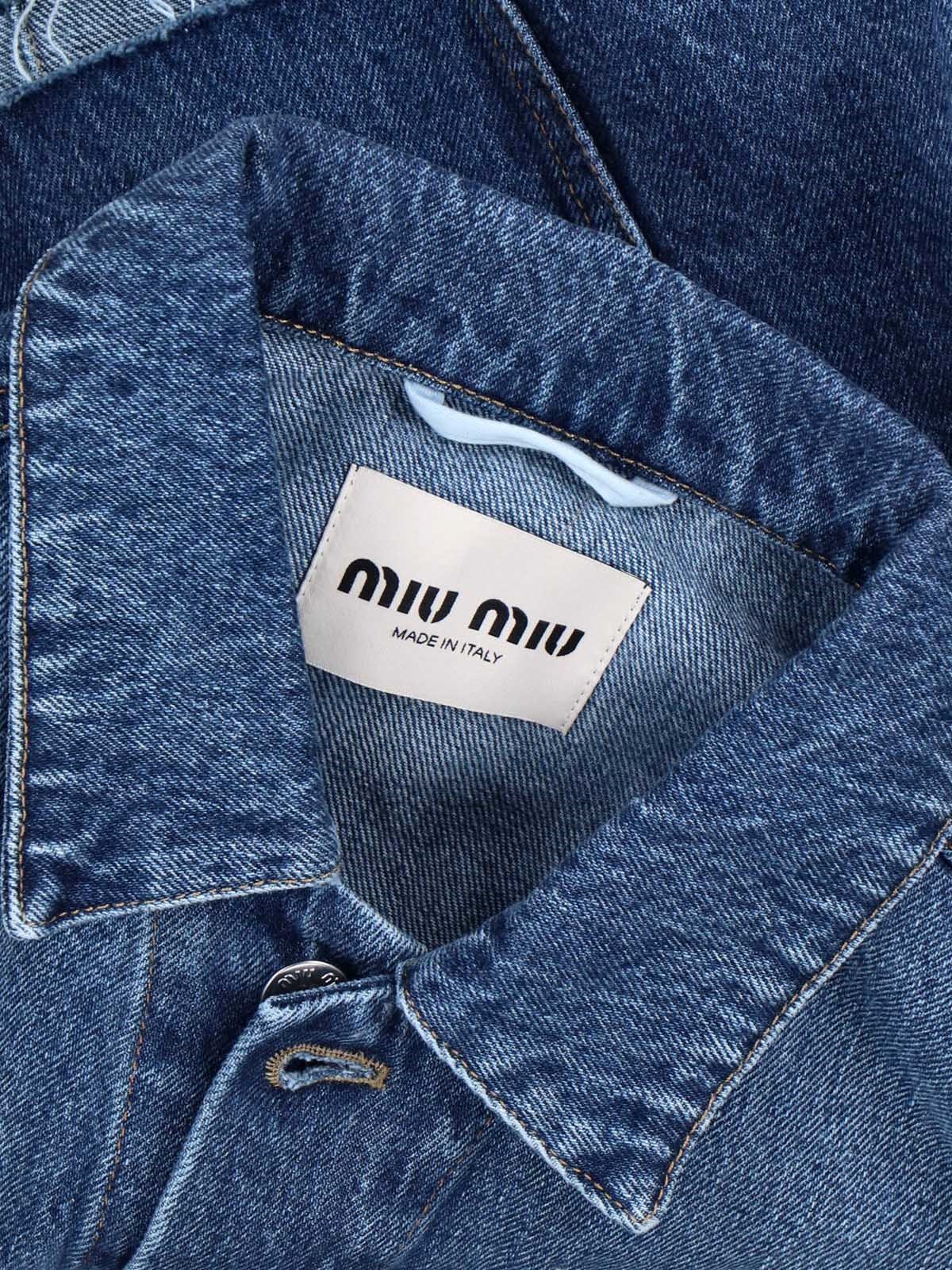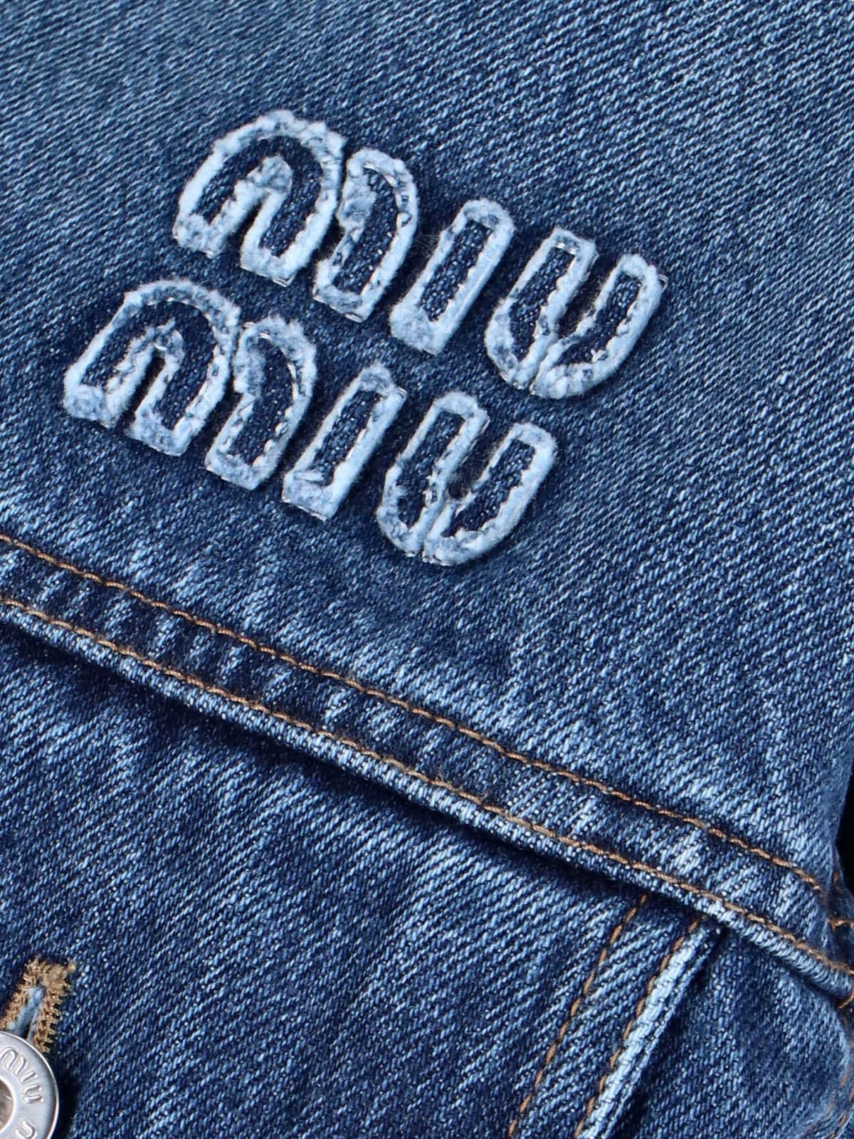 Miu Miu logo crop jacket in blue cotton denim with classic collar, button closure, tone-on-tone logo embroidery on the front, two front button pockets, fringes on the hem, straight hem.
