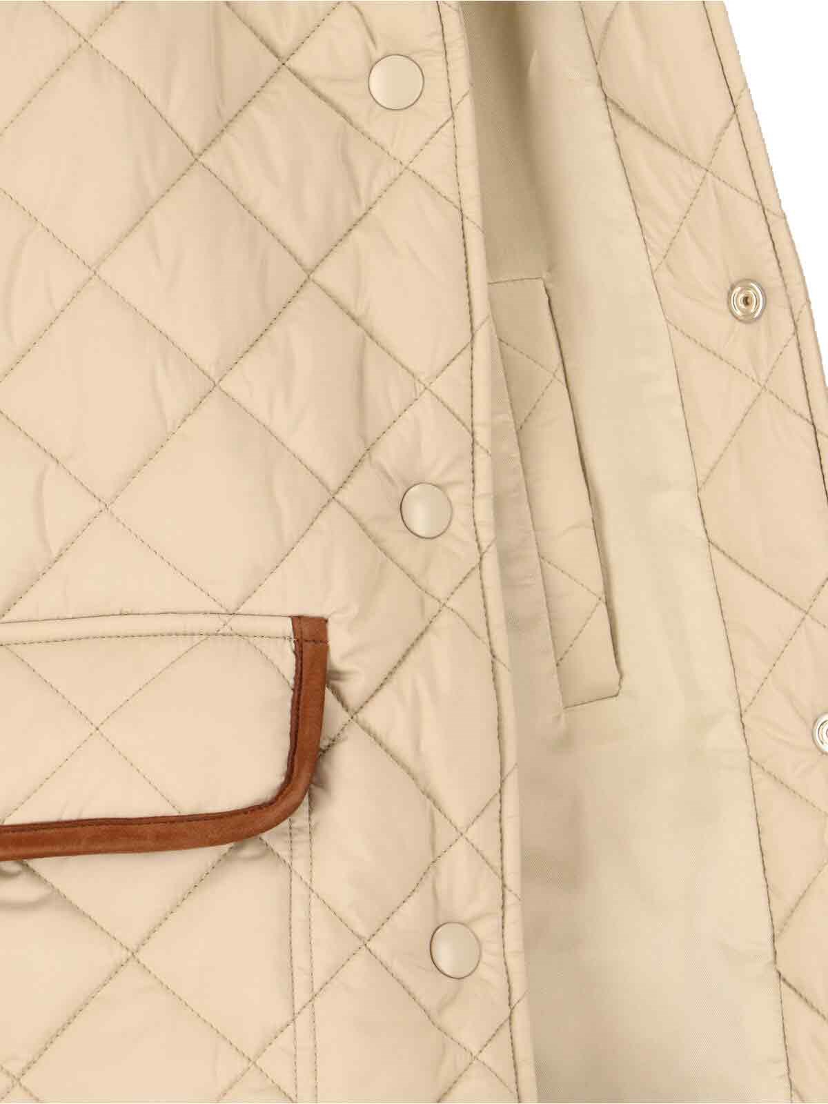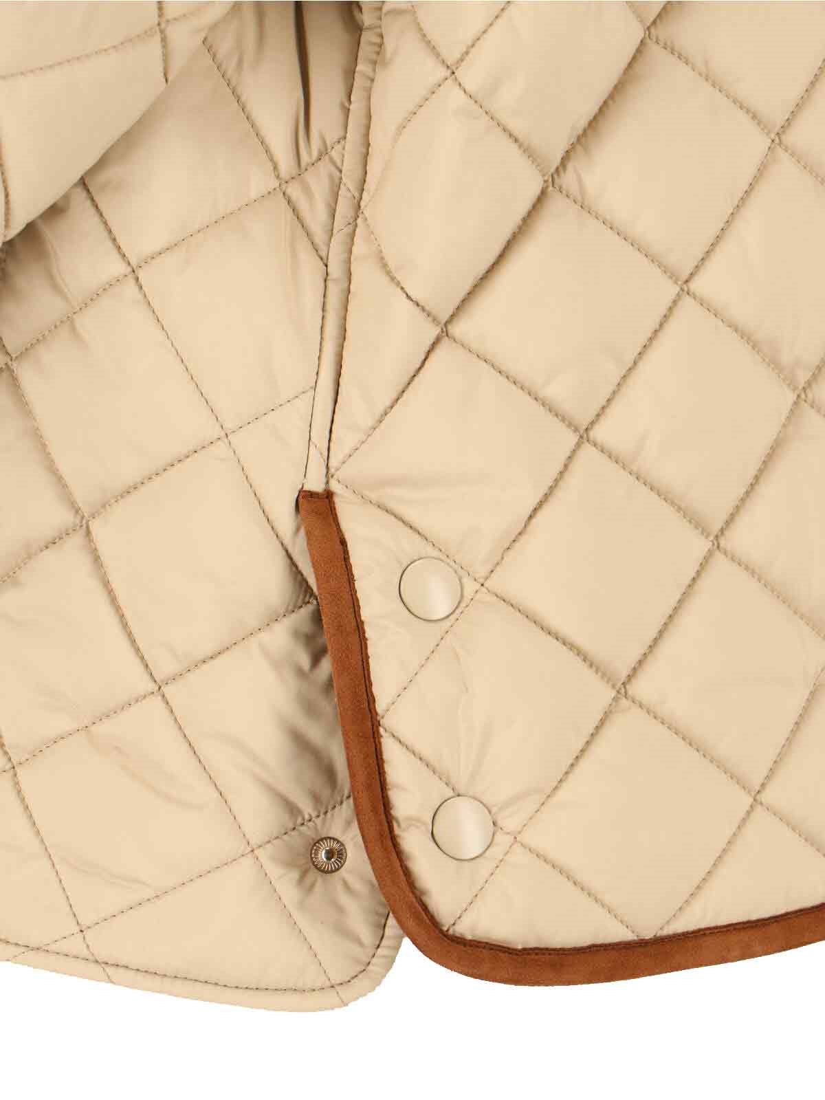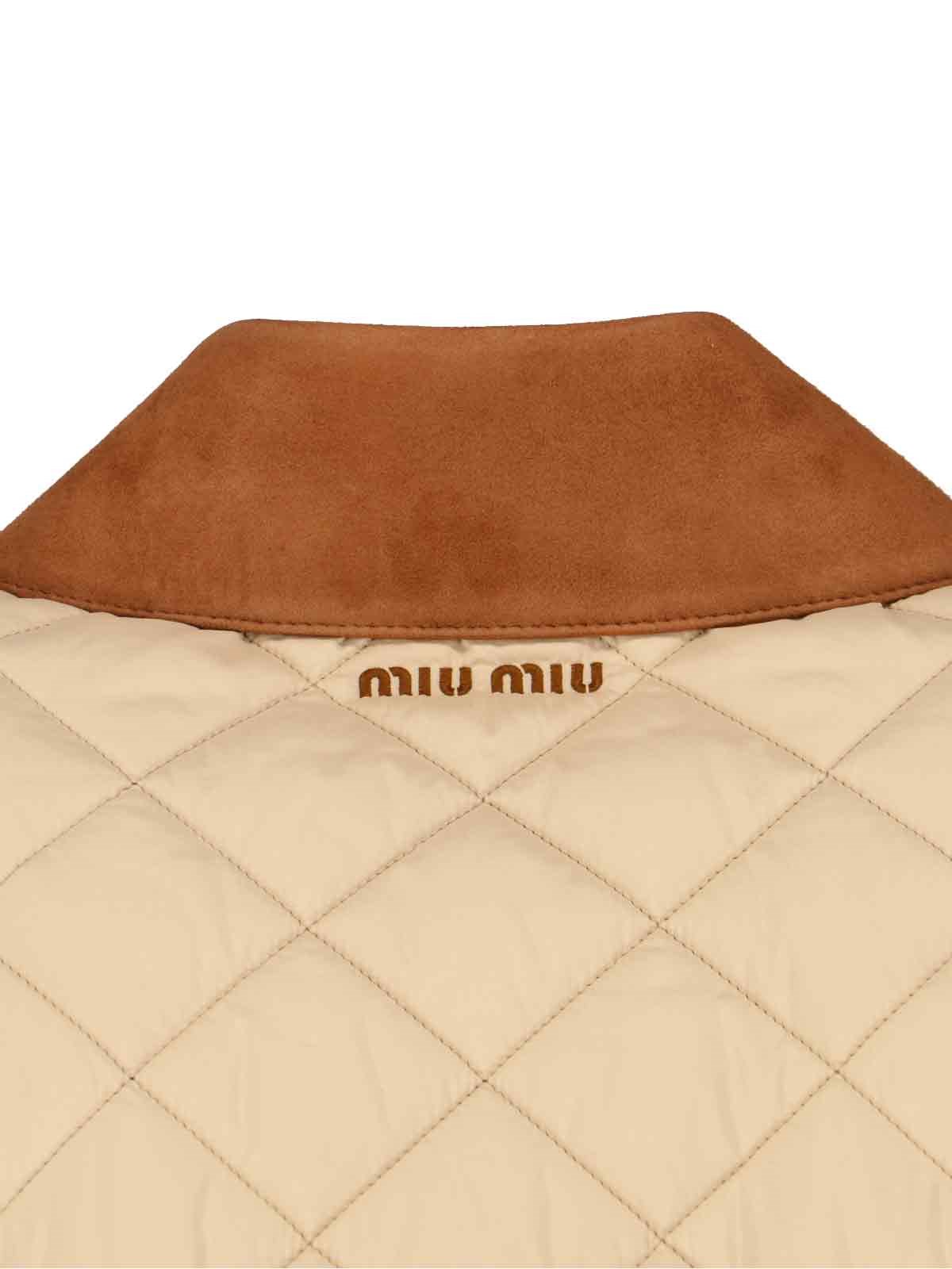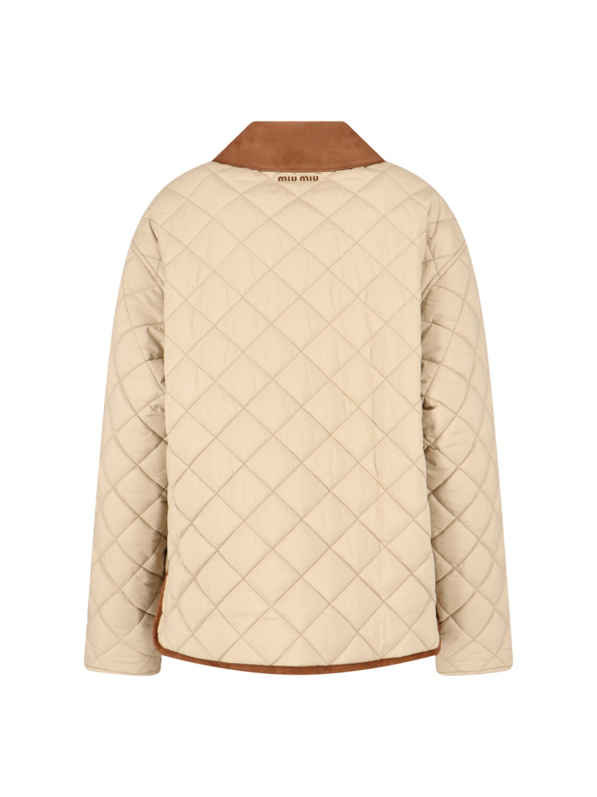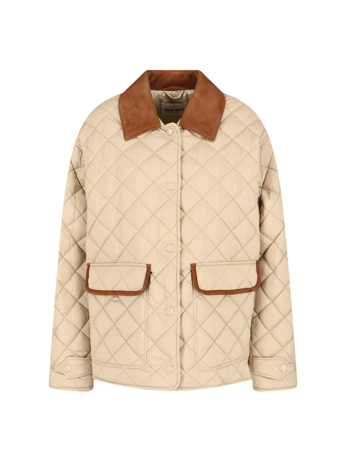 Miu Miu quilted jacket in beige fabric with brown corduroy collar, padded and quilted design, dropped shoulders, button closure, two front pockets, contrasting logo embroidery at the back, inner flat pocket, side buttons on the hem, straight hem.