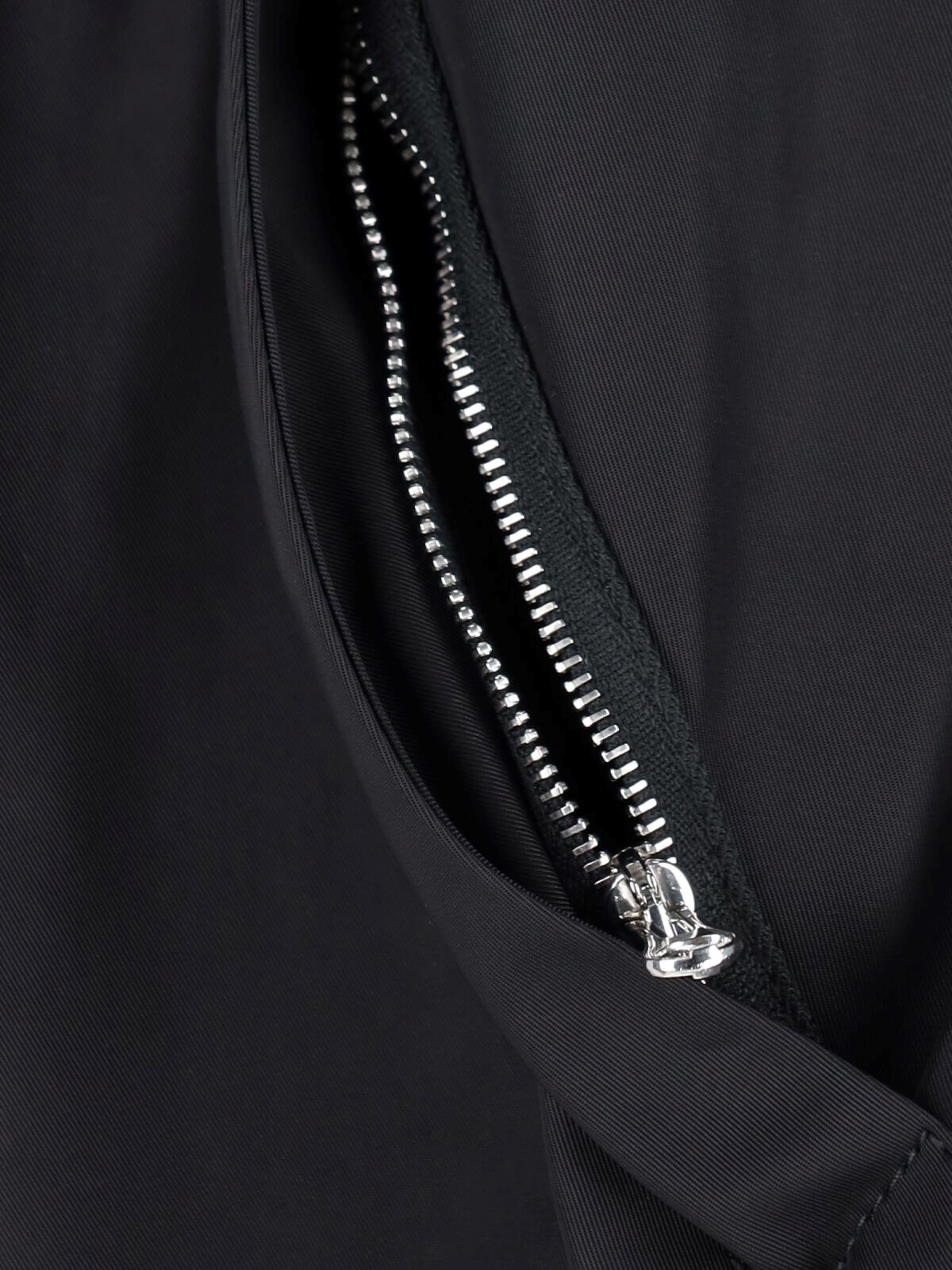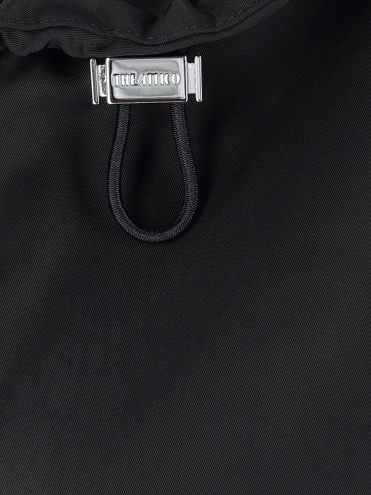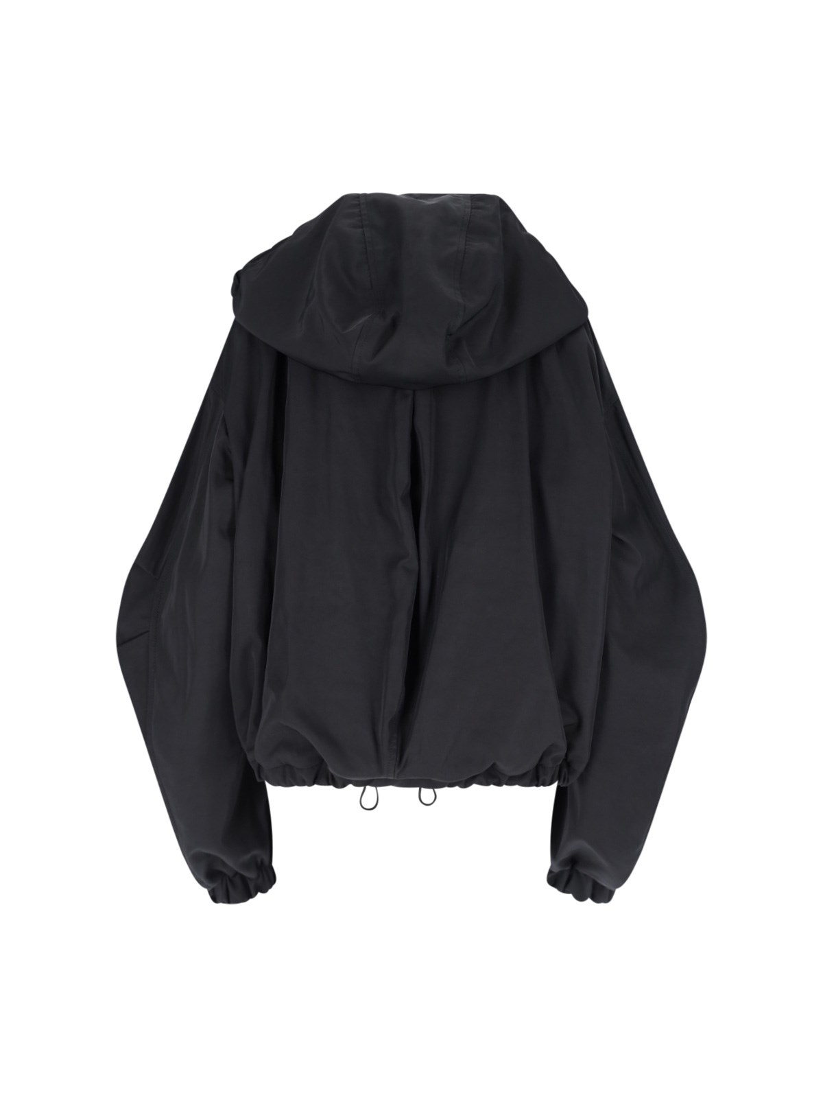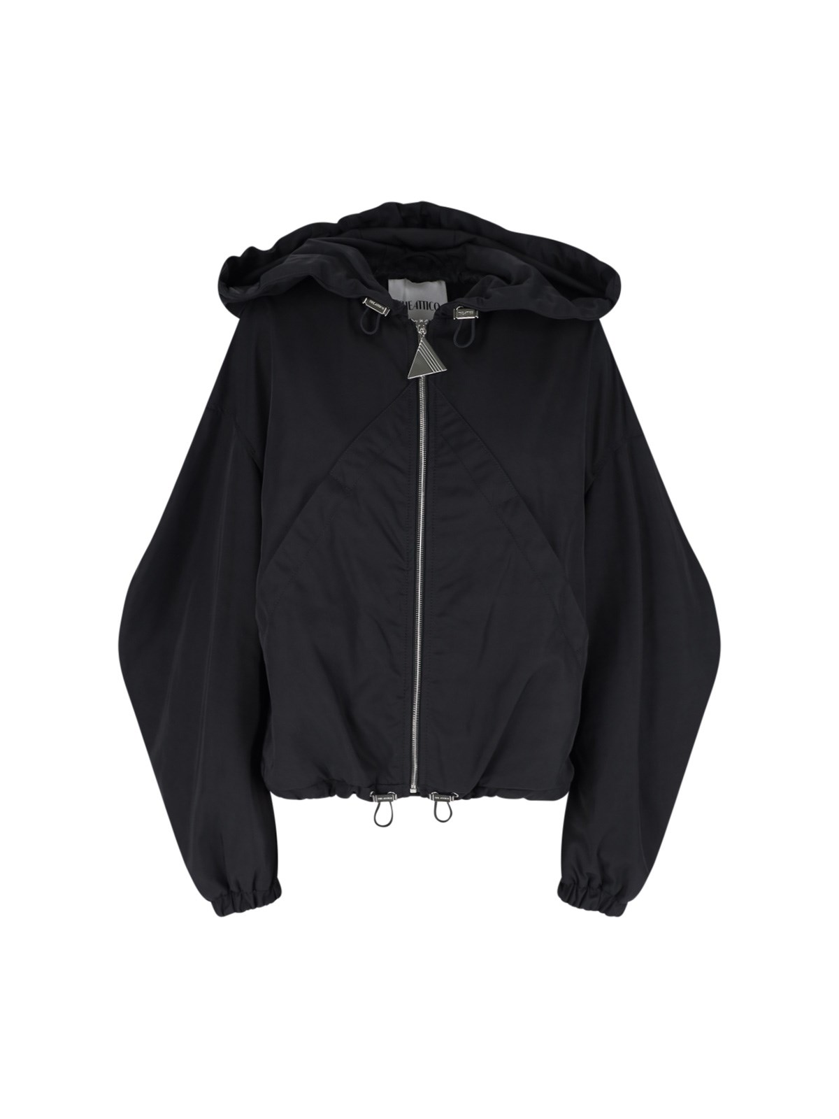 The attico black fabric zip bomber jacket, zip closure, adjustable drawstring hood, logo on the zip puller, long sleeves, adjustable drawstring at the waist, straight hem.