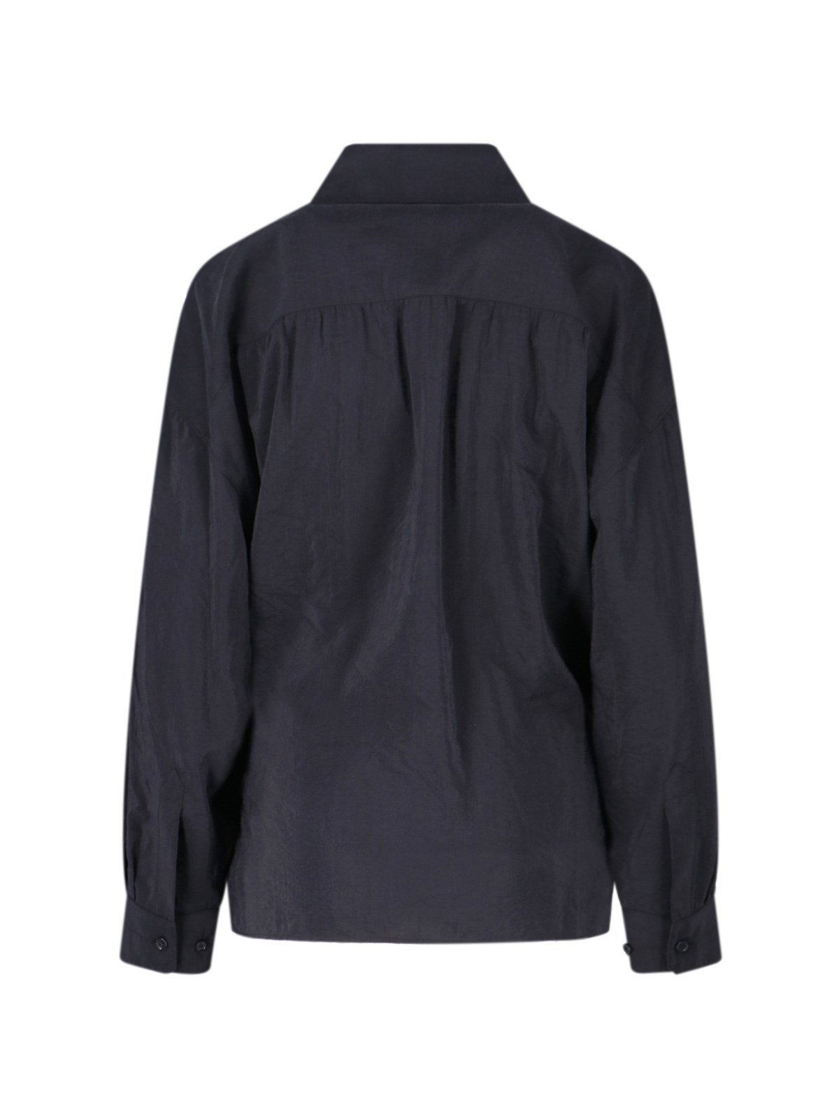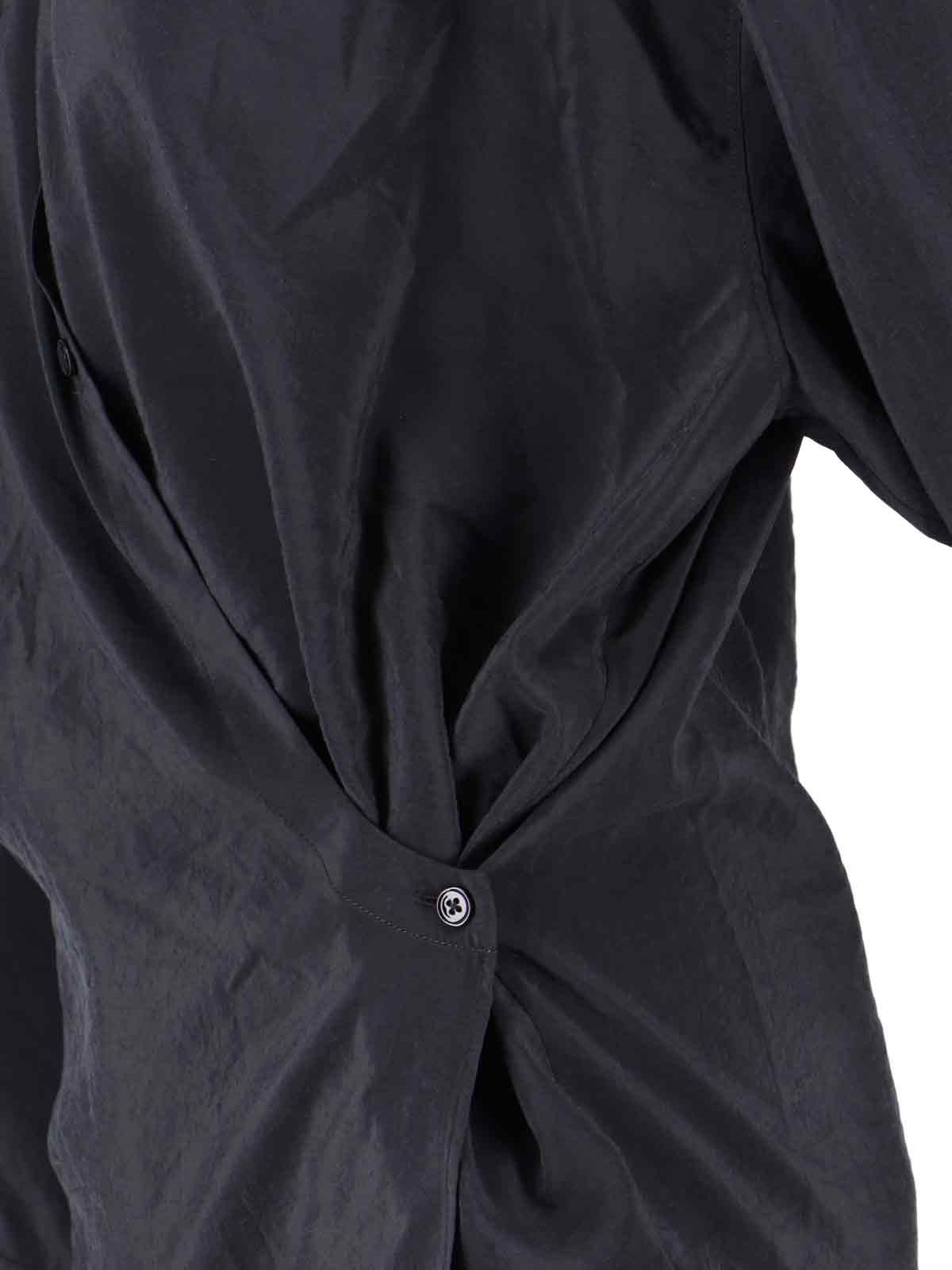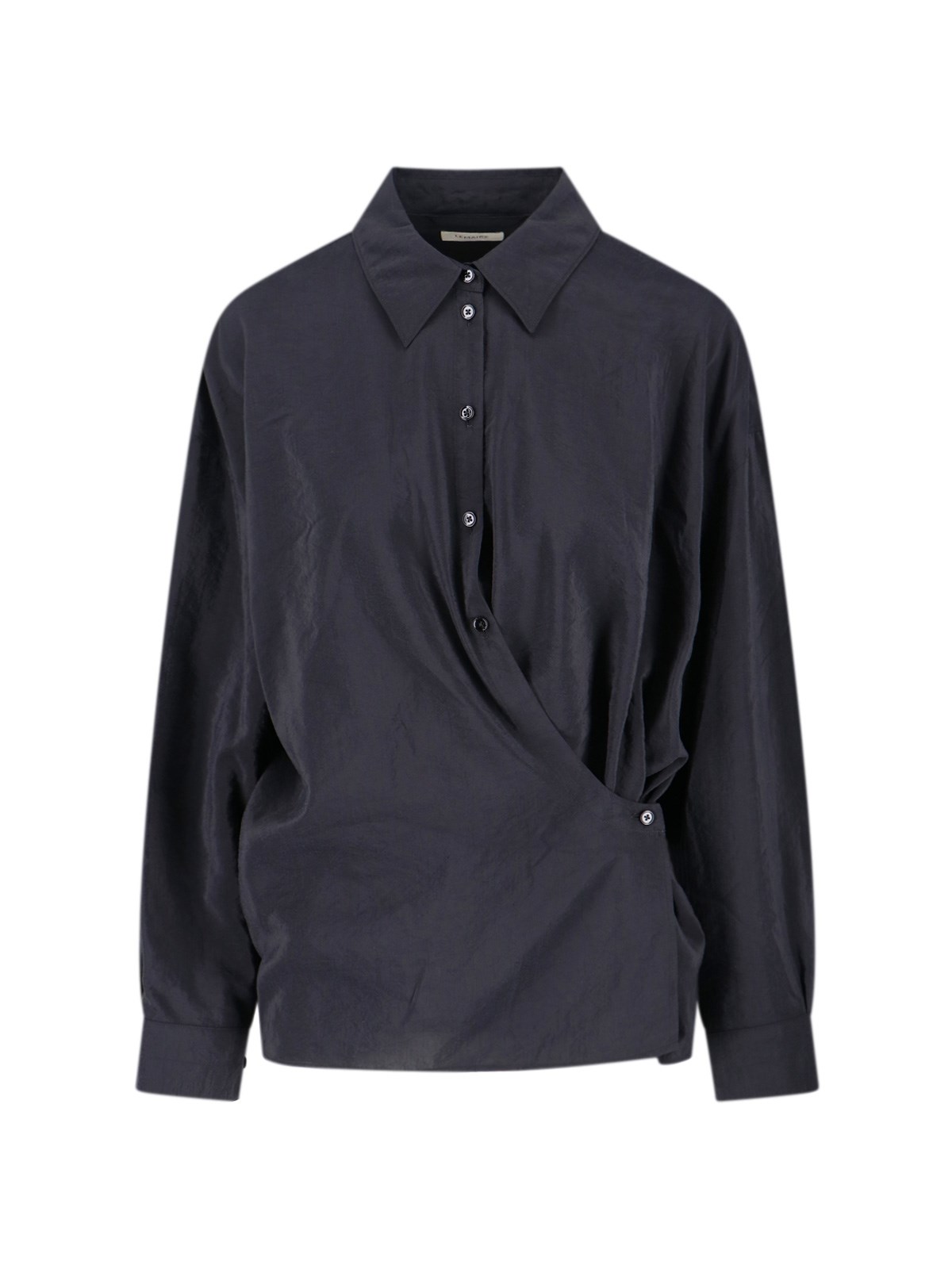 Lemaire draped shirt in black cotton and silk blend, classic collar, button closure with dropped shoulders, button cuffs, straight front hem and curved back.