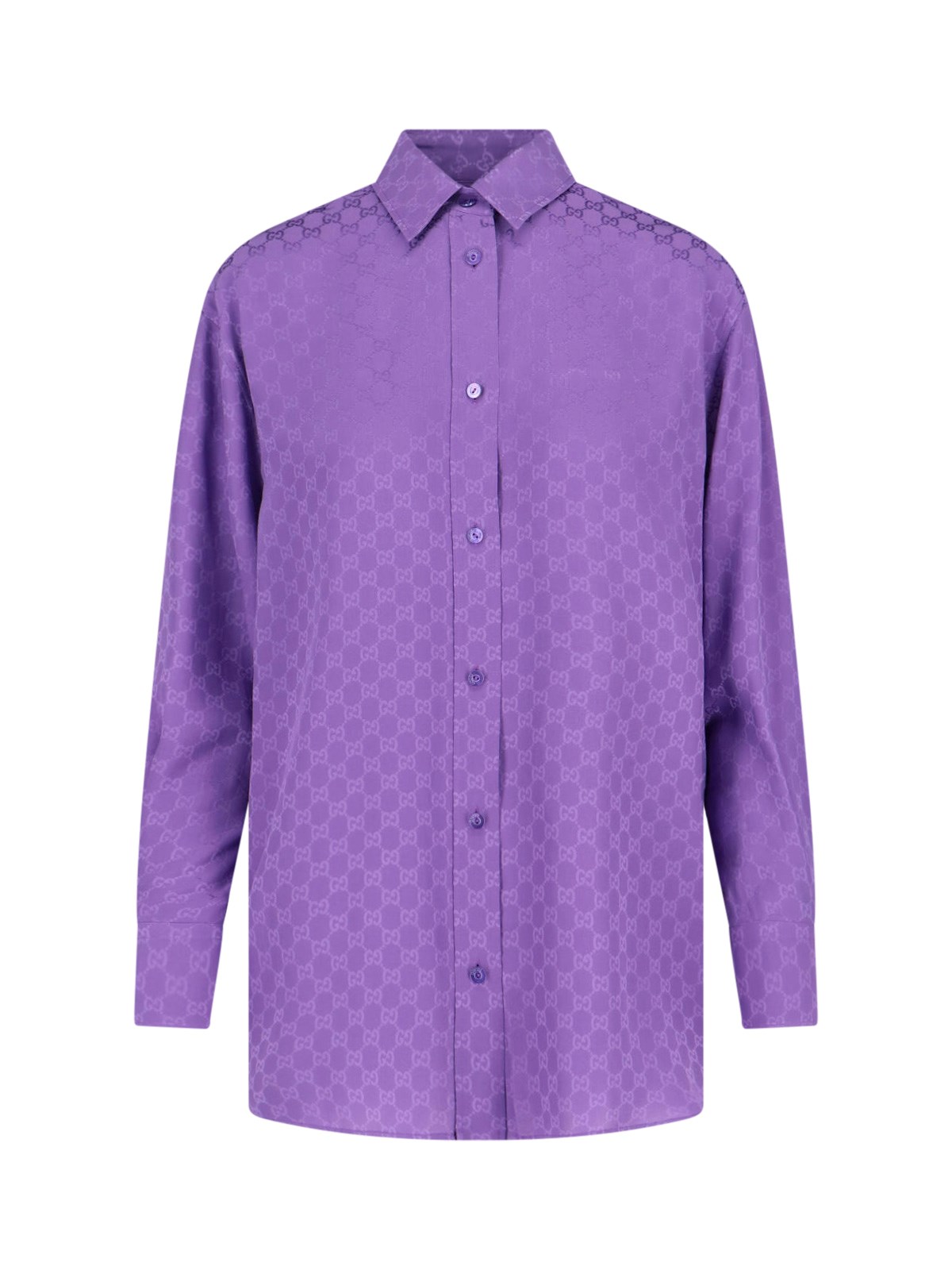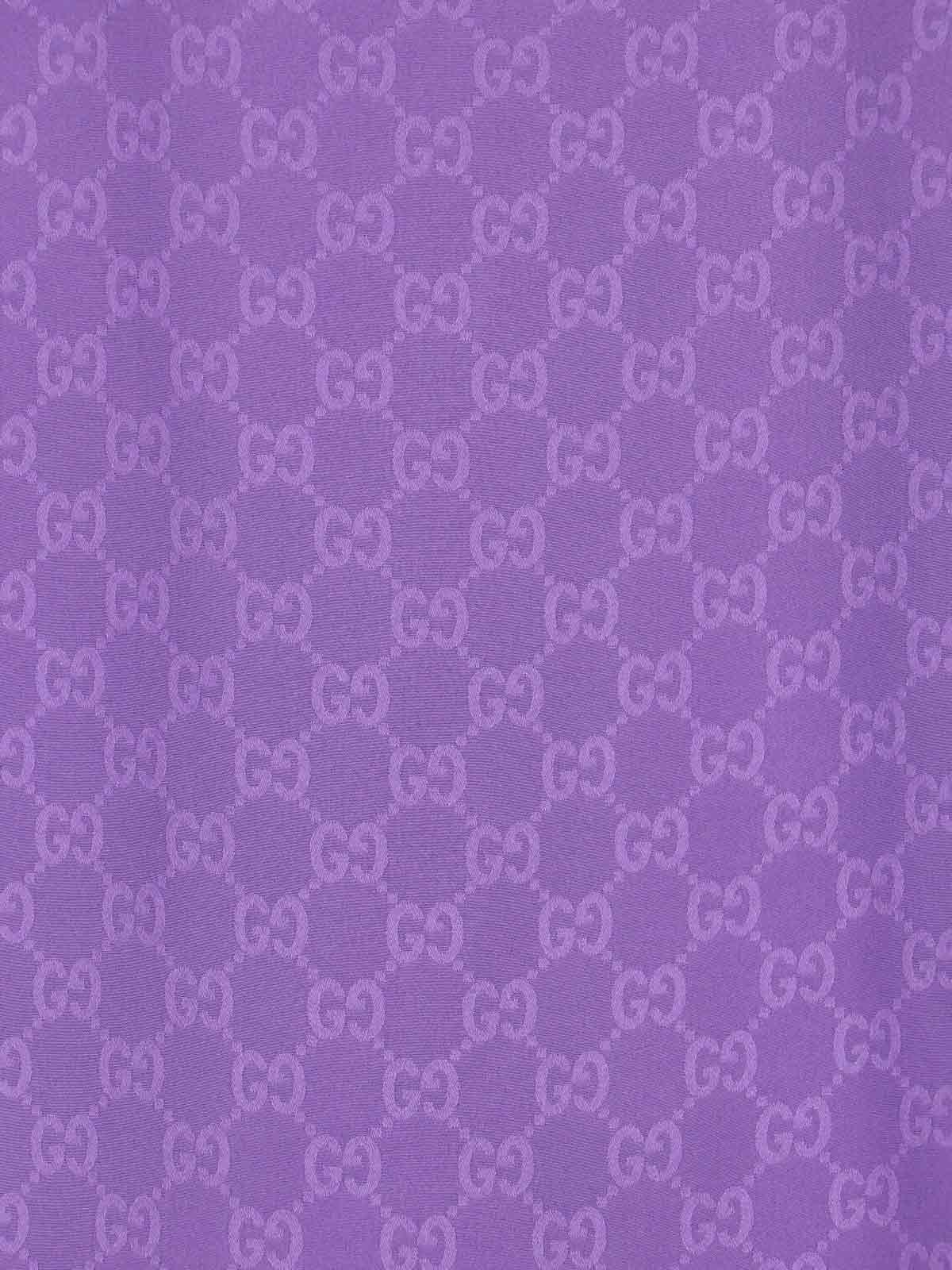 Gucci gg supreme purple silk shirt with all-over gg supreme logo pattern, classic collar, long sleeves, front button closure, button cuffs, curved hem.