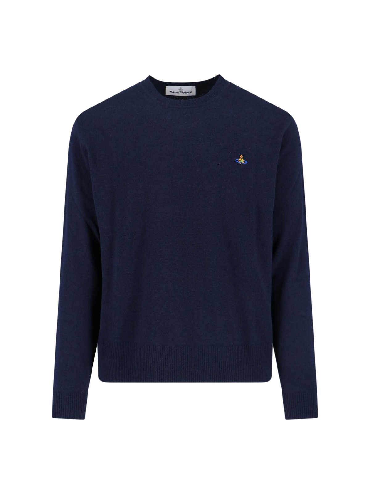Vivienne Westwood "alex" crew neck sweater in navy wool and cashmere blend with long sleeves, multicolor "orb" logo on the front, ribbed trims, straight hem.