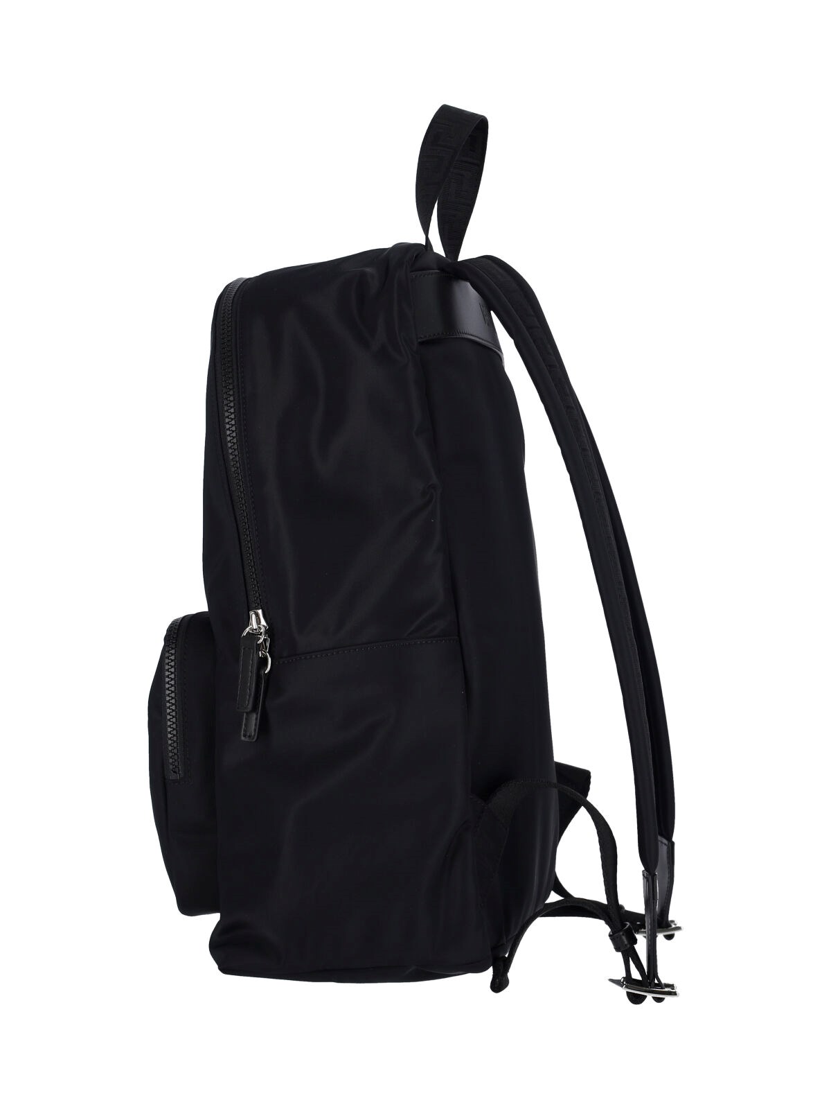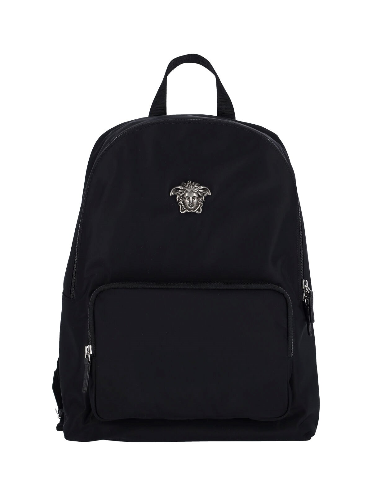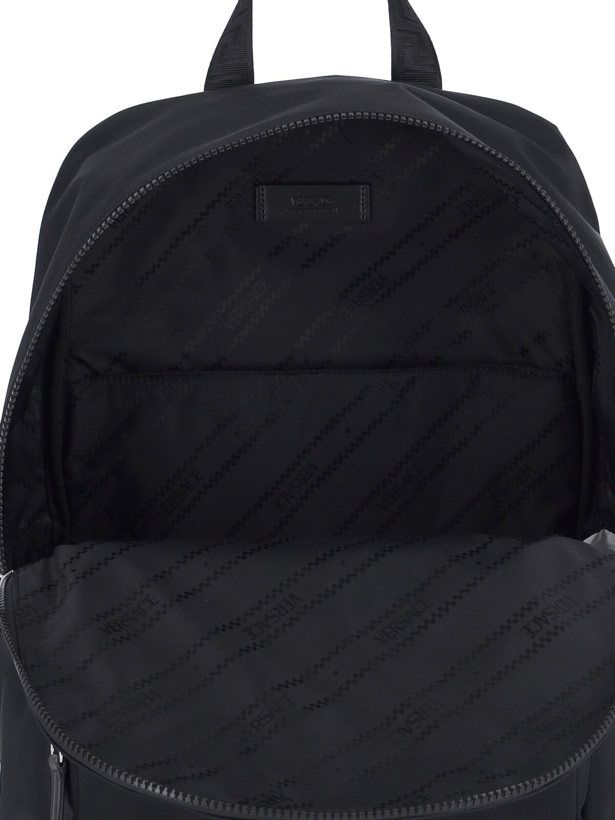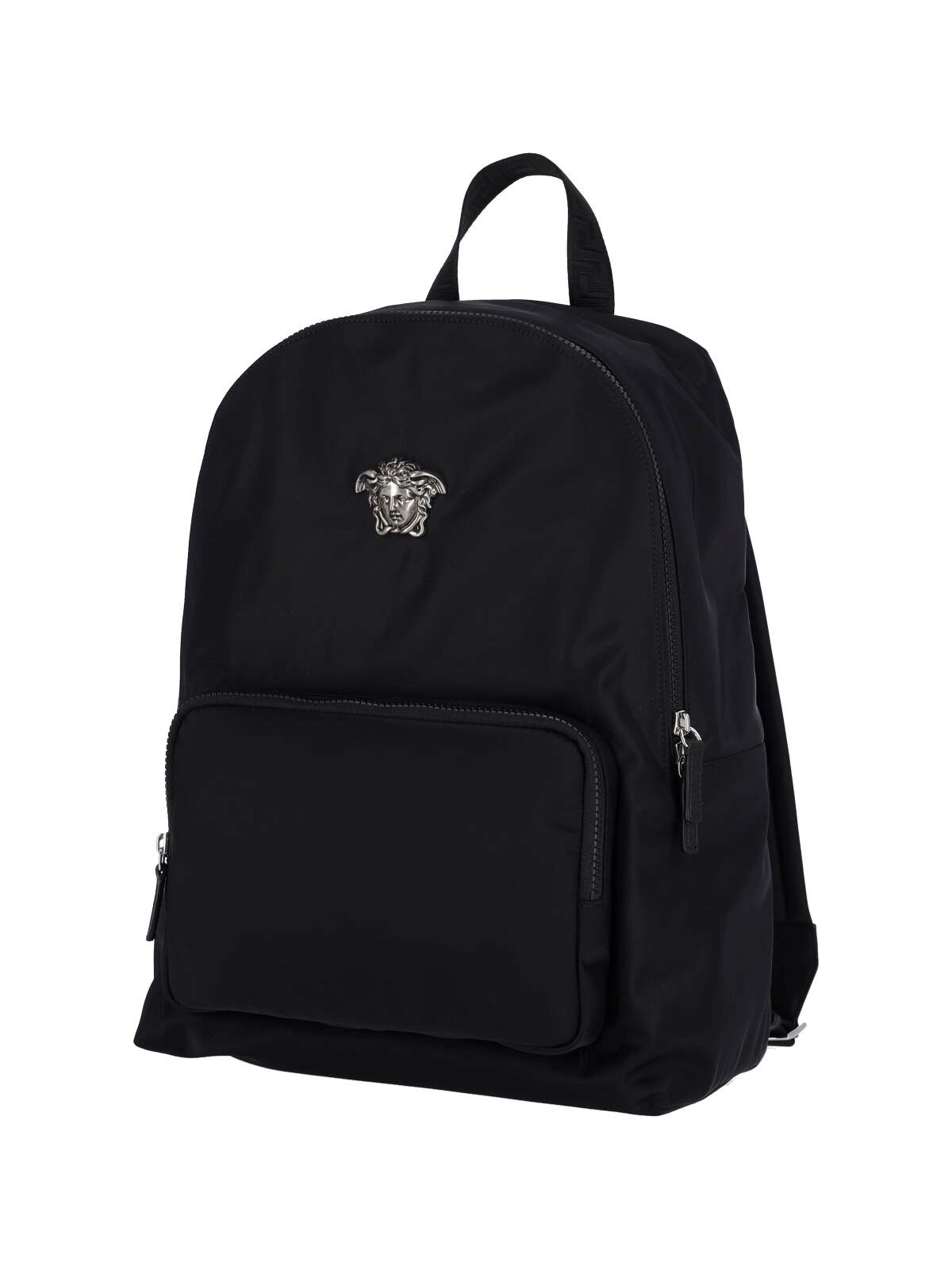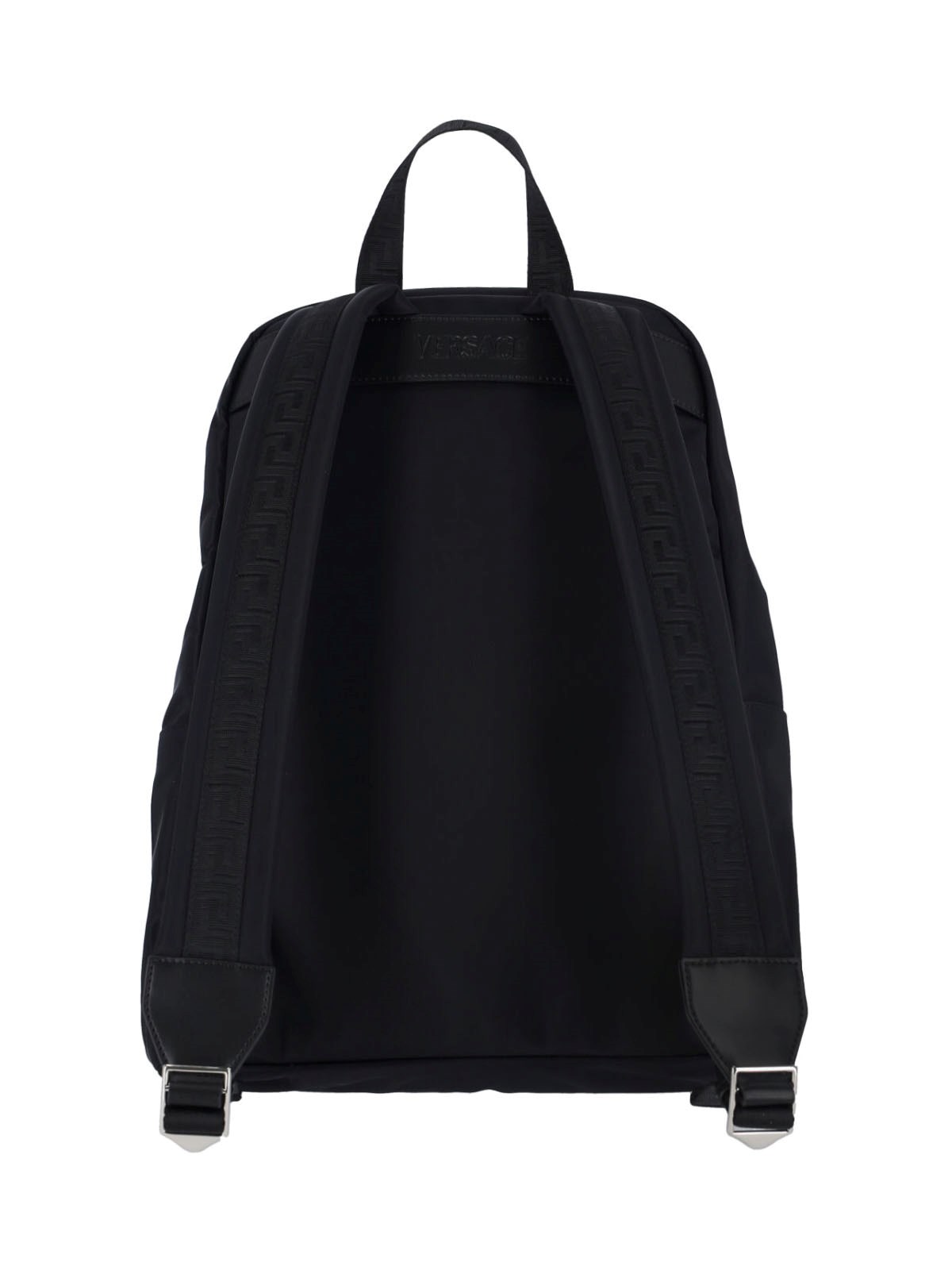 Versace "Medusa" black nylon backpack with handle, two adjustable shoulder straps at the back, "Greca" pattern, double zip closure, silver metal logo on the front, maxi front zip pocket, single inner compartment.