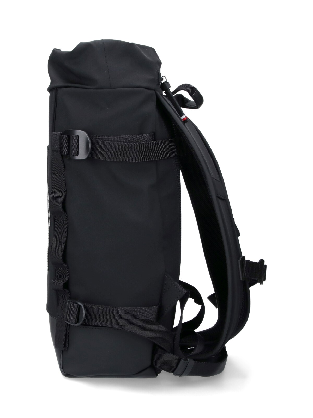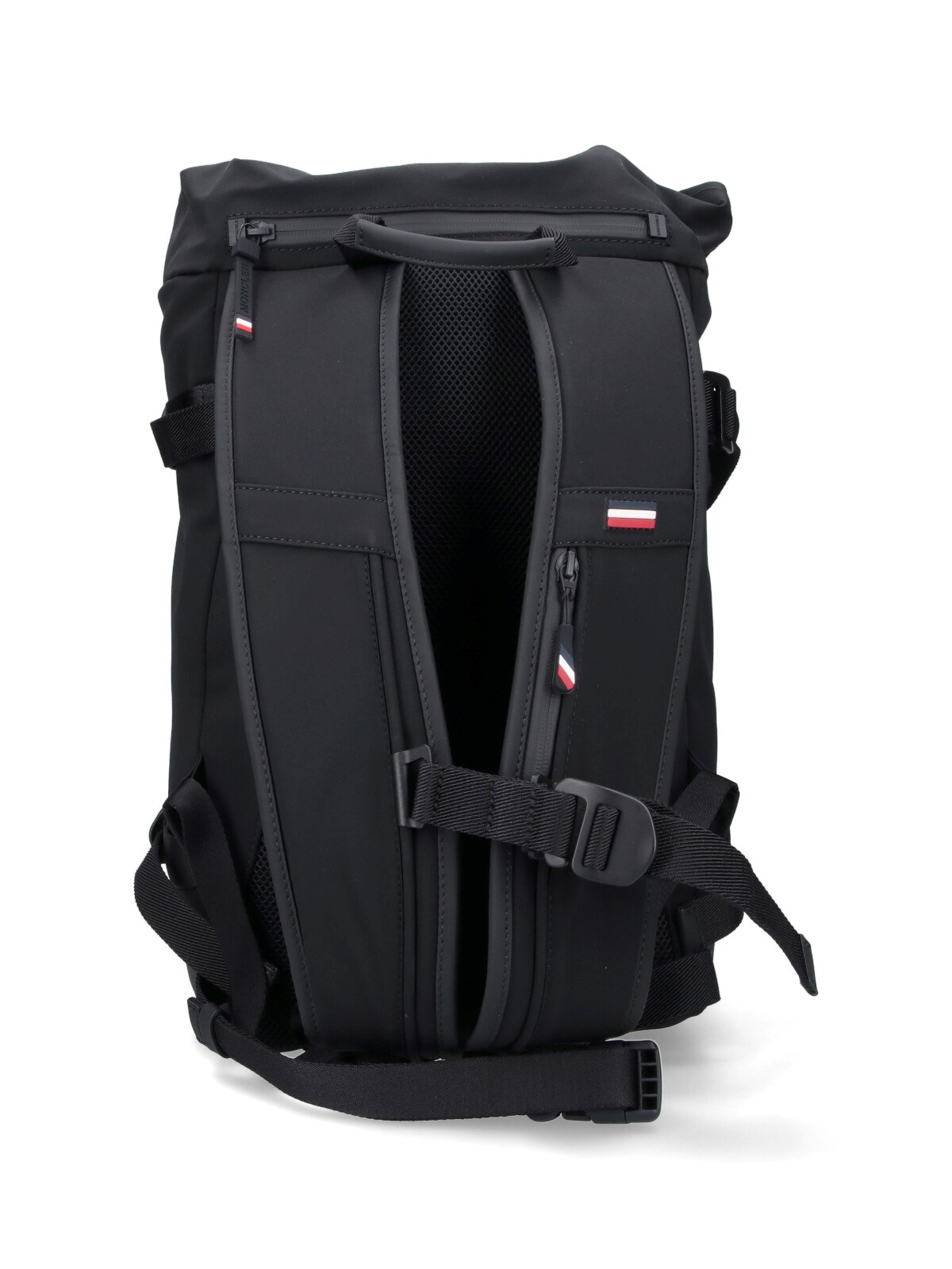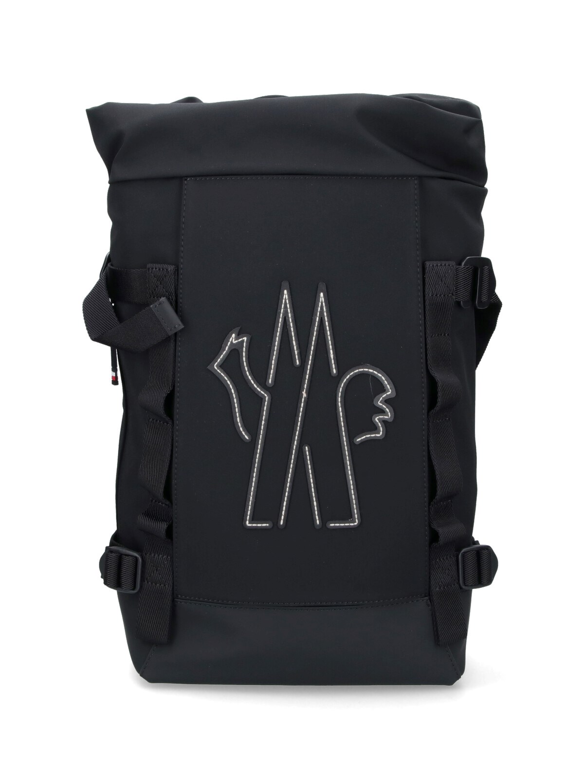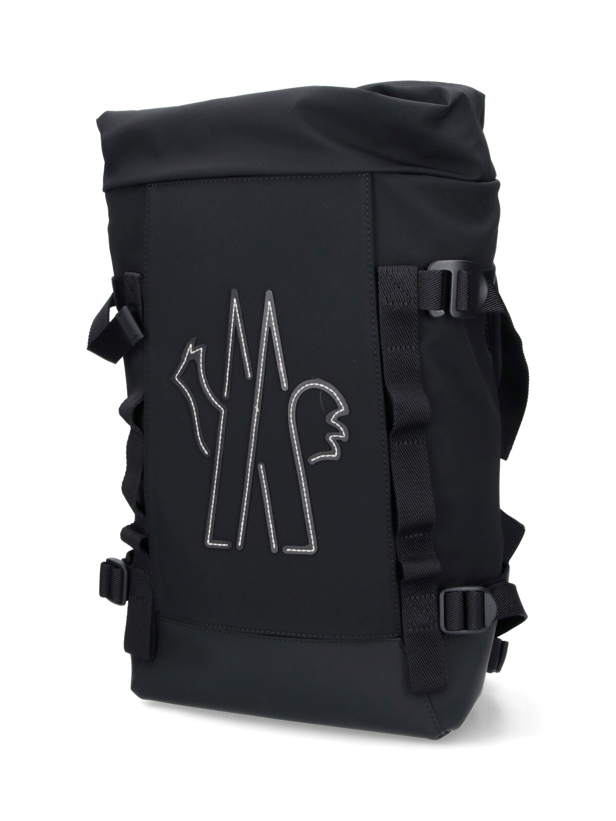 Moncler Grenoble "Ski" backpack in black fabric with top handle, adjustable shoulder straps, zip transcist detail, drawstring closure, contrast logo embroidery at the front, four adjustable side buckles, two side pockets, one back zip pocket, logo zipper detail, one inner zip pocket, one main inner compartment.