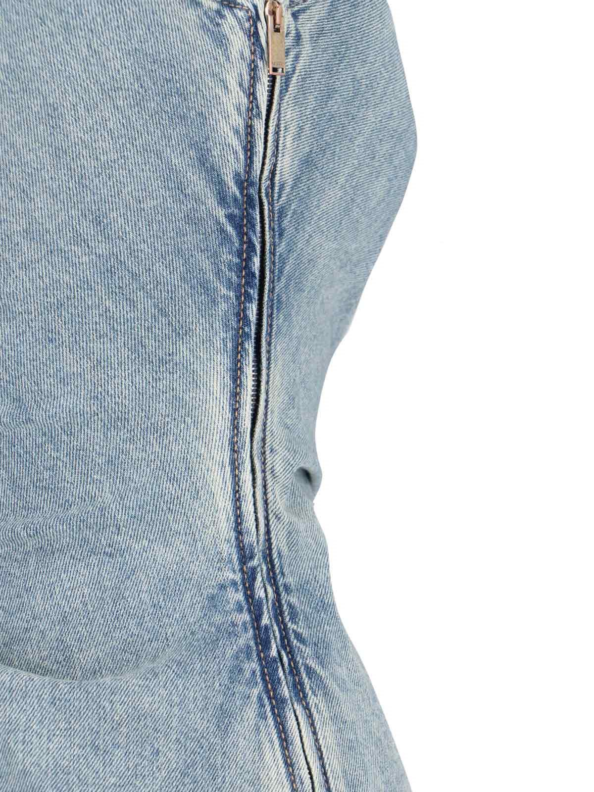 Alexander McQueen sleeveless midi dress in light blue cotton denim with side zip closure, front curled front, gold metal embossed logo button detail, and asymmetrical hem.