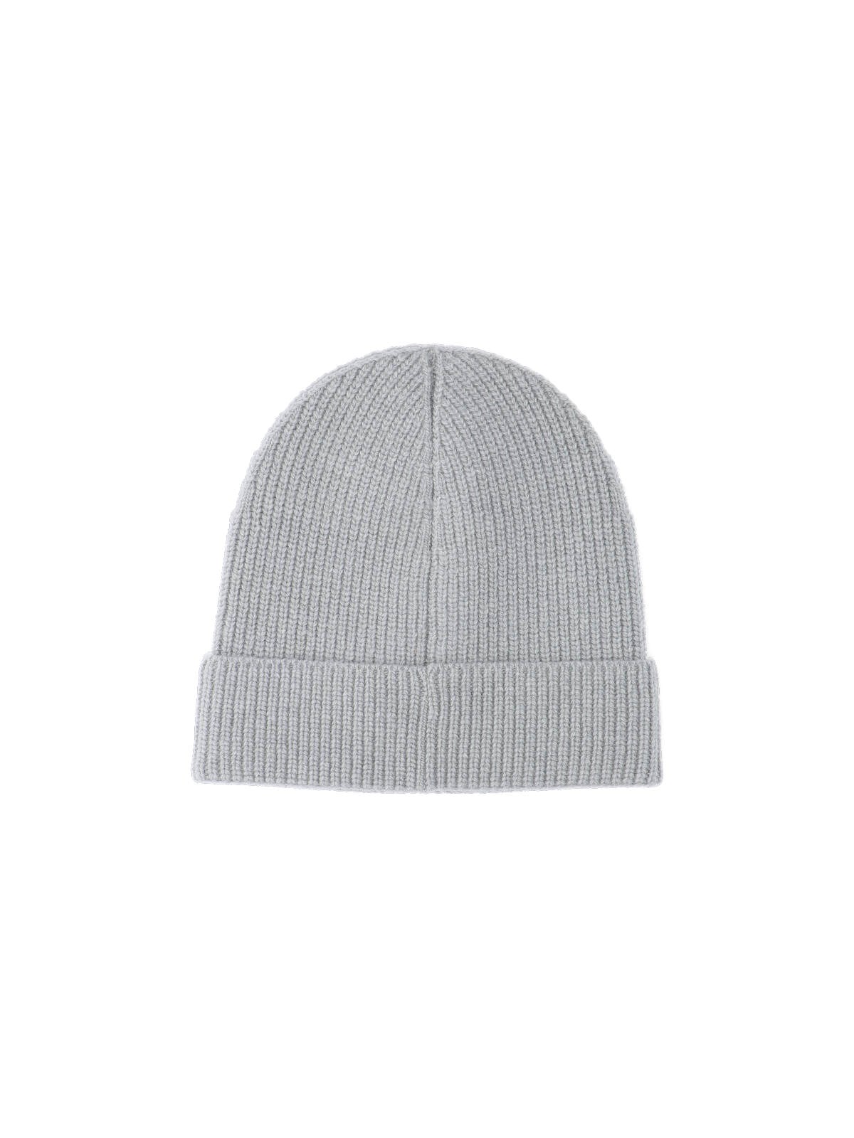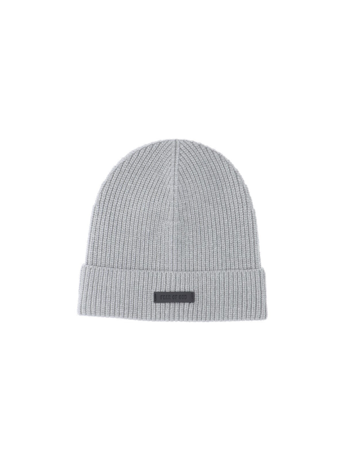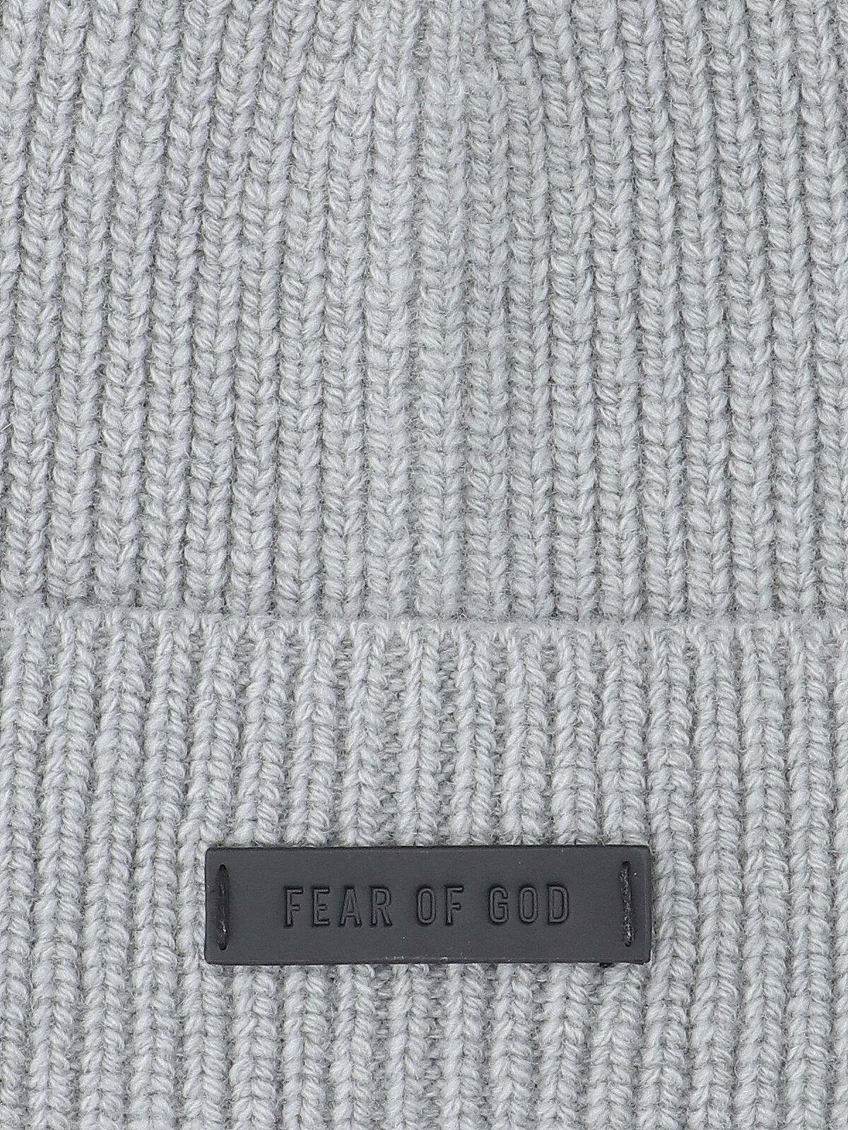 Fear of God ribbed merino wool beanie in gray pattern, contrast leather logo patch on the front.